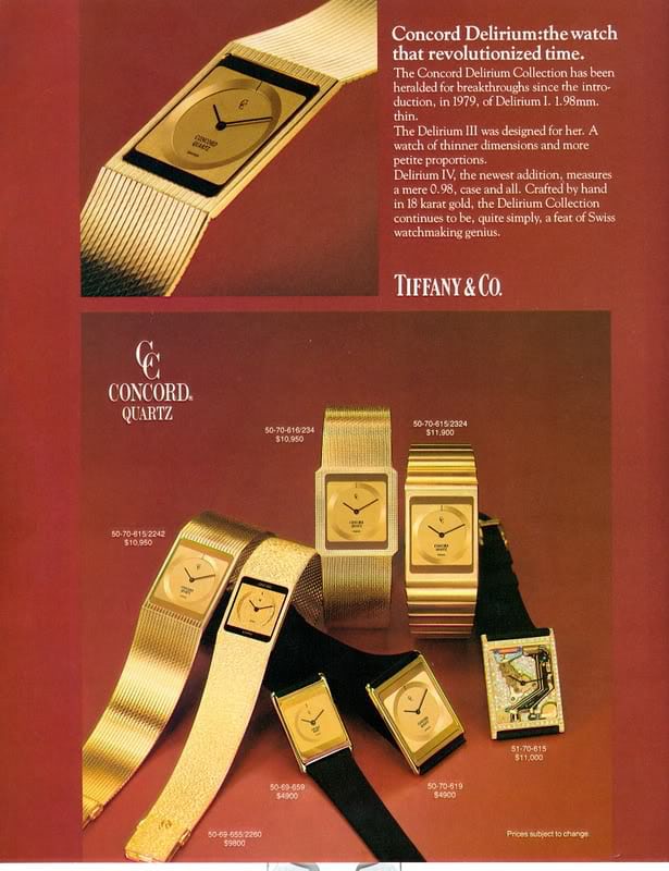 かつてコンコルドは、腕時計の世界でトップに立っていたか、それに近い存在だった。世界で最も成功した高級クォーツ時計メーカーの1角となったのは、おそらくクォーツ危機の頃である。ビョルン・ボルグやジョー・モンタナなどの著名人はもちろん、コンテンポラリーダンスの歌姫マーサ・グラハムなどの著名人もブランドアンバサダーとして名を連ねていた。コンコルド デリリュームは、1970年代後半に高級時計の真髄とされた、奇跡的な薄さのクォーツ時計で、ブランド最大の功績のひとつである。しばらくのあいだ、デリリュームはピアジェに匹敵するほどの価格で販売されていた。