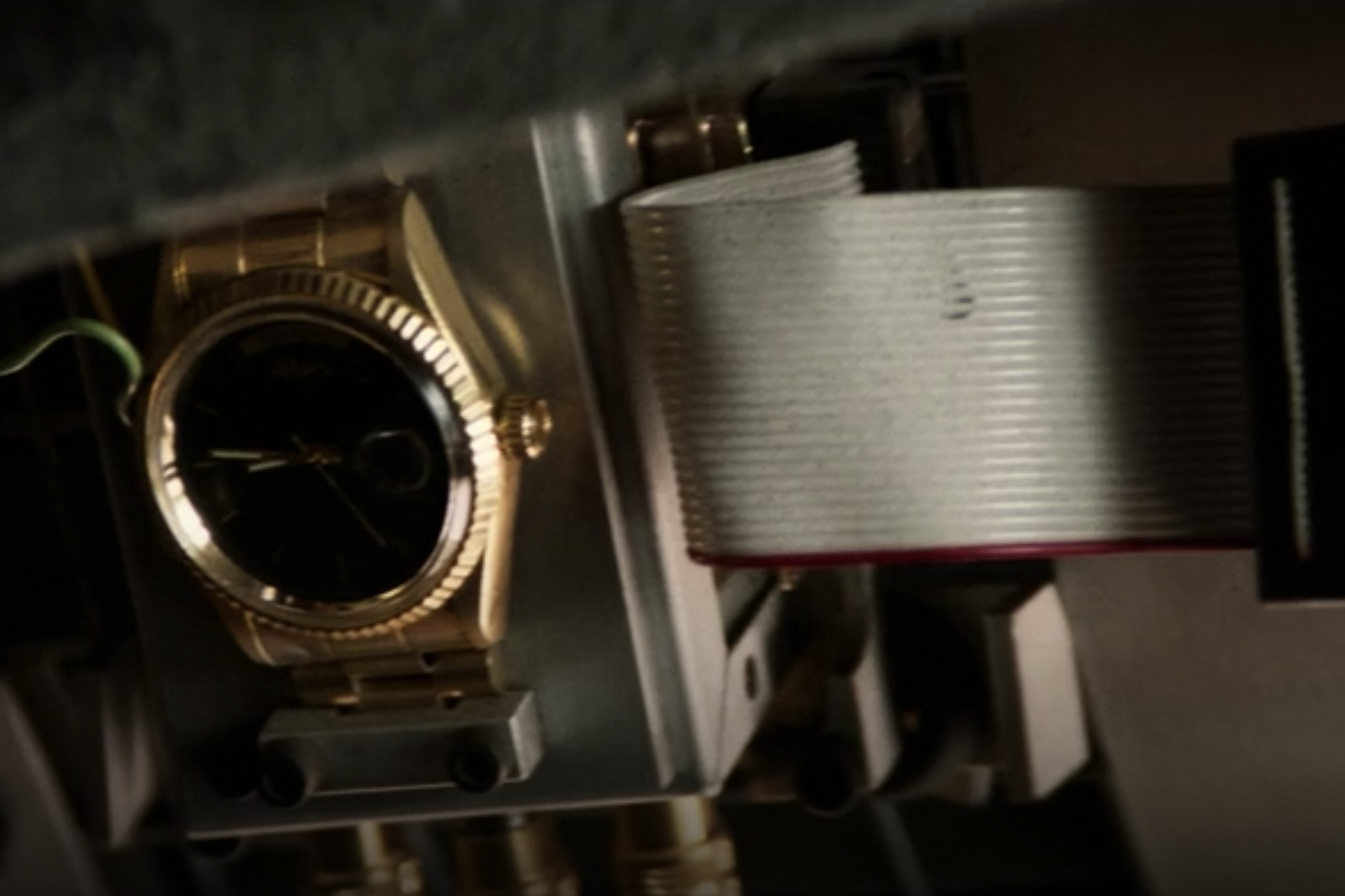 トラヴェンは爆弾を仕掛けたバスを追跡し、高速道路を走行中に乗り込む…。バスの運転手が誤射で撃たれた後、常連客のアニー(演:サンドラ・ブロック)がハンドルを握る。彼女がバス運転する間、トラヴェンはテンプルに電話をかけ、爆弾の特定と解除を依頼する。テンプルは床のハッチを開けてバスの下を覗き込み、見事に爆弾を見つけだす。爆発物だけでなく時限装置があり、そこには - 時計が - 付いていた [00:45:08]。ハリーは電話の向こうで「どんな時計なんだ?」と聞き、トラヴェンは「ゴールド……ゴールドのブレスレットで、かなり安っぽい」と答える。その時計は、ゴールドのロレックス デイデイト(通称“プレジデント”)のようにも見えるが、よく見ると(そして写真を編集すると)、ブランド不明の類似品であることがわかる。これは、映画の序盤で語られていた金の時計の話を意識したものであることは間違いない。ひとつ確かなことは、その時計が爆弾であるということだ。