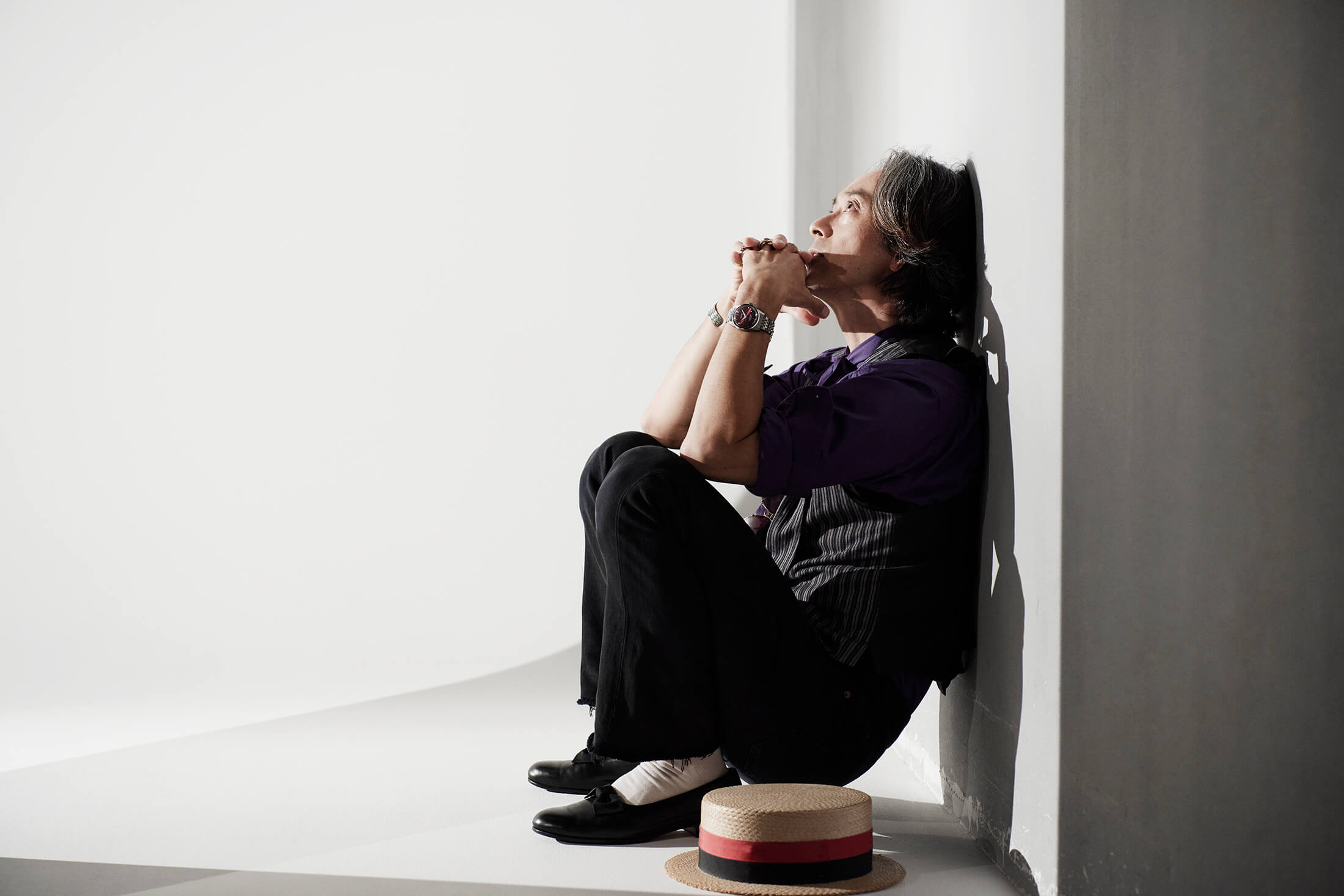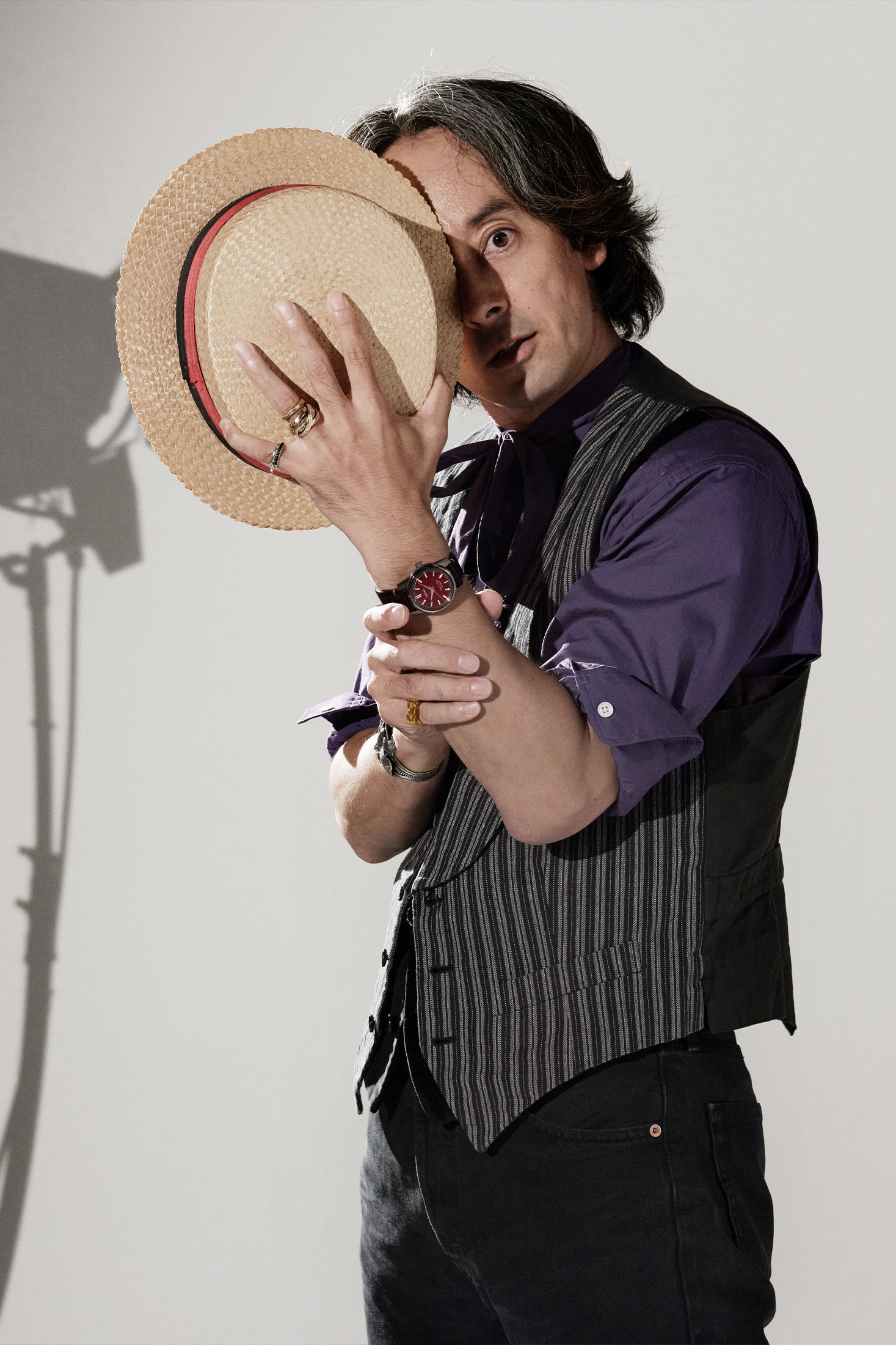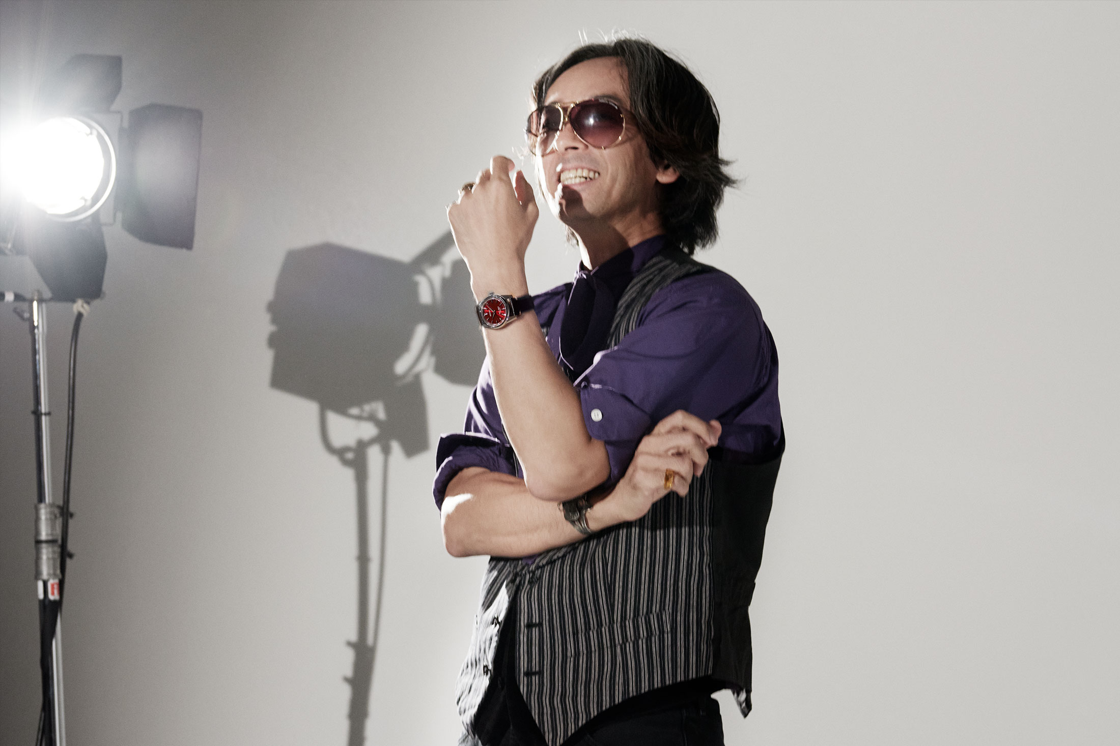 それはキングセイコーにも通じるのだろう。時計を腕に、独自のコーディネートでカメラの前に立った。リボンタイのアクセントをつけたパープルのドレスシャツとシックなベスト、パンツはブラックジーンズの裾を自らカットしている。ヴィンテージとモダンが絶妙に溶け込む、滝藤さんらしさを感じさせるスタイルだ。