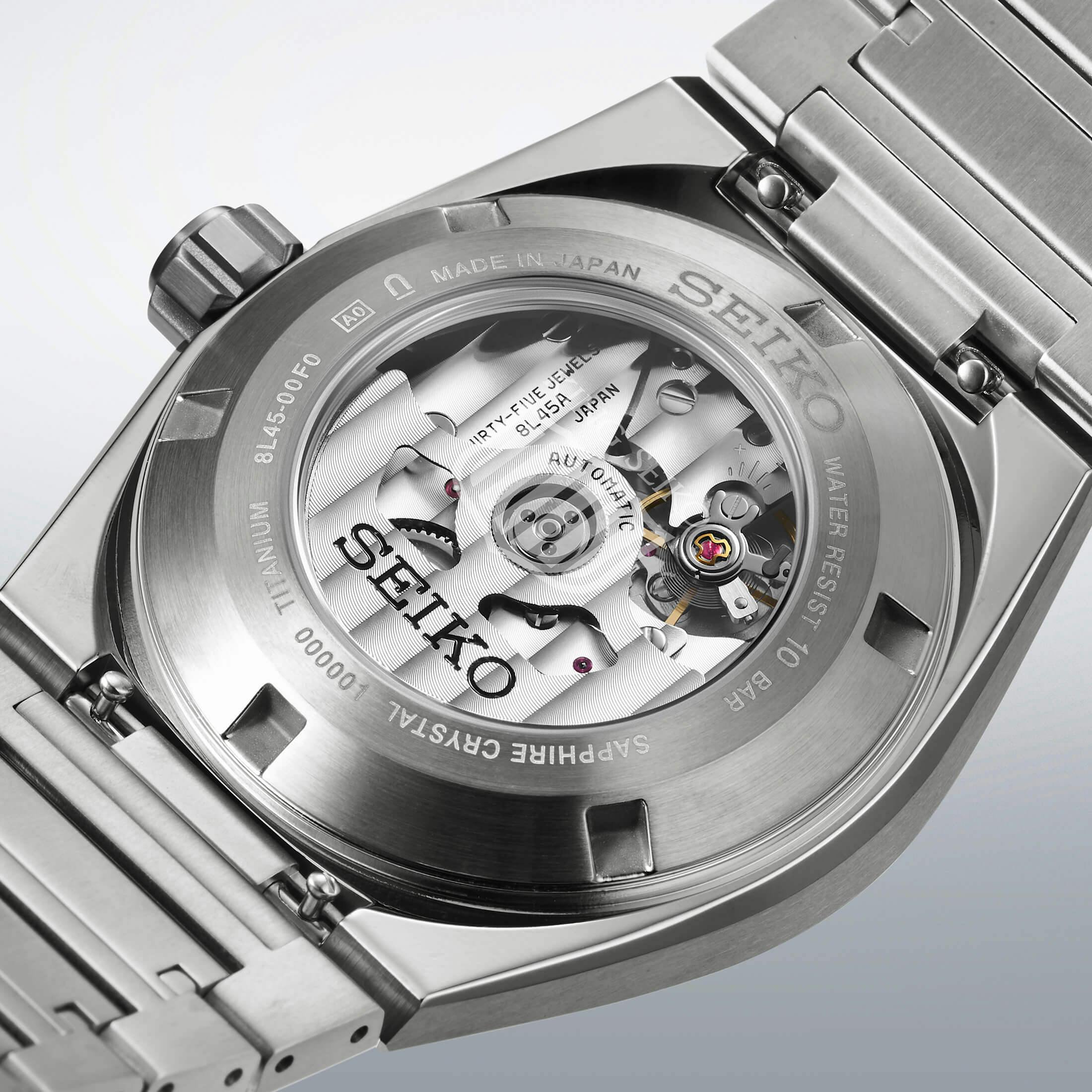 ケース径は41mm、厚さは14.3mm。防水性は日常生活用強化防水(10気圧)であり、基本スペックは既存のSSモデルと同じだ。また、ムーブメントには自動巻きCal.8L45を搭載。日差+10秒〜−5秒の安定した精度と約72時間のパワーリザーブを誇り、優れた堅牢性も提供する。さらに回転錘や受けに施された波目模様をシースルーバックから鑑賞できる点など、これもSSモデルと変わらない。