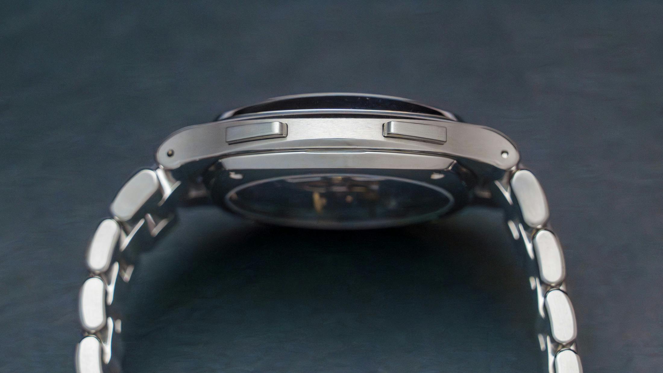 ケースはグレード5チタン製で、直径42mm。一体型ブレスレットを備えたスポーティな外装ながら、ケースシェイプはブランド特有の柔らかな曲線を保っています。なおスポーツ・オートと比較して直径・厚みともに0.5mm拡大されていますが、装着感においてその差を強く感じさせない点も特徴です。