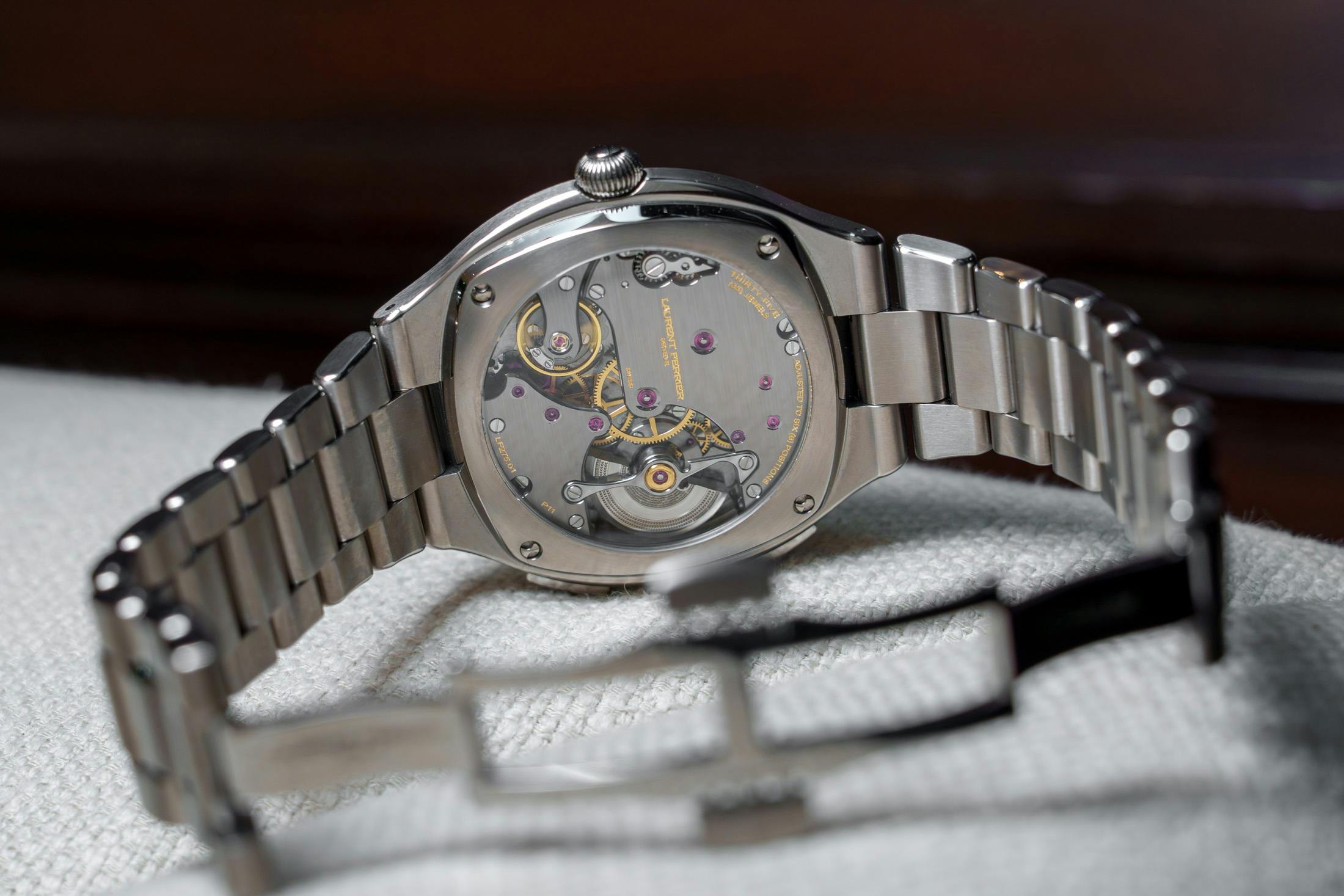 仕上げは同社らしく高水準で、手作業による面取りやブラックポリッシュが施されています。また、マイクロローターにはルテニウム処理を施した水平サテン仕上げが与えられており、視覚的なコントラストも意識されています。ローラン・フェリエ スポーツ・トラベラーの価格は税込1199万円です。