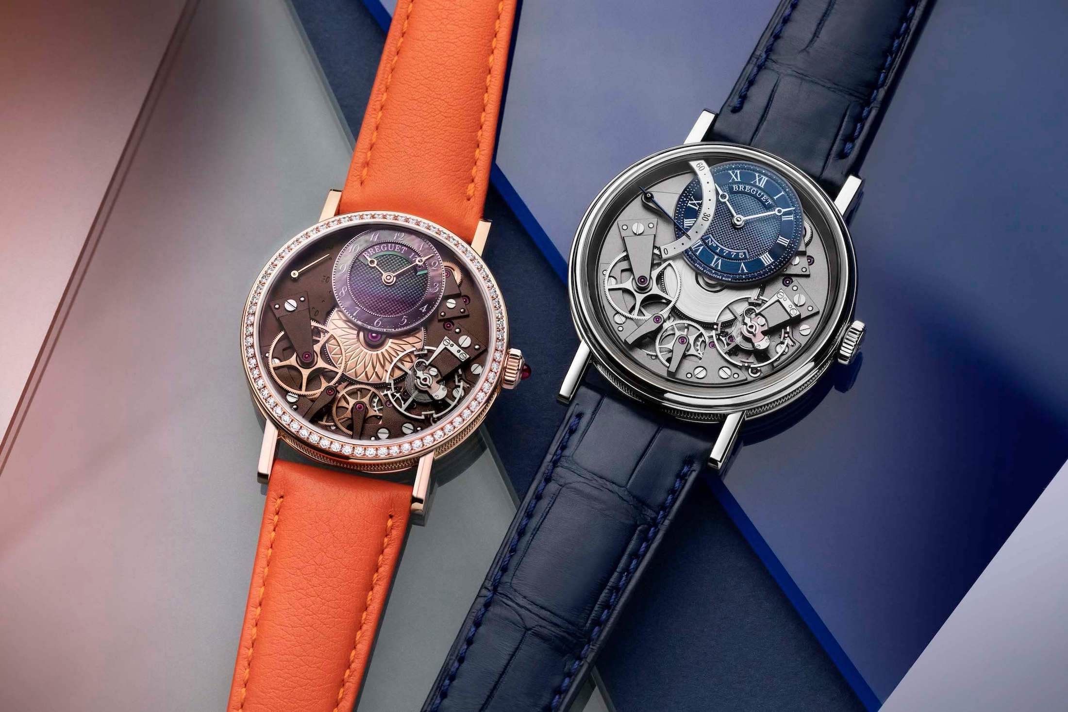 今年発表され話題を呼んだブティック限定モデル。かつてのスースクリプションからインスパイアされた、シンメトリーな輪列配置が特徴。(右)トラディション オートマティック レトログラード セコンド 7097 391万円(税抜)(左)トラディション レディ 7038 431万円(税抜)。
