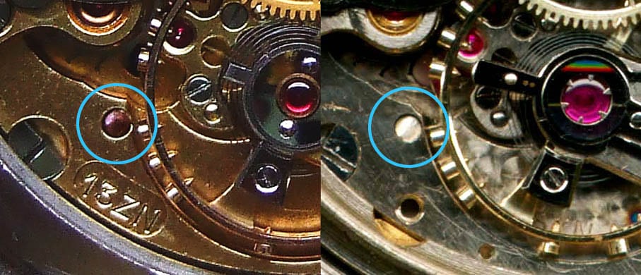 その他に重要なのは、ムーブメントに刻印されたシリアル番号がケースに刻印されたものと一致するか確認することである。下の2枚の画像では赤く囲んだシリアル番号が一致していることが読み取れるだろう。