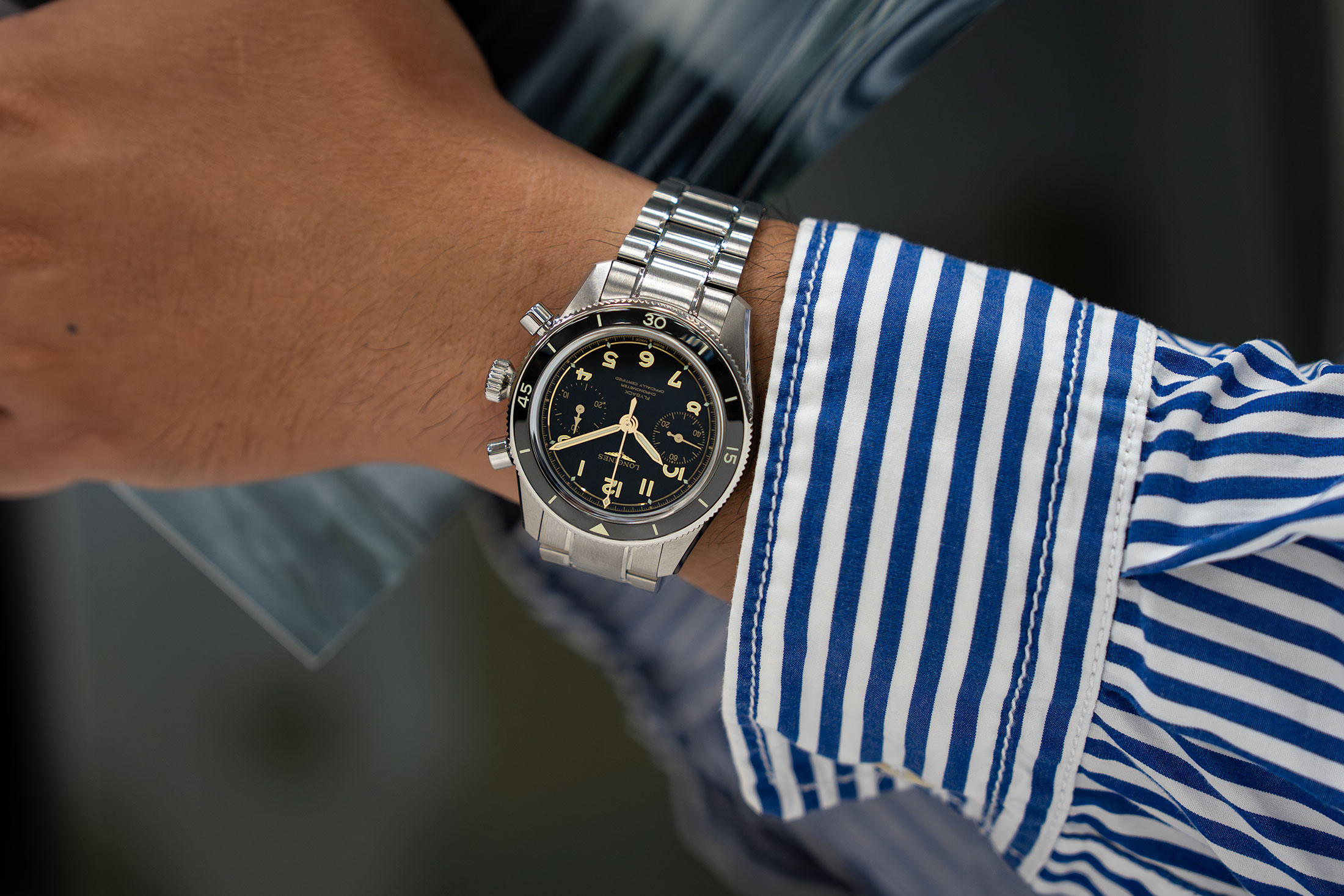 なお、今回のリリースに際して、実際に手首に乗せて試す機会を得た。特にフライバック クロノグラフは、そのサイズや機能など既存のフライバックモデルからの変更点が多かったので、きちんと触る必要があると思っていた。そして新作を装着してまず感じたのは、実用性の底上げである。直径が40mmを切ったことも効いているが、厚みが3.6mm抑えられたことで重心が下がり、装着バランスは格段に良くなった。本作の小型化は、ゴールド色のインデックスやボックスクリスタルの採用と同様、手巻き化に伴うクラシックデザインの一環だと思われるが、その結果が装着性の向上に直結している。また、手巻き式の時計としての巻き心地も僕の好みだった。チキチキと確実に巻き上げている感触はあるものの、主張は強くなく、わざとらしさがない。実際に装着していた時間は10分にも満たないものだったが、あくまで本作をロンジンがデイリーユースの時計として仕上げているように感じられた点に好感が持てた。