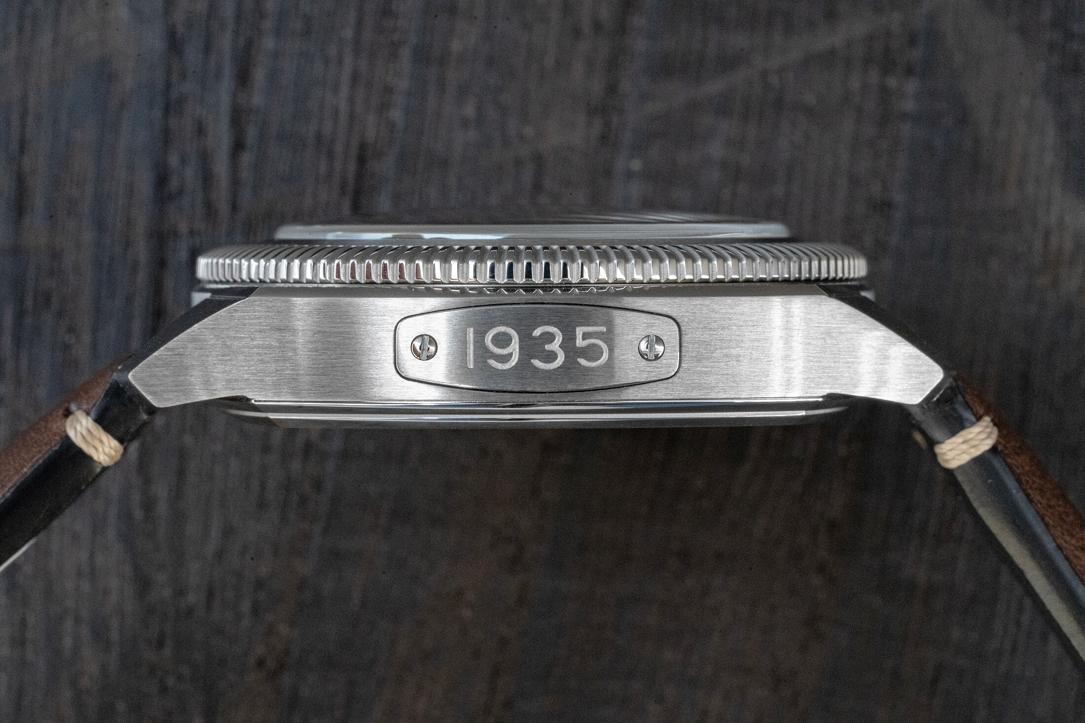 新作にあって、オリジナルにはないもの。その最たる例がリューズガードだろう。ロンジン パイロット マジェテックはリューズガードを備えることで、より一層タフな作りとなり、見た目にも力強い印象を与えている。ケース厚は見た目のボリューム感を裏切らない13.3mm。風防はボックス型のサファイアクリスタルを採用する(ちなみに、オリジナルは外周から中央にかけてなだらかに盛り上がるドーム風防だ)。そして9時位置のケース外側には、初代モデルが誕生した年である“1935”を刻む記念プレートが施された。