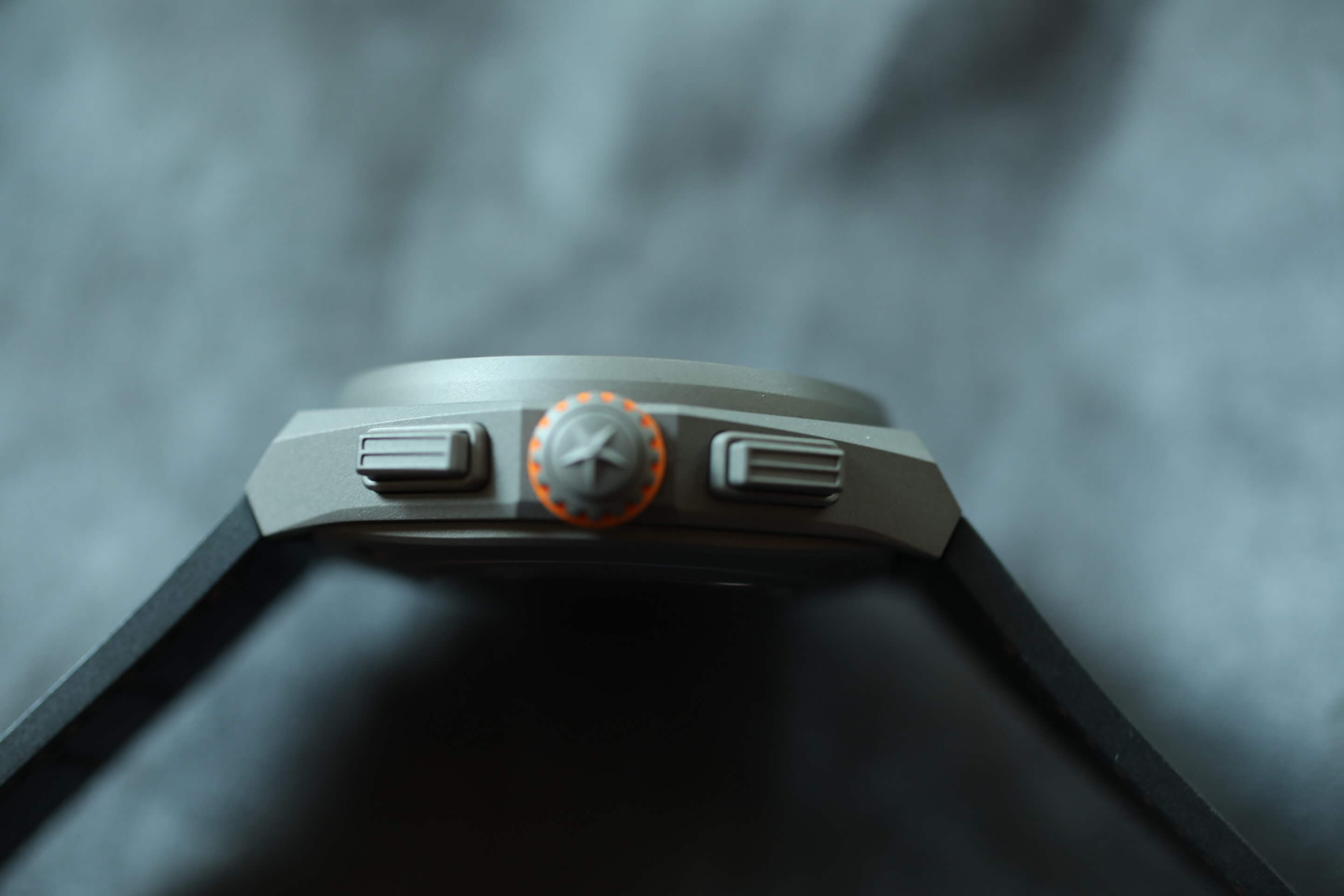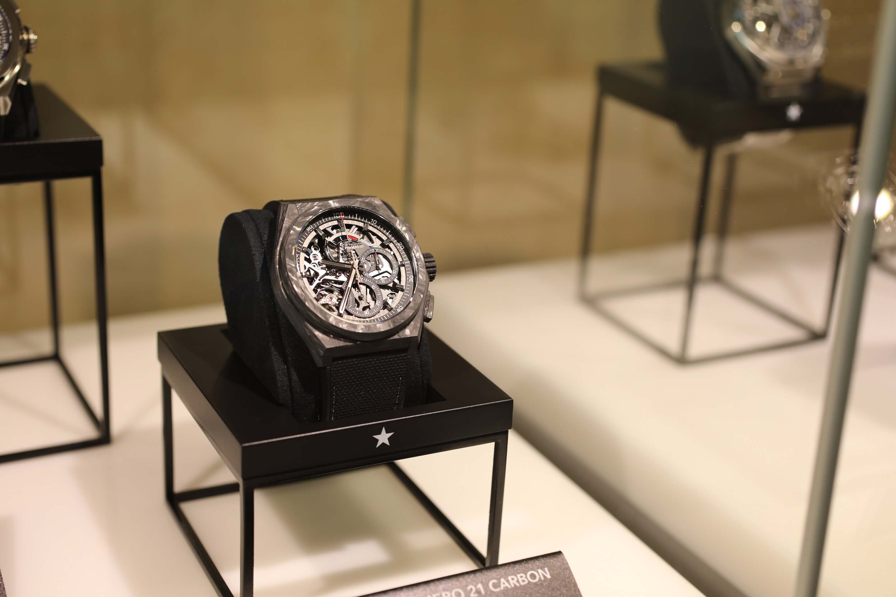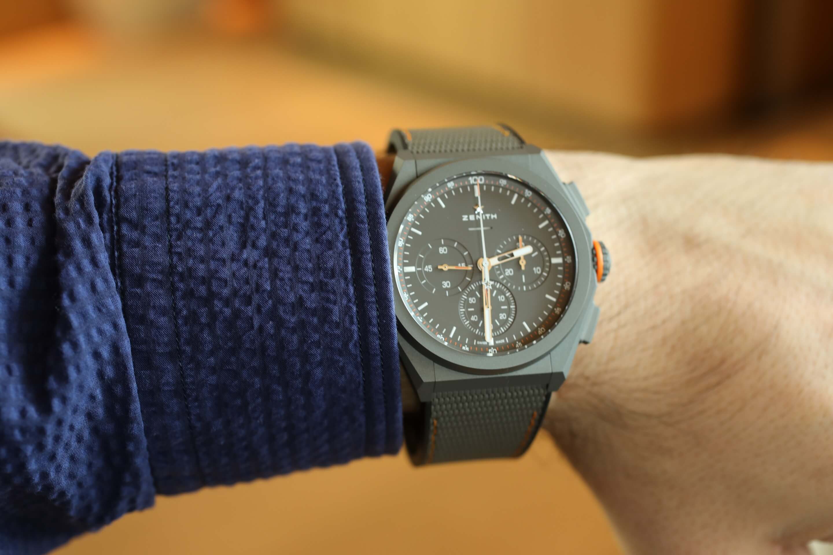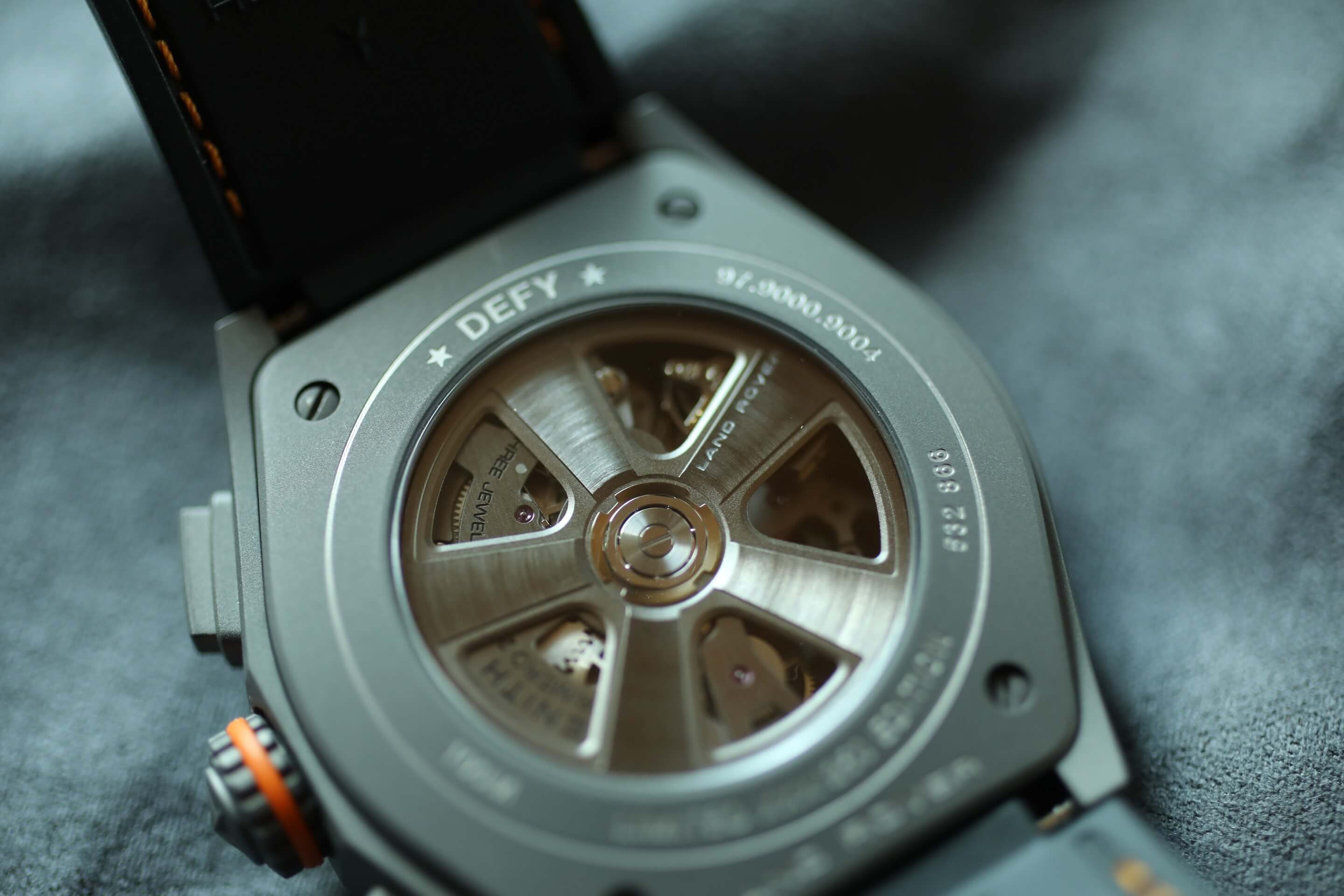 個人的な好みとしては、これまでのデファイ21のイメージからやや離れたデザインのランドローバーモデルが好印象。名車ランドローバー・ディフェンダーの新型の意匠を表現したという本機は、チタンケースにゼニス初となるマイクロブラスト加工が施されており、非常にマットな質感が特徴だ。それでいて軽い。タフでありながら機動性に優れるデフェンダーのイメージそのままだ! と実機を見て僕は膝をうった。余談だが、ローバーのロゴはローターのブリッジ部分に密かに配されているだけというのも、時計自体が尊重されていて好感を持った。147万円で世界250本限定となるので、実際にお目にかかれる機会は多くなさそうである。