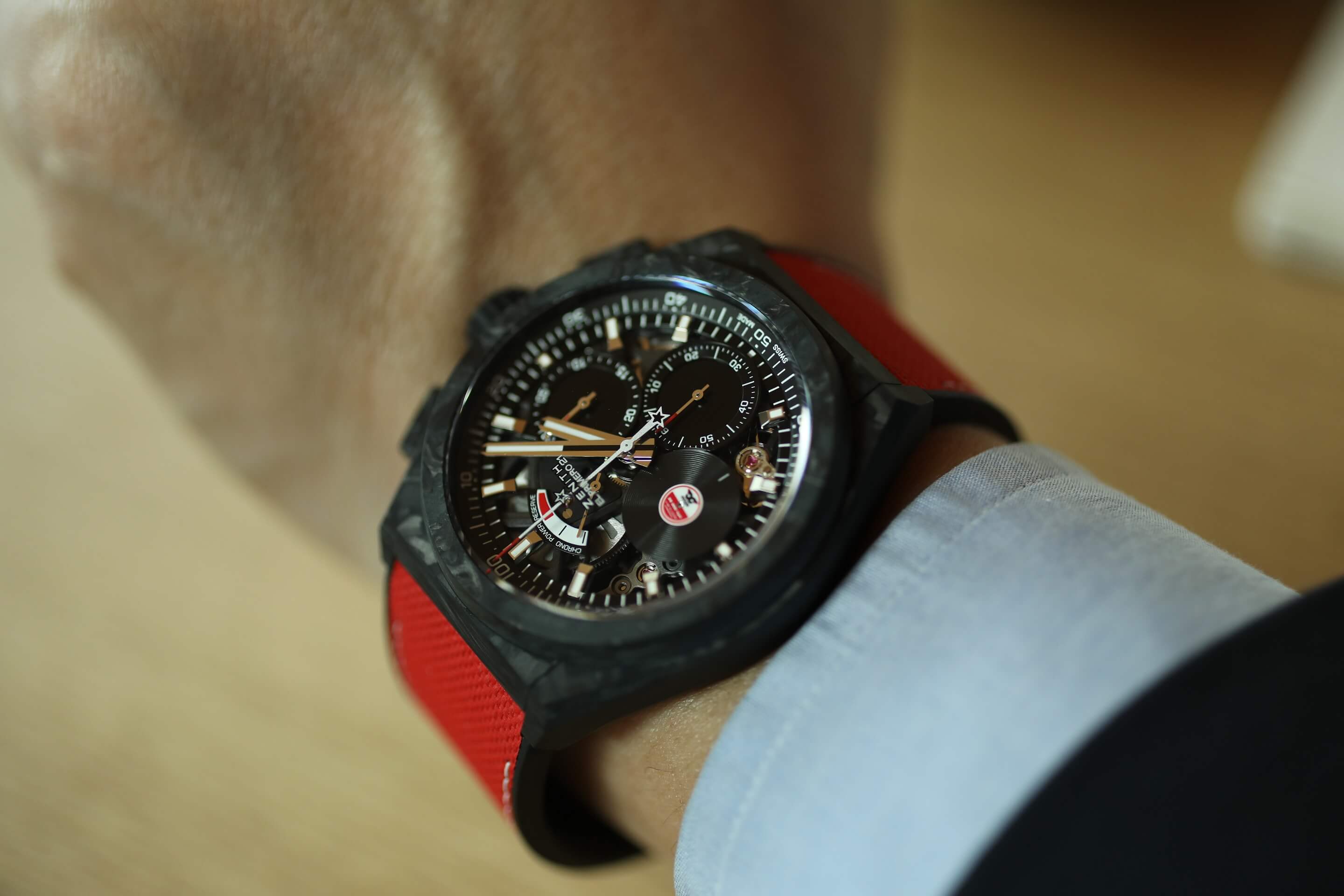 デファイ21 カール・コックス カーボンケース、206万円(税抜)、200本限定。44mm。ケースにはルミノバが含有される。