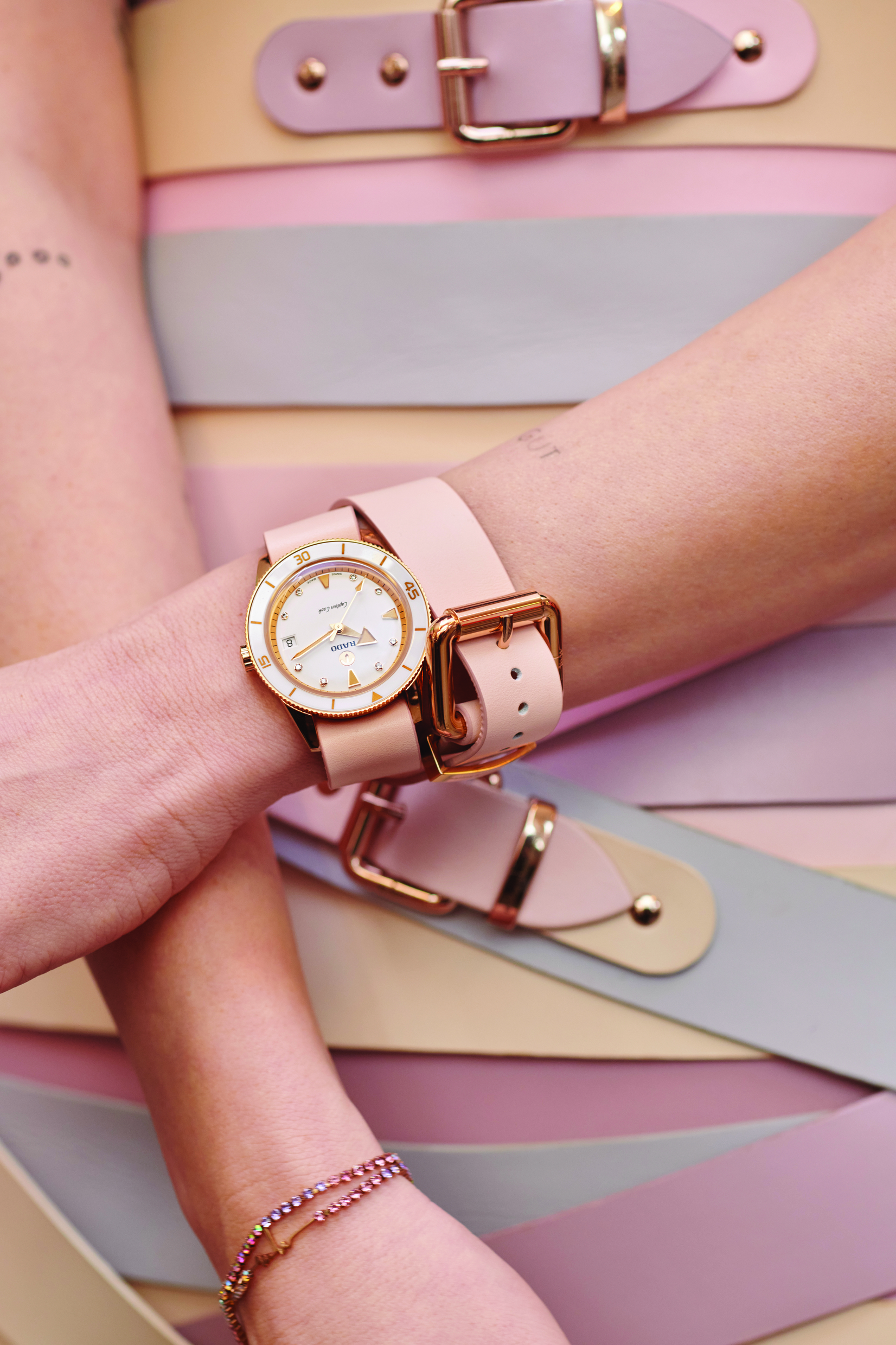 リストバンドがあれば、時計を着けたくないときにはリストバンドだけを着けることができます。私にとっては、このミックス&マッチが重要でした。時にはブラックのシンプルなストラップがいいと思うこともあるでしょうし、別の日には思い切ってローズのロングストラップを着けることもあるでしょう。私は、女性が毎日、時計をどのように着用するかという選択肢を提供したかったのです。