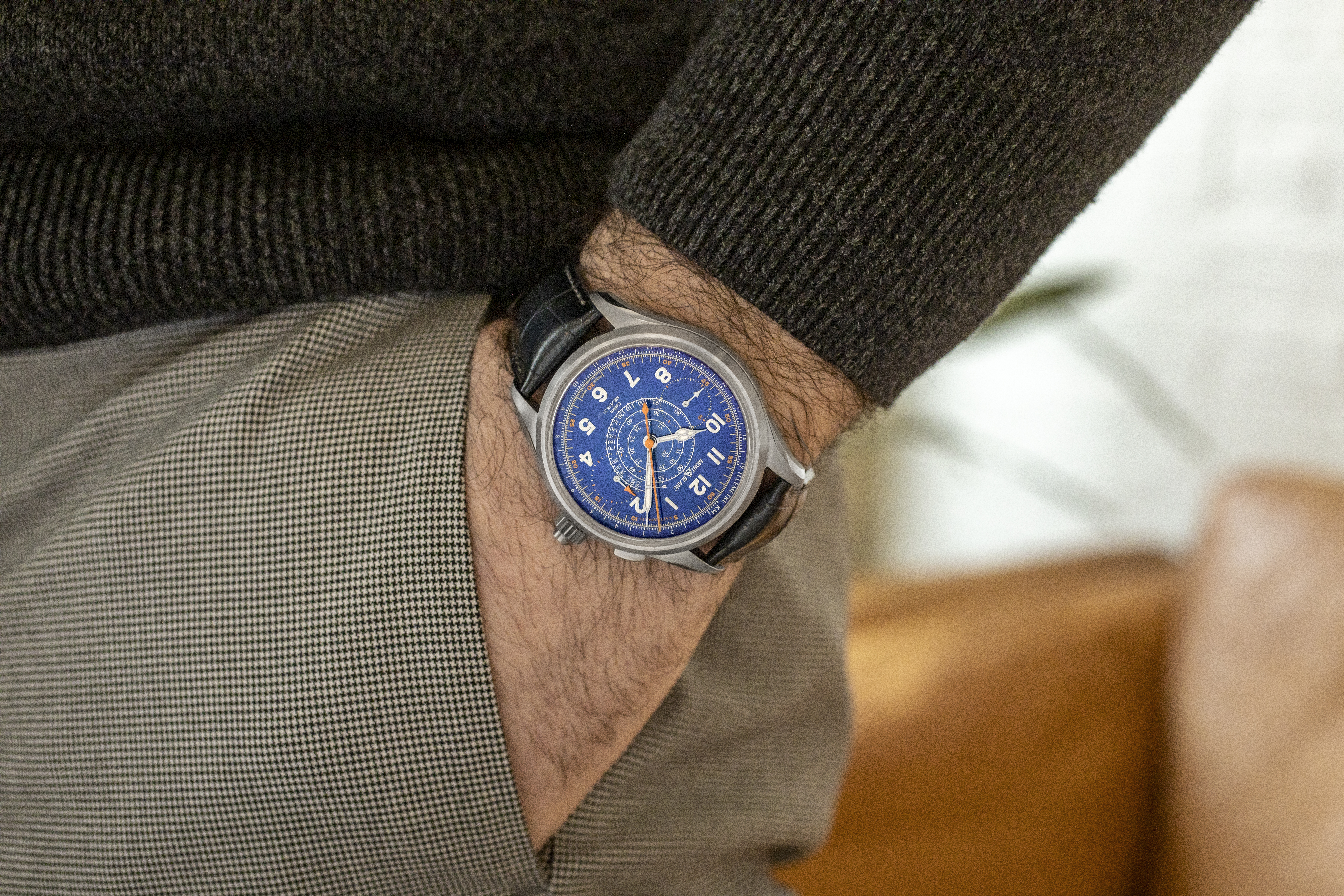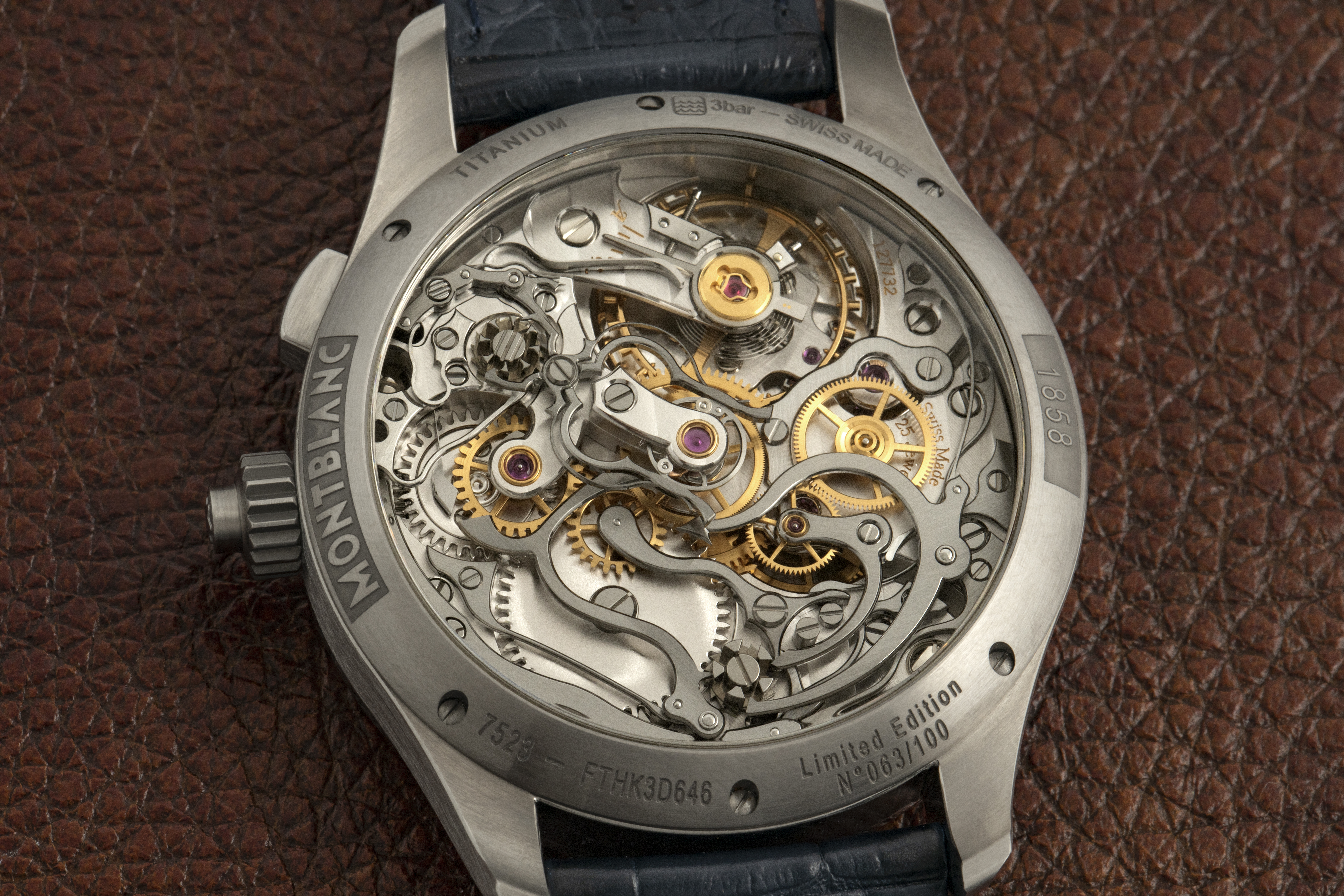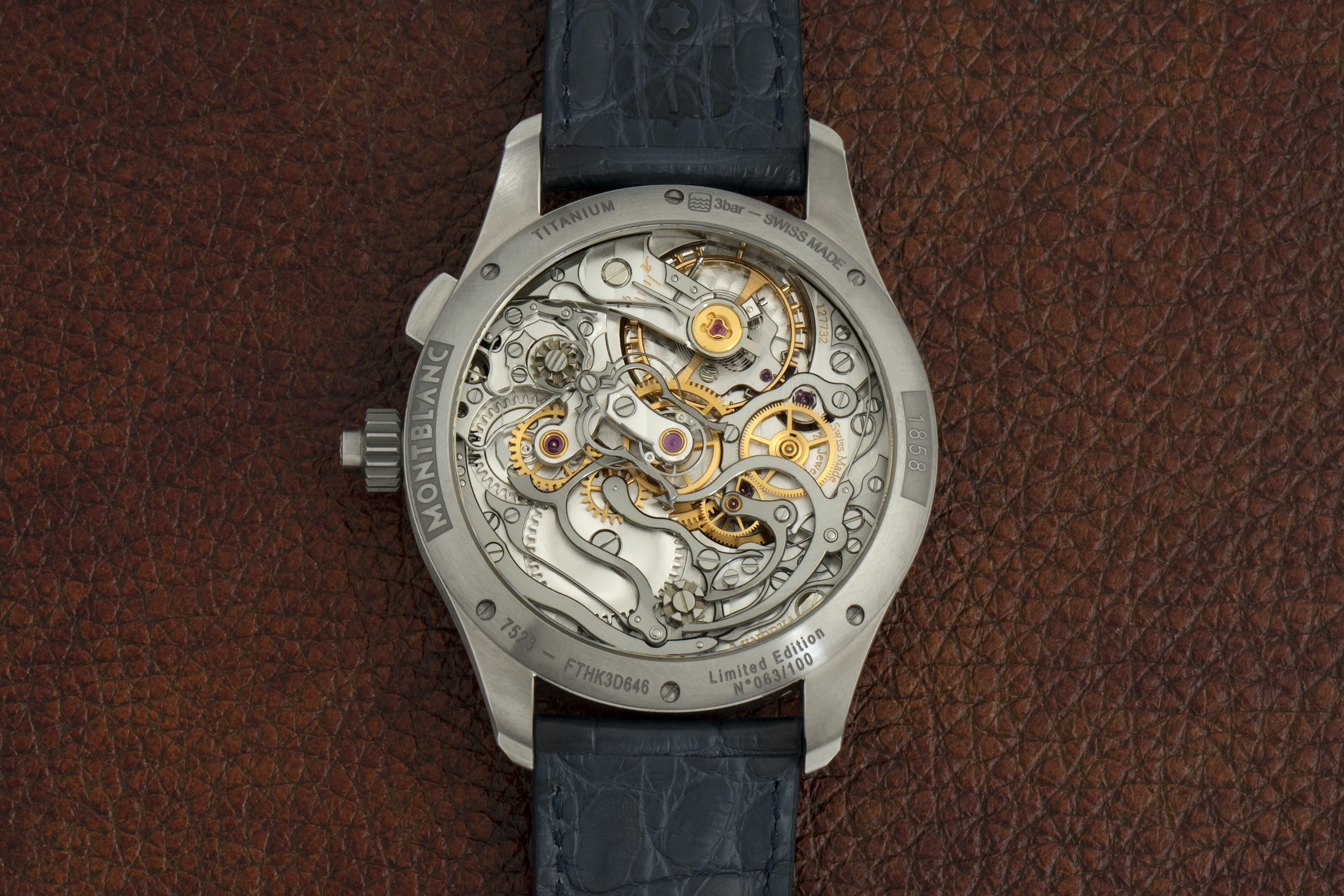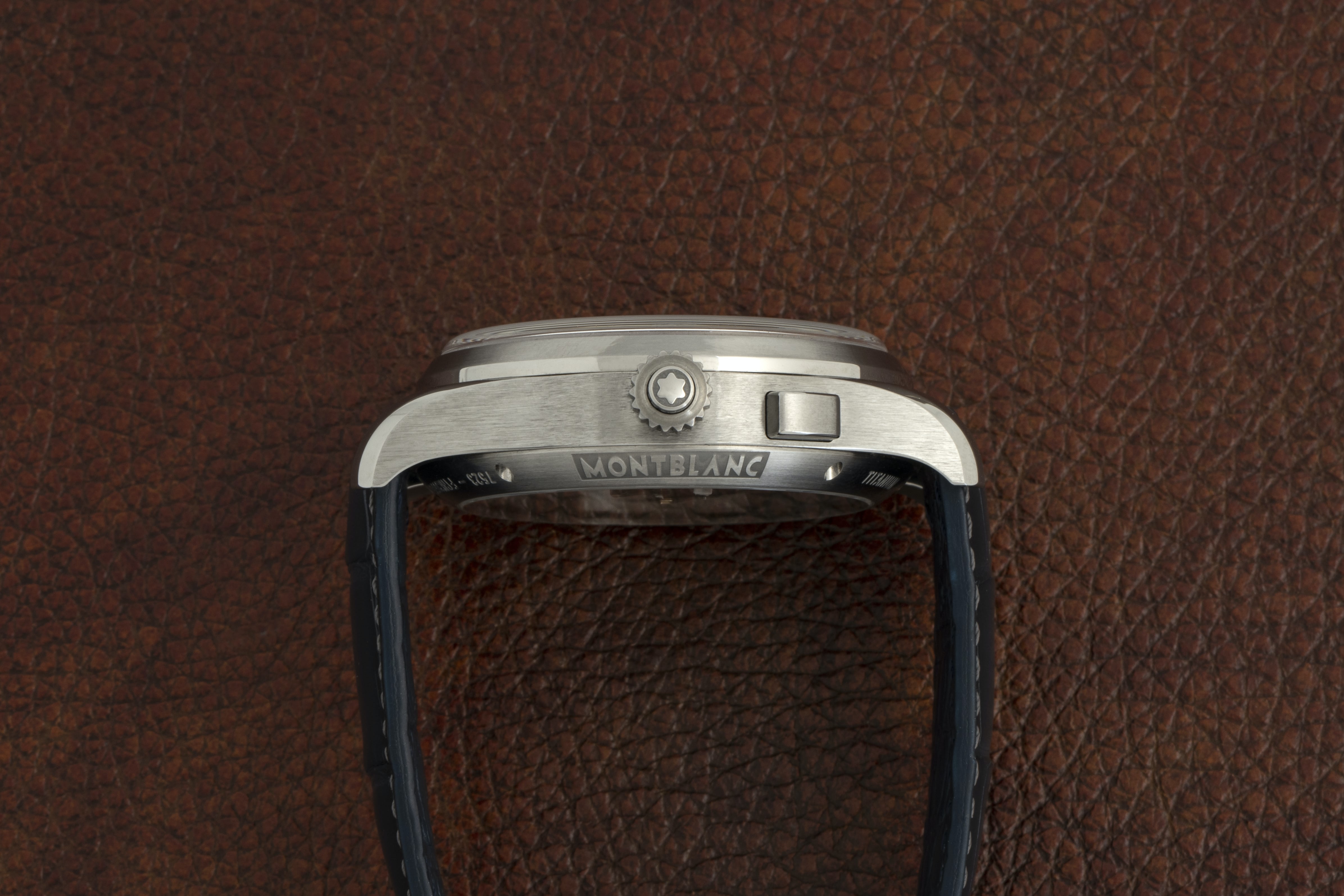 このモデルはかつても今も、純粋な最高級コンプリケーションウォッチの製作技術を反映している。ラトラパンテ・クロノグラフは、その構造の複雑さと繊細さゆえに、ミニッツリピーターやパーペチュアルカレンダーに匹敵する、正真正銘の複雑機構とみなされている。今では、より高い耐久性をもちながら複雑性を抑制して設計されたスプリットセコンド・クロノグラフも存在しているが、実際の高級時計の仕上げ方法と組み合わせつつ、伝統的アプローチで作られた注目すべきものもまた、存在している。モンブランは今、鮮やかなブルーのグラン・フー エナメルのダイヤルとチタン製ケースを特徴とした、古典の中の古典であるモデルを新作として発表したのだ。