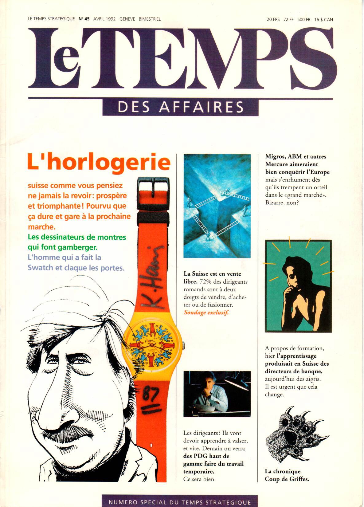 スイスの雑誌に掲載されたETA、そして後のスウォッチグループ指導者エルンスト・トムケを描いたイラスト。彼はデリリュームとスウォッチの時計の開発を指揮した。