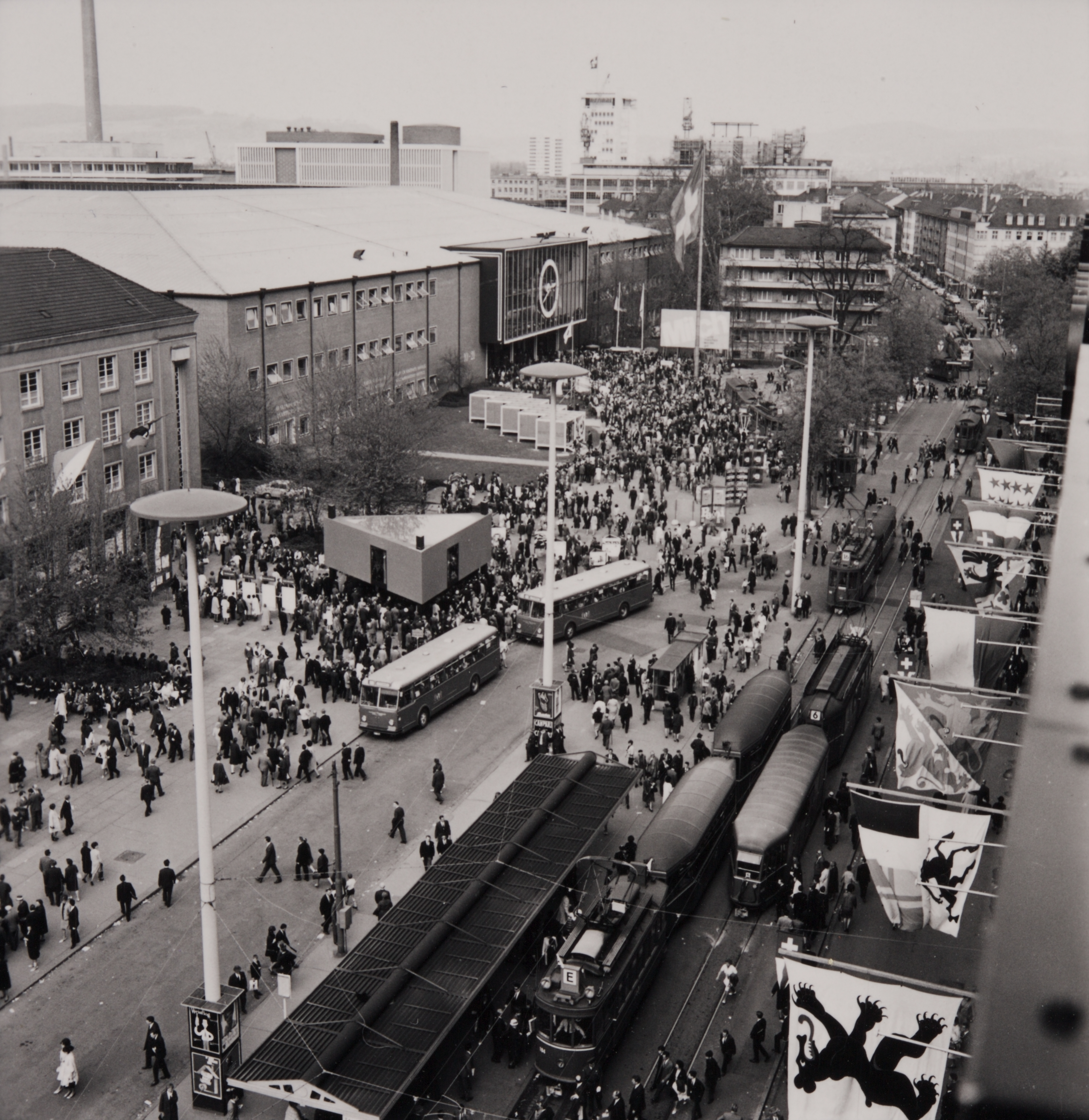 1965年のバーゼル・フェアで展示ホールの外に集まる人々。