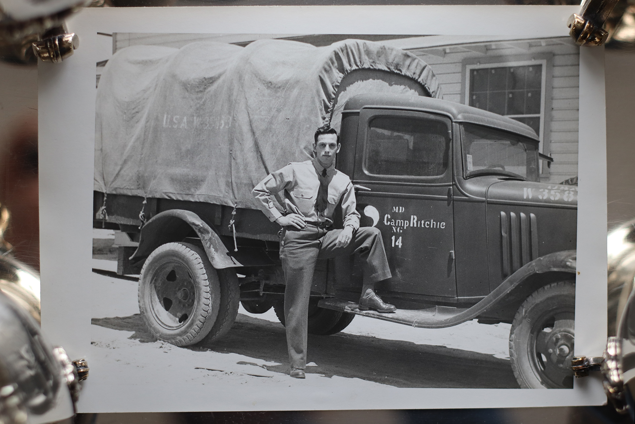 この写真は、第2次世界大戦中に軍事訓練施設、キャンプ リッチーで撮影された祖父、ハリー・J・ミルトン。