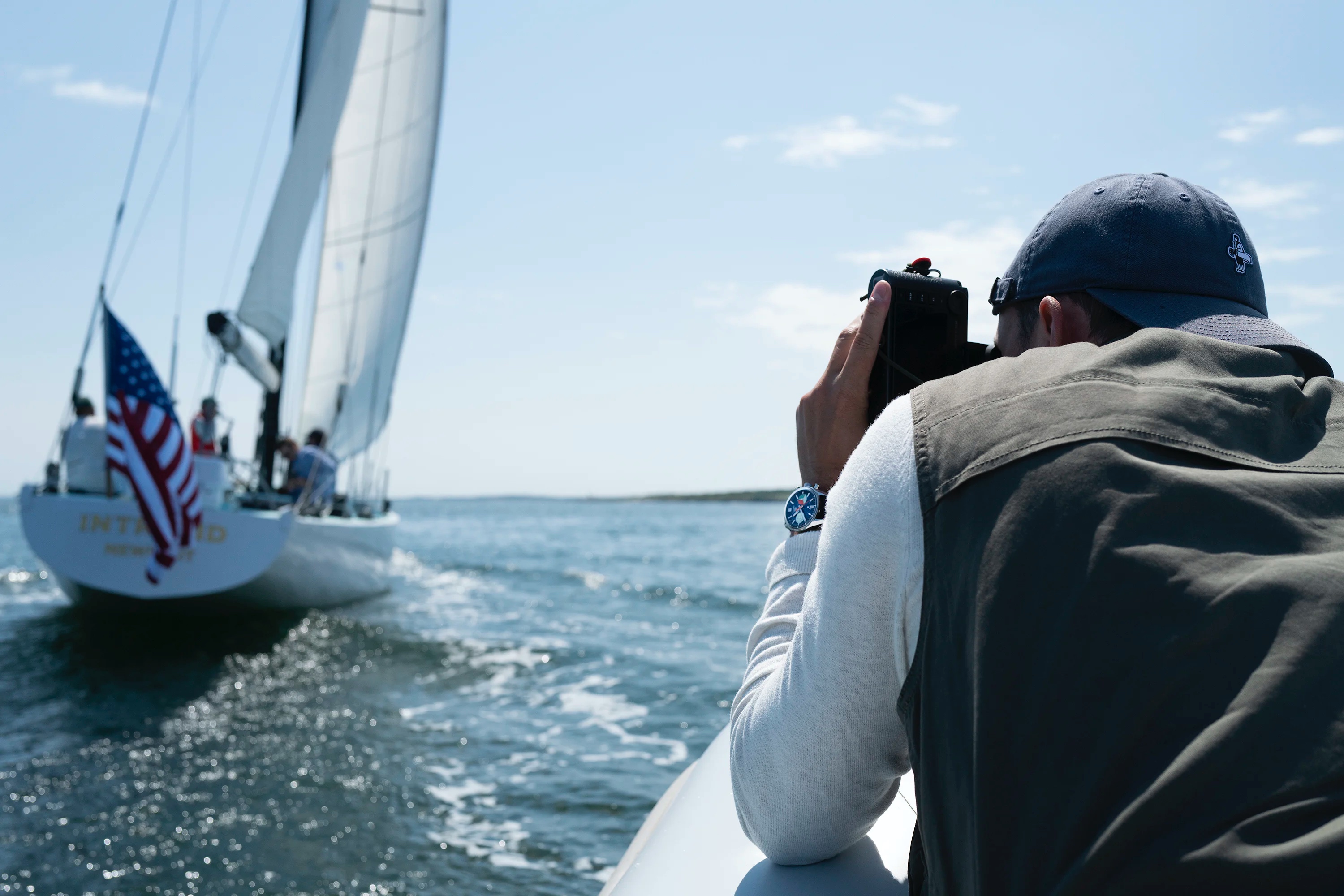今回の発表に先立ち、私たちは新型スキッパーを実際に、いや、むしろ夢の世界の中で見る機会を得た。というのも、ロードアイランド州ニューポートで、この時計とともにイントレピッド号で航海に出る機会を得たからだ。私はいつもの面々(ベン・クライマー、ジェームズ・ステイシー、ウィル・ホロウェイ、そして動画撮影チームのジョナサン・マクウォーターとジョー・ワイアットだ)と一緒に乗船した。