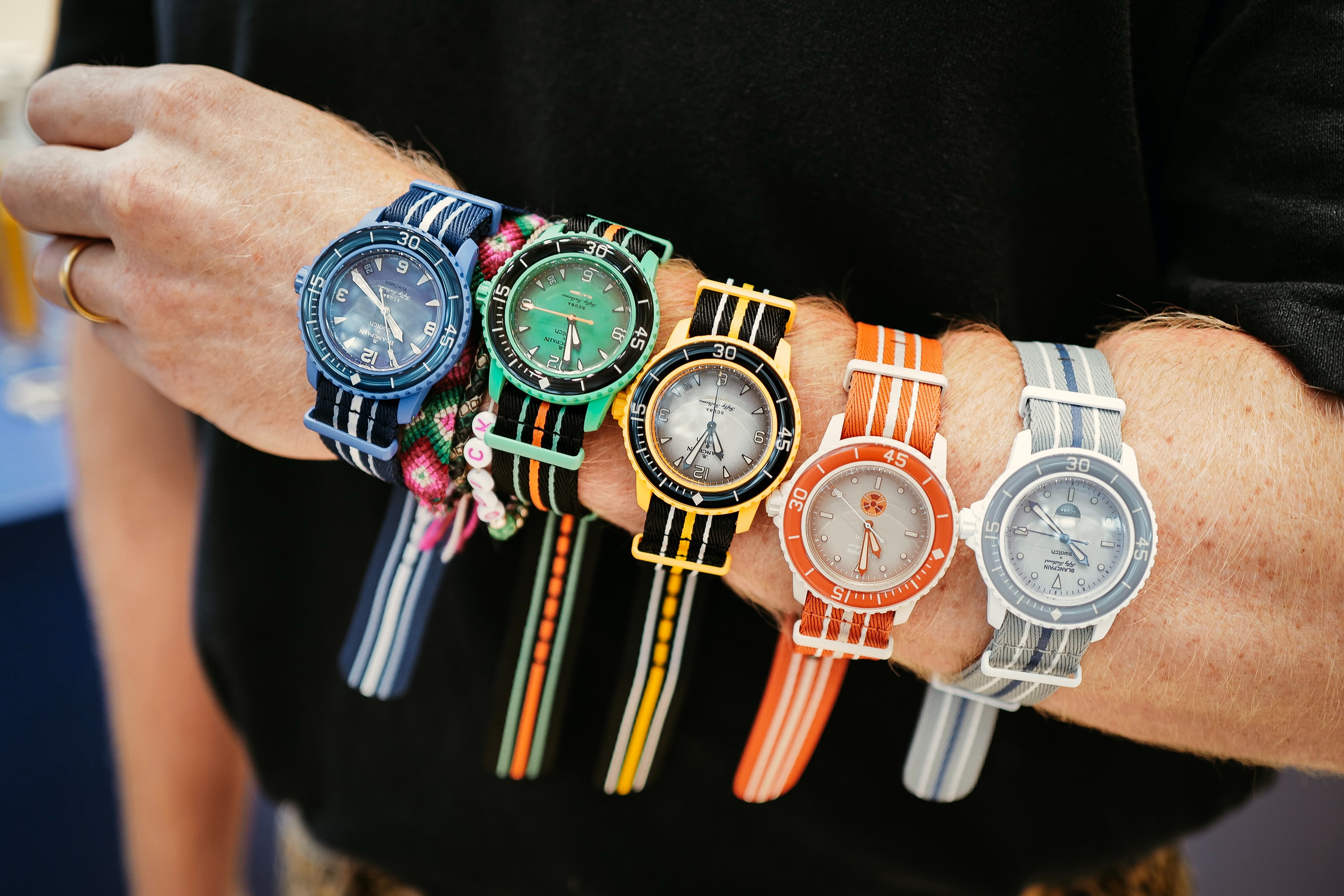 またムーンスウォッチの話題か? と思ったかもしれないが、こちらはブランパンとのコラボレーションによるブランスウォッチ(BlancSwatch)についてだ。3月から続くミッション・トゥ・ムーンシャインゴールドの熱狂のさなかで発表されたこのブランスウォッチも、発売前からSNSを中心に大きな話題を呼んだ。このコラボモデルは、スウォッチによる自動巻きムーブメント システム51を搭載した直径42.3mm、厚さ14.4mmのバイオセラミック製フィフティ ファゾムスだった。6万500円(税込)という価格には3万6500円(税込)のムーンスウォッチを知っている人々から疑問の声も上がったが、システム51は90時間のパワーリザーブを備え、ニヴァクロン製の耐磁性ヒゲゼンマイを搭載した、スウォッチグループの技術の粋が詰まったムーブメントだ。今回はそこに各カラーごとに異なる装飾がデジタルプリントで施されていて、フロントから見てもバックから見ても楽しい作りになっていた。ムーンスウォッチ+αの価値としては、これで十分であるように思う。なんにせよ、ブランスウォッチの発売日には2022年3月のように、各地で長蛇の列ができていた。