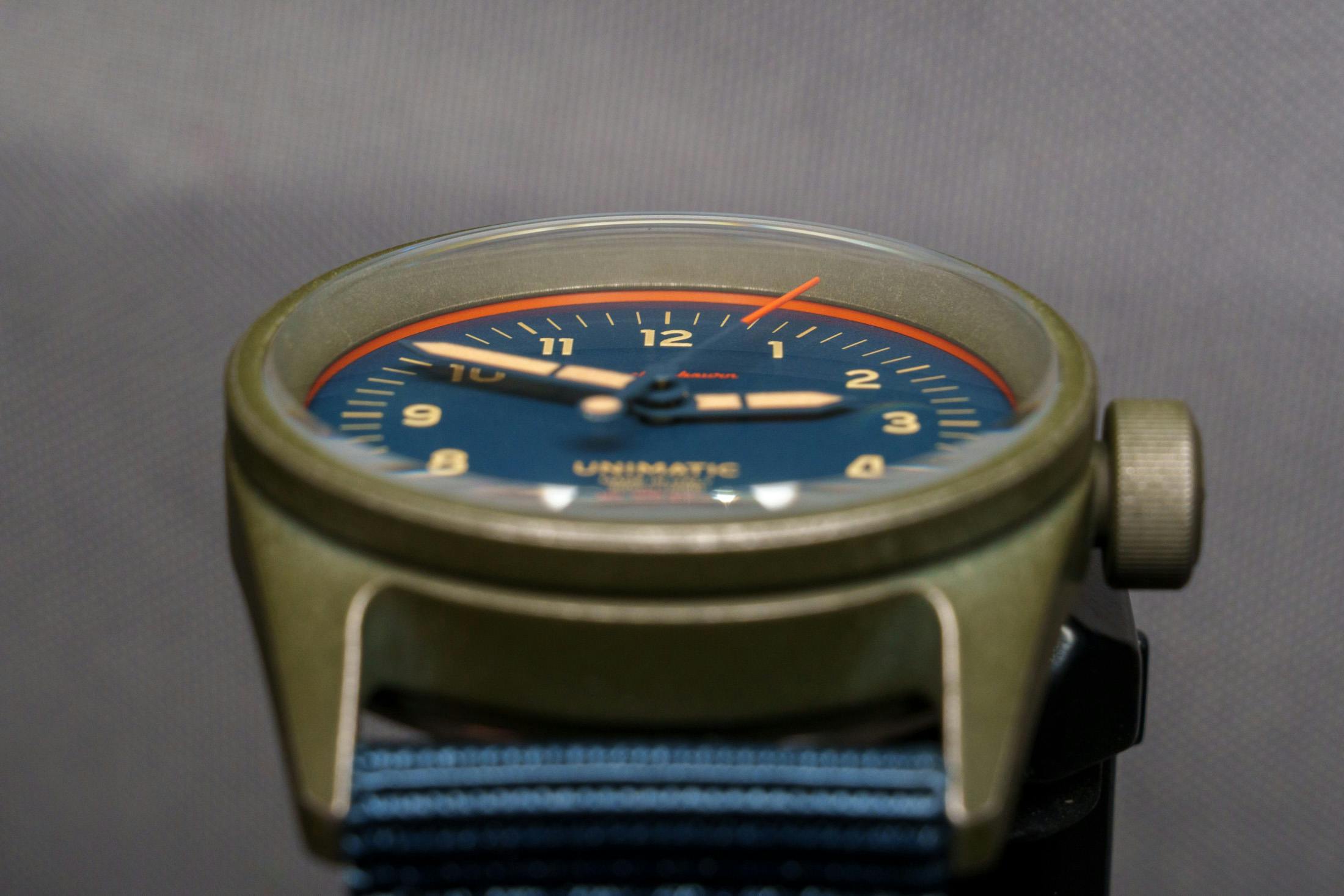 ケースに施されたCerakote™のストーンウォッシュ仕上げも印象的です。ブラスト加工によってあえて一部の地金をのぞかせることで、最初から使い込まれた装備のような表情を与えています。チョー氏が「この仕上げはナイジェルの美学にとても合っている」と語るのも頷けます。ミリタリーや探検装備を着想源とするナイジェル・ケーボンの世界観と、無駄を削ぎ落としたウニマティックのデザインが、無理なく重なっているように感じました。