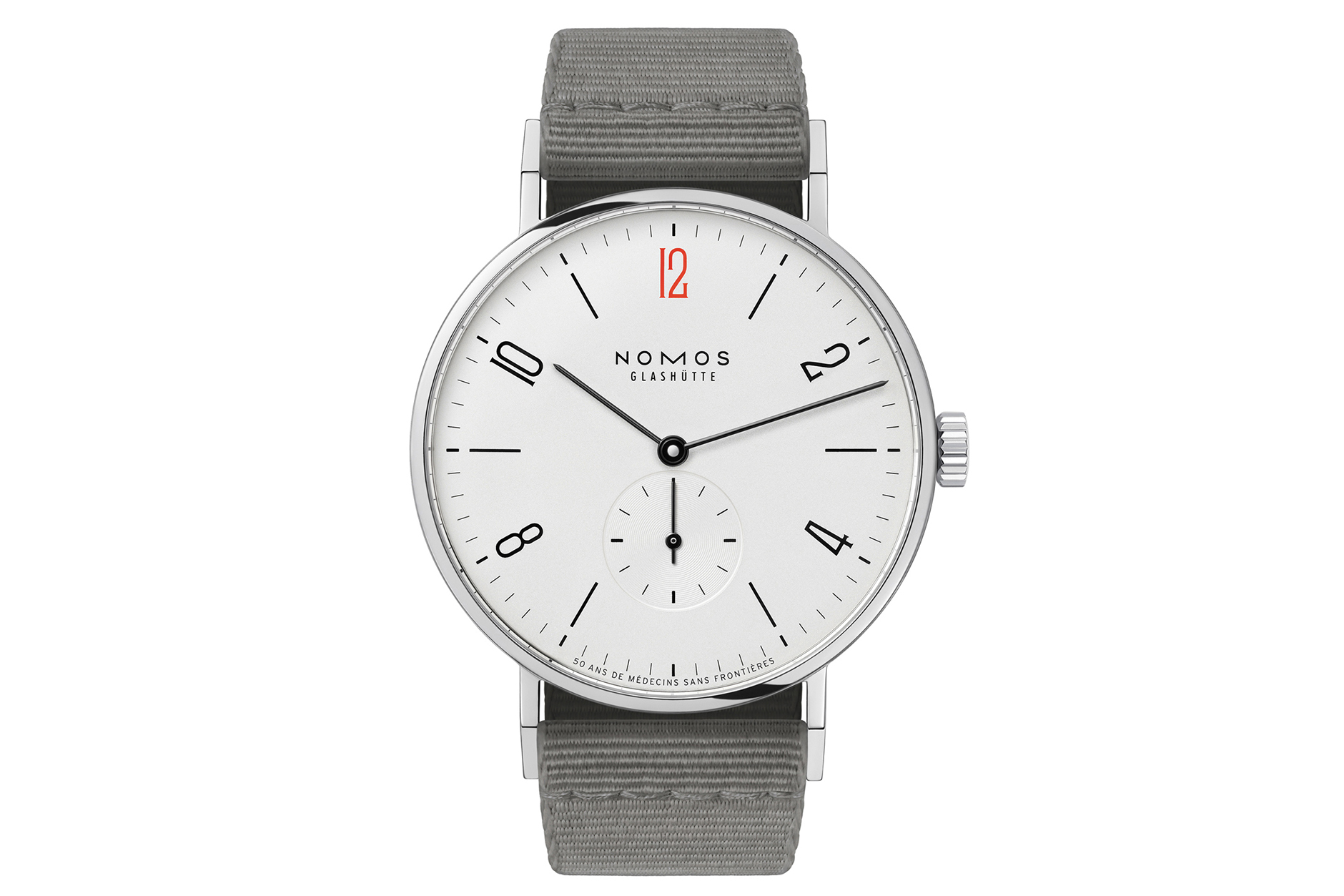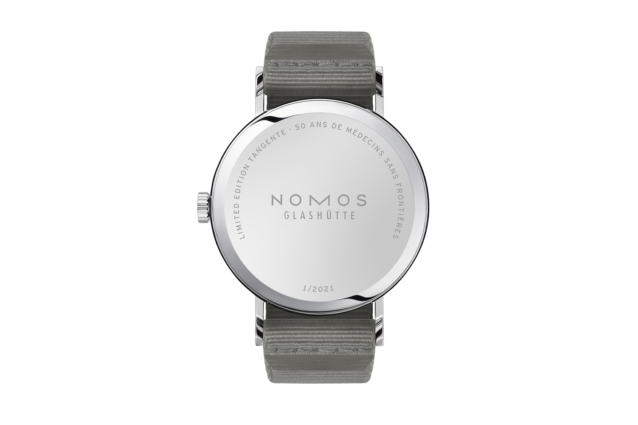 まず、グレーのテキスタイルストラップが初めて採用された。これまでのモデルでは、ダイヤル下部に国境なき医師団(Doctors Without Borders)の表記が入っていた(通常はMade in Germany)。そして、国境なき医師団の設立50周年を記念して、ノモスは原点に回帰した。国境なき医師団は、1971年にパリでメディサン・サン・フロンティエール(Médecins Sans Frontières, フランス語で国境なき医師団)として設立されたが、この時計には、まさにその表記(国境なき医師団50周年;50 ans de Médecins Sans Frontières)がプリントされている。