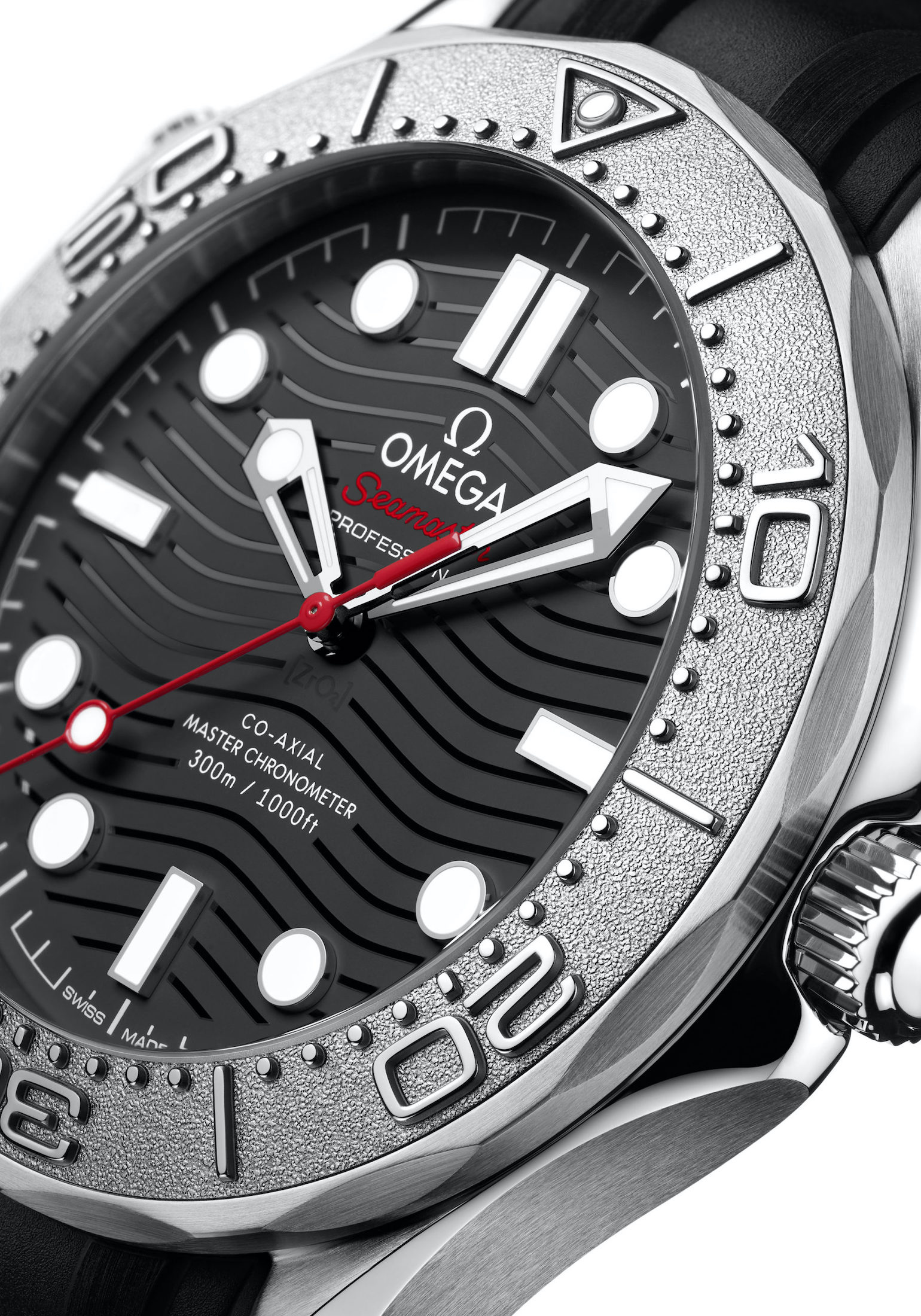 まずは文字盤。通常モデルは、セラミックにブラックやホワイト、ブルーなどのPVDコーティングが施されたもの。ですが、シーマスター ダイバー300M ネクトン エディションは、サテン仕上げのブラックセラミックにポジティブ・レリーフの波模様のレーザーエングレーブが施された[ZrO2]ダイヤルです。12時位置の"Seamaster"ロゴと秒針は、赤く染められていますが、これはオメガロゴの入ったネクトンのハイテク潜水艇とマッチするカラーリング。また、通常モデルでは、6時位置に日付表示機能がありますが、本機はノンデイト仕様です。
