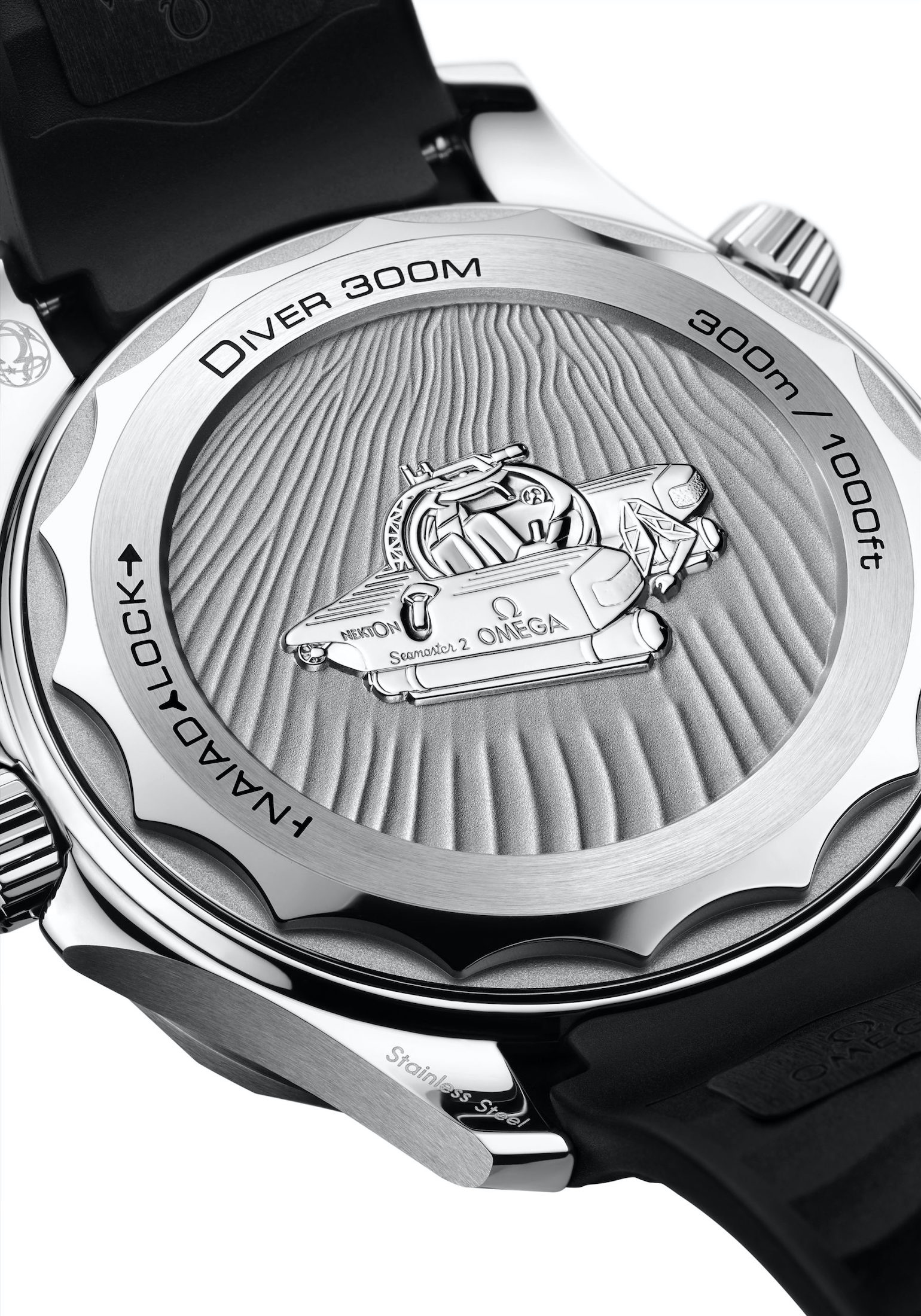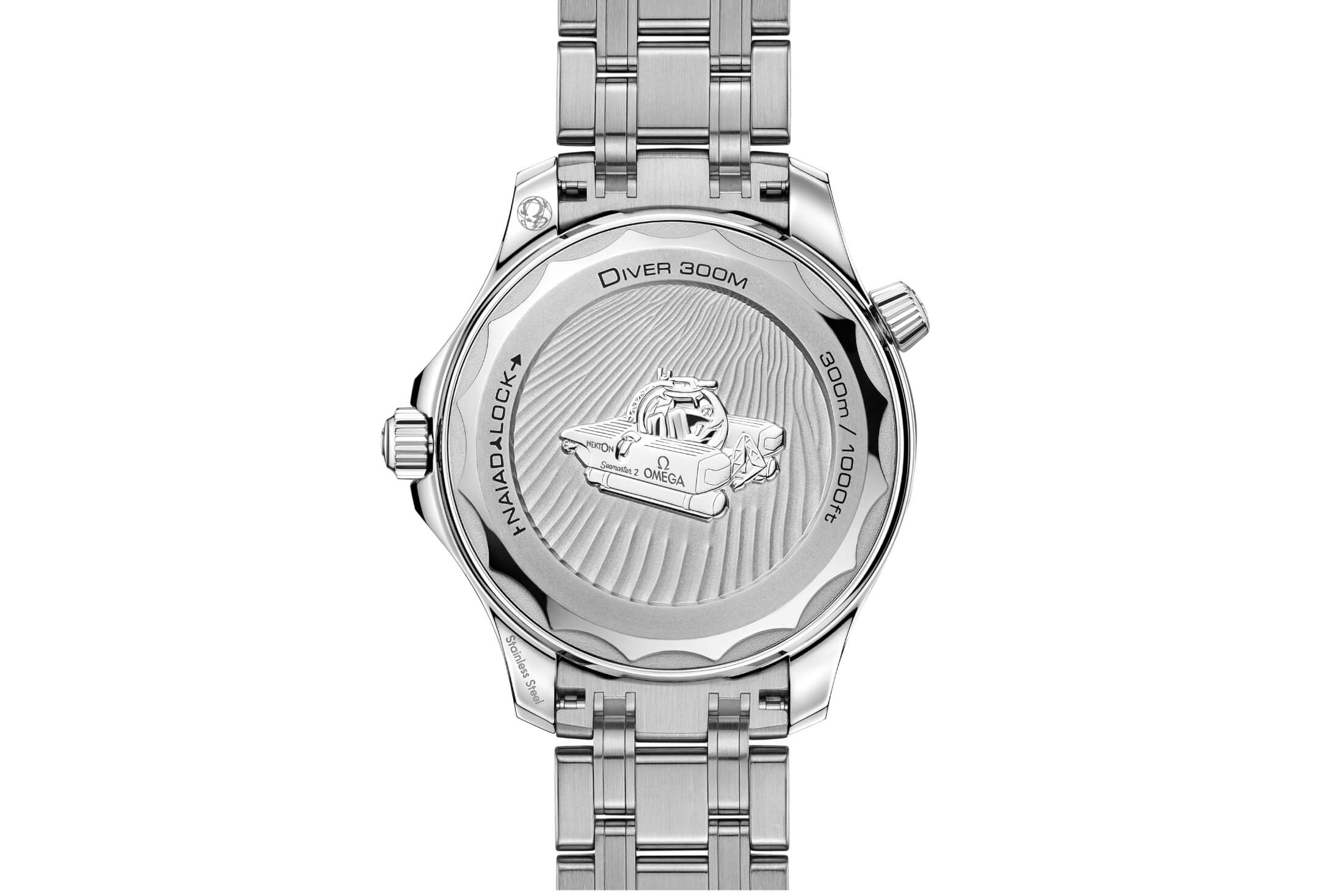 ケースを裏返すとネクトンが研究で使用するオメガロゴの入り、"シーマスター2"と名付けられたハイテク潜水艇がエングレーブされているのに気づきます。裏蓋は、オメガが特許を取得したナイアードロック(NAIAD LOCK)を採用。これは、ねじ込み式のケースバックを常に定位置で固定させるオメガの特許取得技術です。今回のネクトンモデルを含めオメガの限定モデルでは、裏蓋に特別な印字やエングレービングが施されていることが多いですが、そうしたモデルにナイアードロックは最適。本機もエングレーブされたネクトンのハイテク潜水艇が傾いたりすることなく、定位置で固定されます。