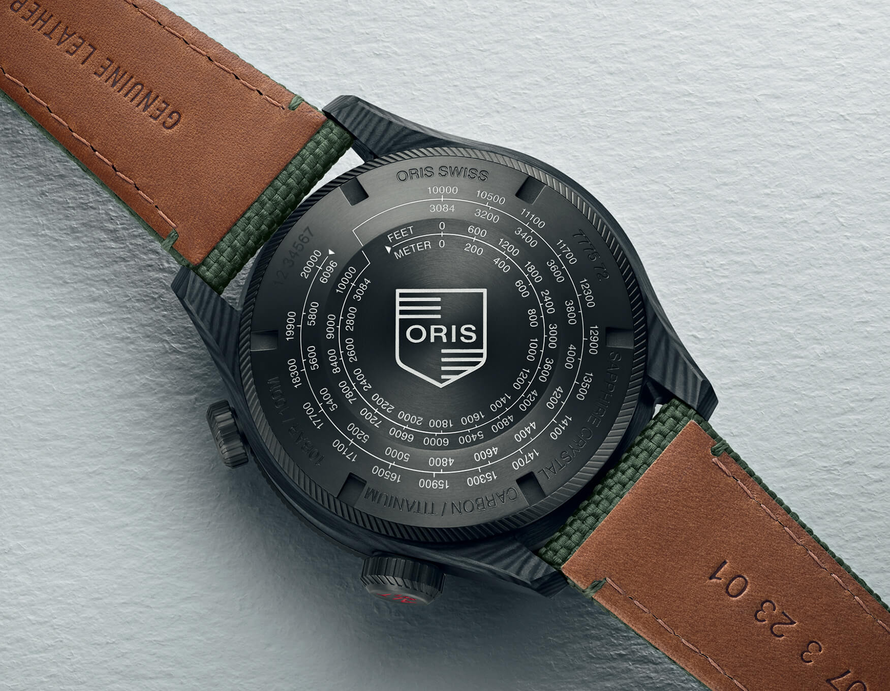 ダイヤル側の表示はメートルかフィートのどちらか一方になるが、チタン製のスクリューバックケースにメートル/フィート表示換算スケールを施すことでどちらの表示にも対応する。Photo Courtesy ORIS