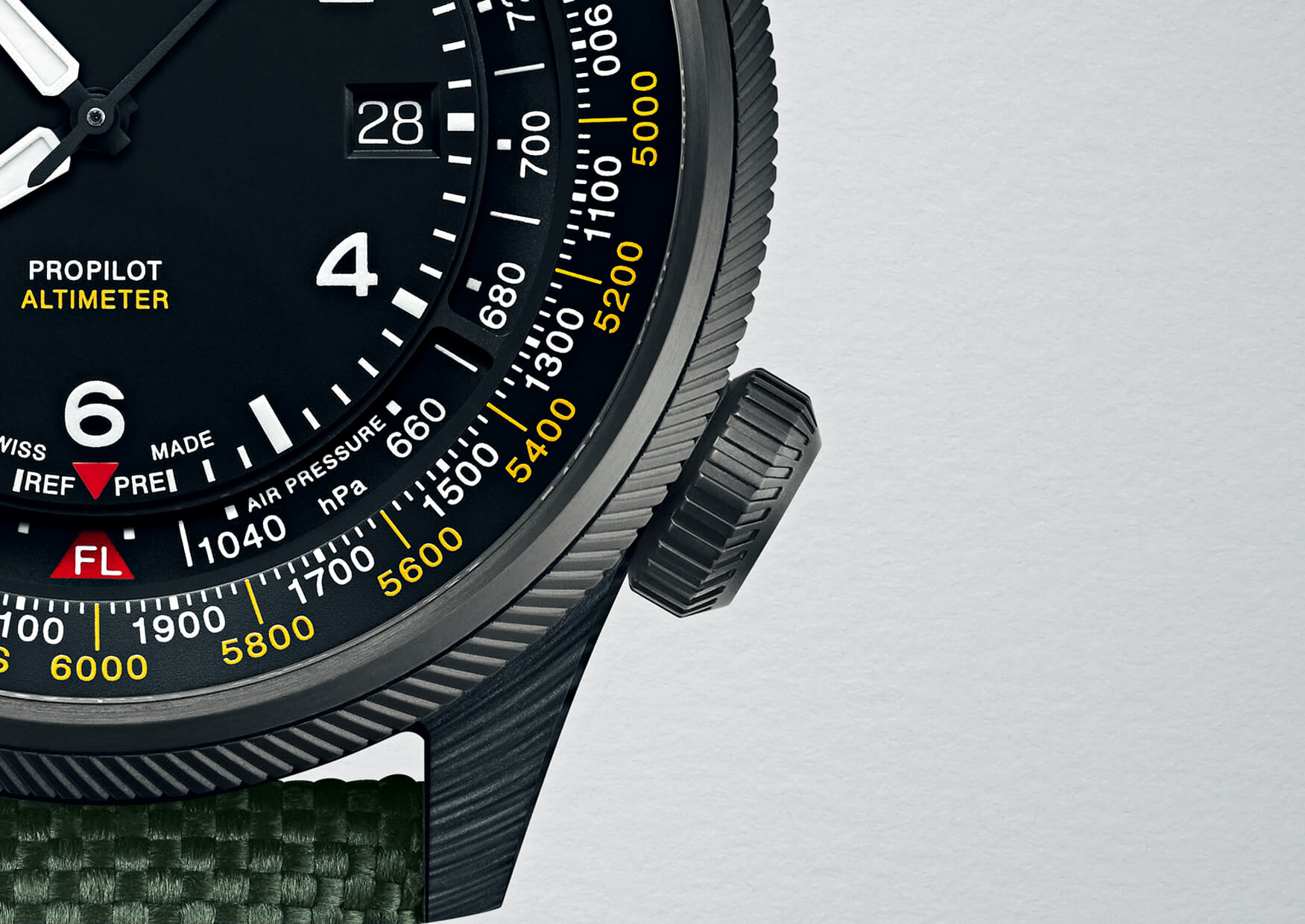 文字盤の外周に記した高度表示は、白い数字が0〜3900mでひと回りしたあと、2段目の黄色い数字の4000〜6000mに続く。航行時はFL(フライトレベル)が記された赤い三角を6時位置の三角に合わせる。チタンのケースバックはねじ込み式で、メートルとフィートの換算尺が刻まれている。チタンはこのほかベゼルとふたつのリューズにも使われ、いずれもグレーPVDを施し、軽量性と高強度に寄与する。