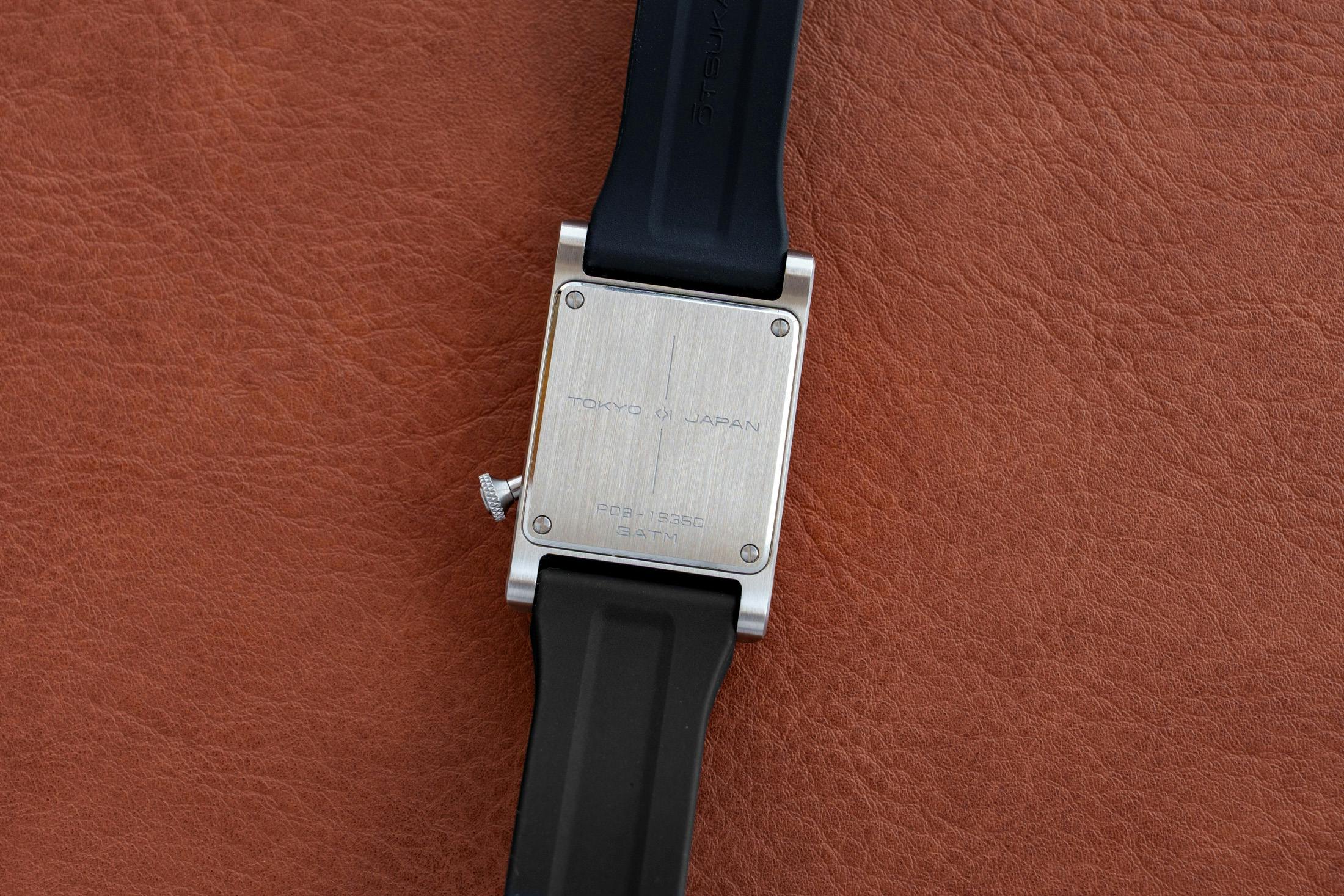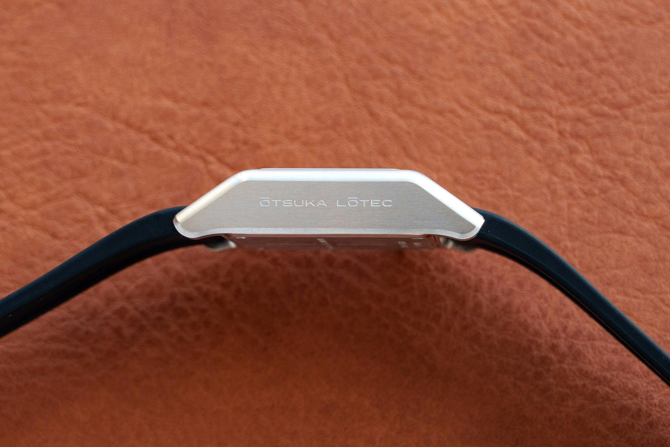 ケースデザインも特徴的です。上下のラグに角度が付けられたフォルムとなっており、真横から見ると台形のシルエットを描きます。ケース全体にはサテン仕上げが施されており、工業製品のようなインダストリアルな雰囲気を強く感じさせます。また、ストラップに取り付けられる尾錠も本作に合わせて新たにデザインされたものが採用されています。大塚ローテックのモデルとしては初めてラバーストラップが採用されている点も特徴です。