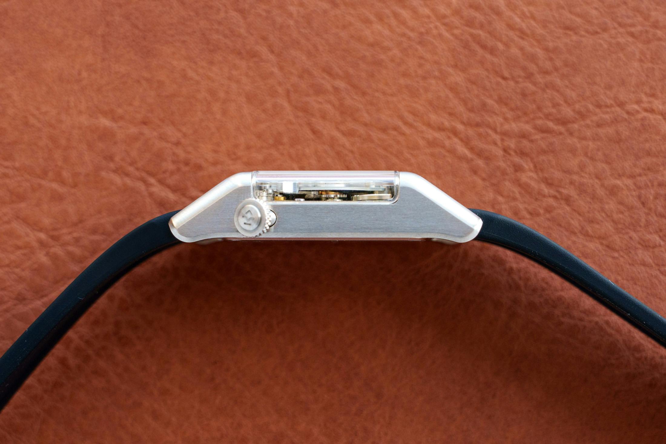 風防はケースの側面まで回り込むように設計されており、横方向からも内部機構を見ることができます。2層構造の文字盤のあいだを通過する分表示のフェーダーの動きが、サイドからも観察できる点もこのモデルの見どころです。こうした要素によって、本作にはレコーディングスタジオの機材から着想を得た世界観が、表示機構のデザインとその動きの両面に落とし込まれています。