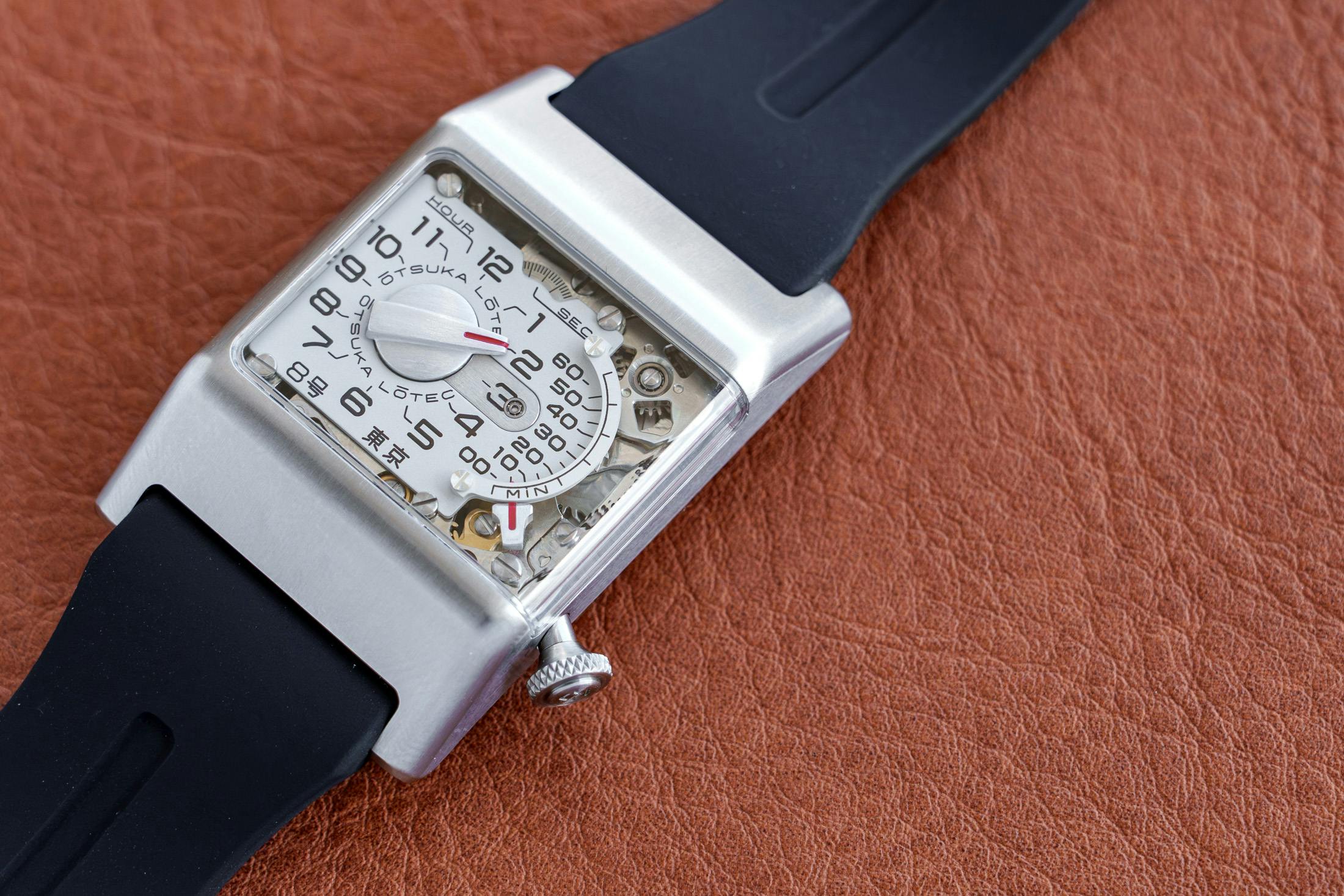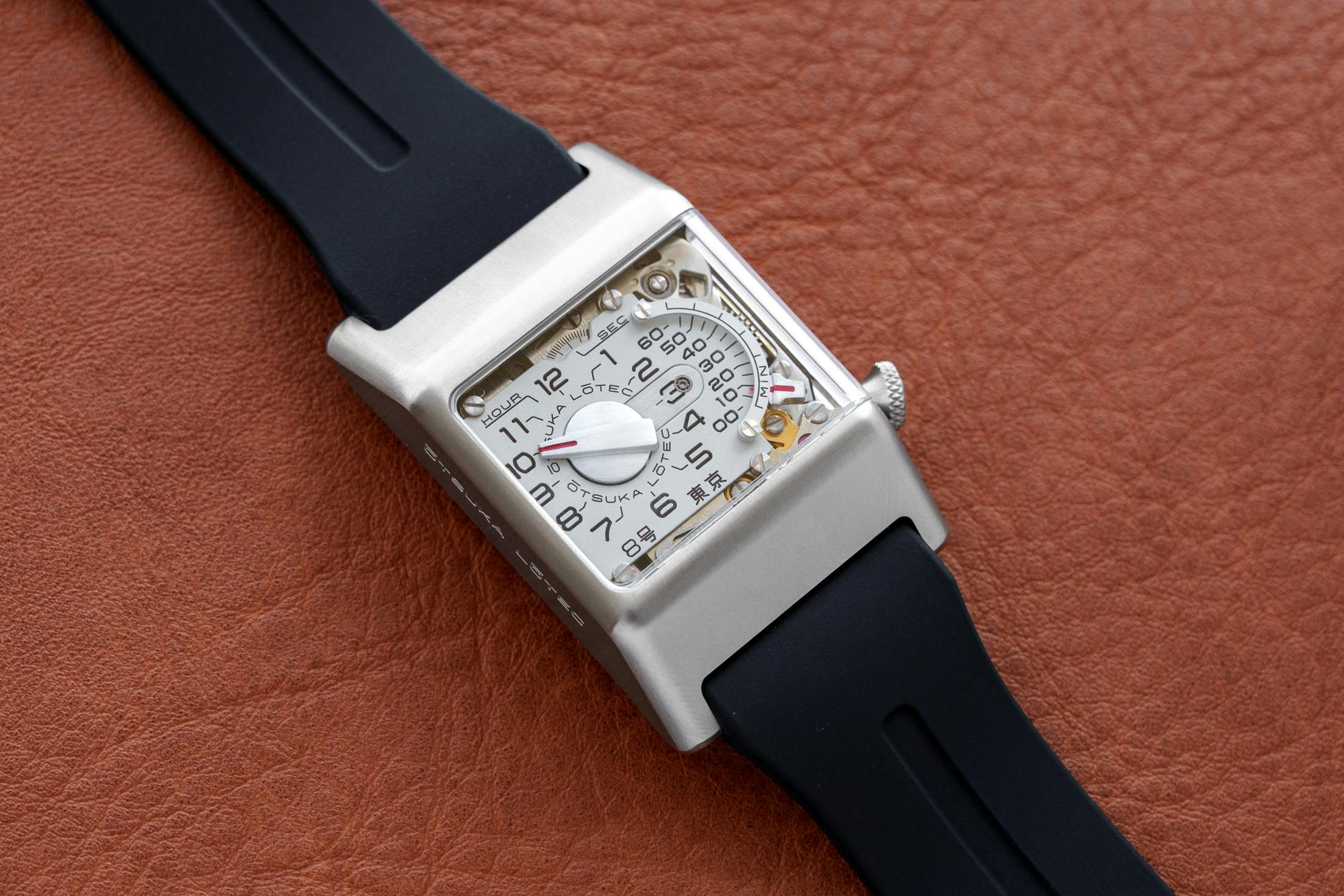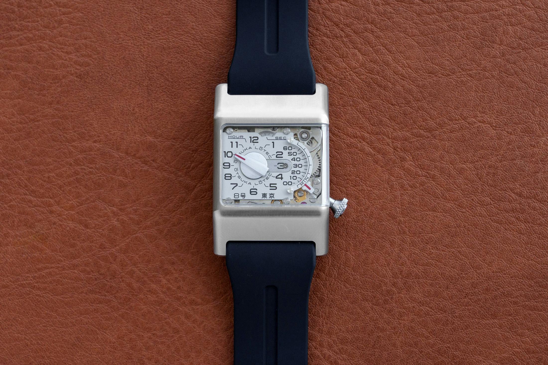大塚ローテックから、9号に続いてスクエアケースを採用した新作「8号」が登場しました。本作は、他の大塚ローテックのモデルと同様に一般的な針で時刻を表示するのではなく、ジャンピングアワーとレトログラード式の分表示を組み合わせた独創的な表示機構を採用したモデルです。