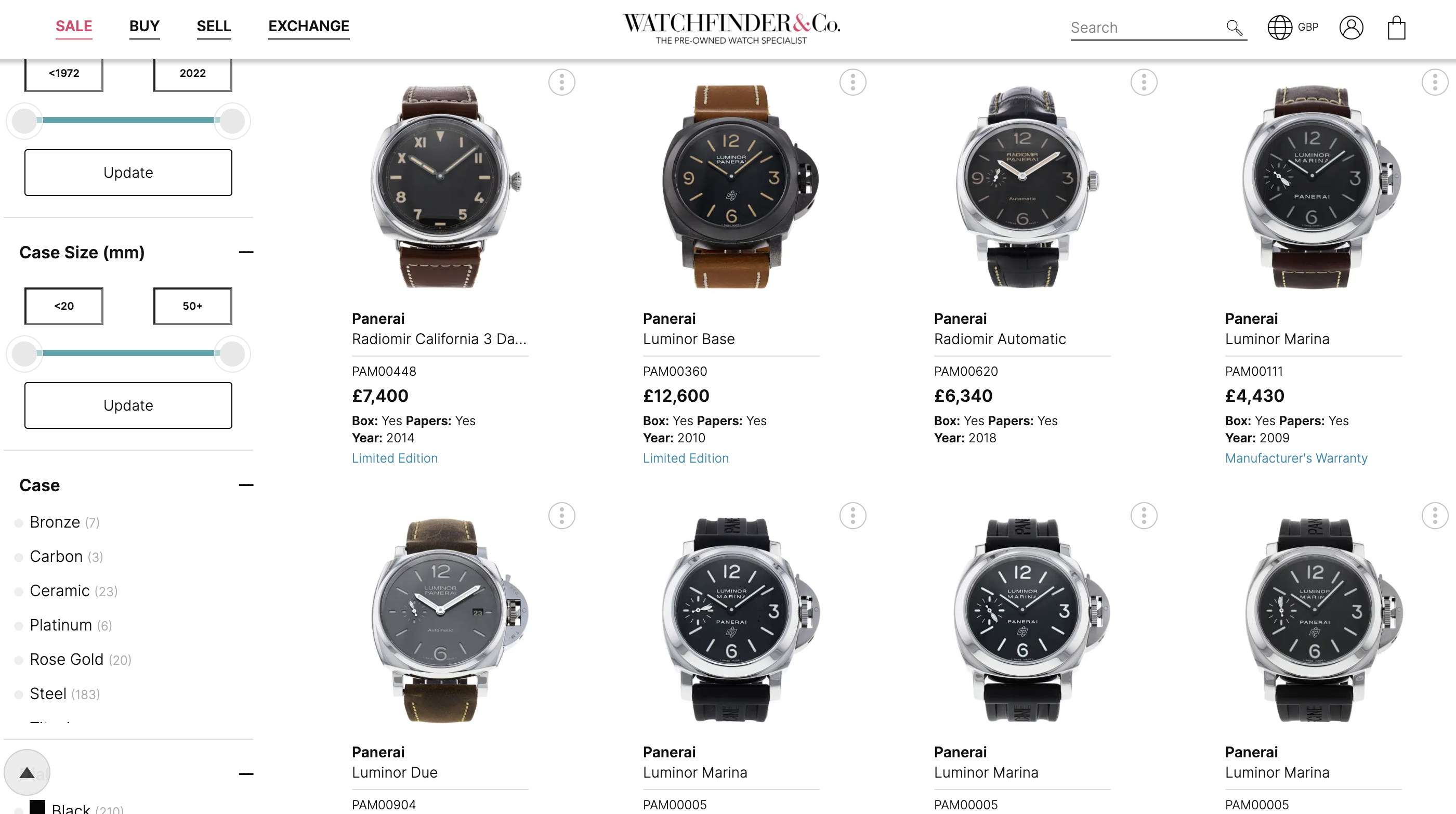 https://www.watchfinder.com/公式サイトのスクリーンショット。本国イギリス向けのページで確認したところ、記事執筆時点で296本のパネライが販売されており、ブランド別の取り扱い数ではロレックス、ブライトリングに続いて3番目に多かった。パネライは細かな仕様の違いで異なるリファレンスを多くリリースしてきただけに、豊富な在庫を見比べられるのはメリットが大きい。ただ、なかには希少なリミテッドエディションも見られ、相応のプレミアム価格がついているものもある。ニーズがある以上、セカンダリーでの価格高騰は摂理なのだが、ブランド側とセカンダリーマーケットが協調関係を結んでいくなかで、こうした値付けや具体的なユーザーメリットがいかに整備されていくかは定点観察が必要だ。