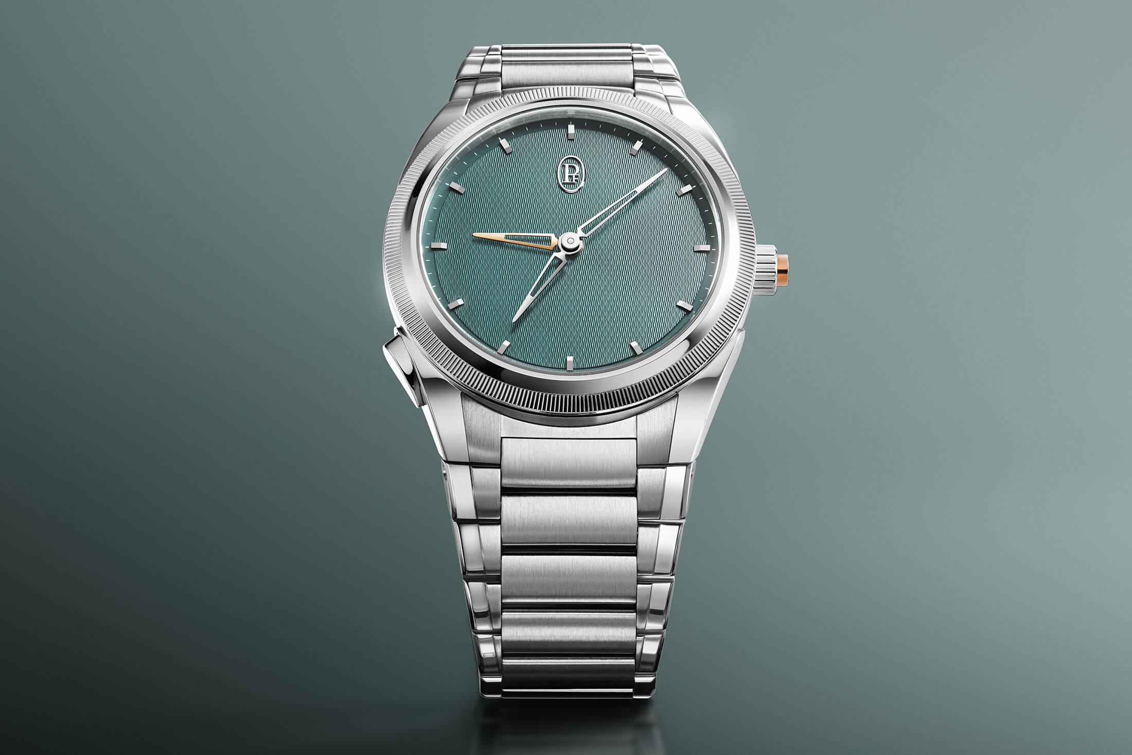 2025年の新作も基本的には2022年に発表された初作、ミラノブルーダイヤルのトンダ PF GMT ラトラパンテと同じ仕様を備える。ダイヤルには特徴的なバーリーコーン(フランス語ではグランドルジュと呼ぶ)模様のギヨシェが手作業で彫り込まれる。そこに合わせたロジウム加工を施したホワイトゴールドの針とインデックスが、きらめく光を繊細に捉える。ポリッシュとサテン仕上げを組み合わせたステンレススティール製ブレスレットと繋がる直径40mmのSSケースの上面を飾るのは、プラチナ950製のローレット加工ベゼルだ。