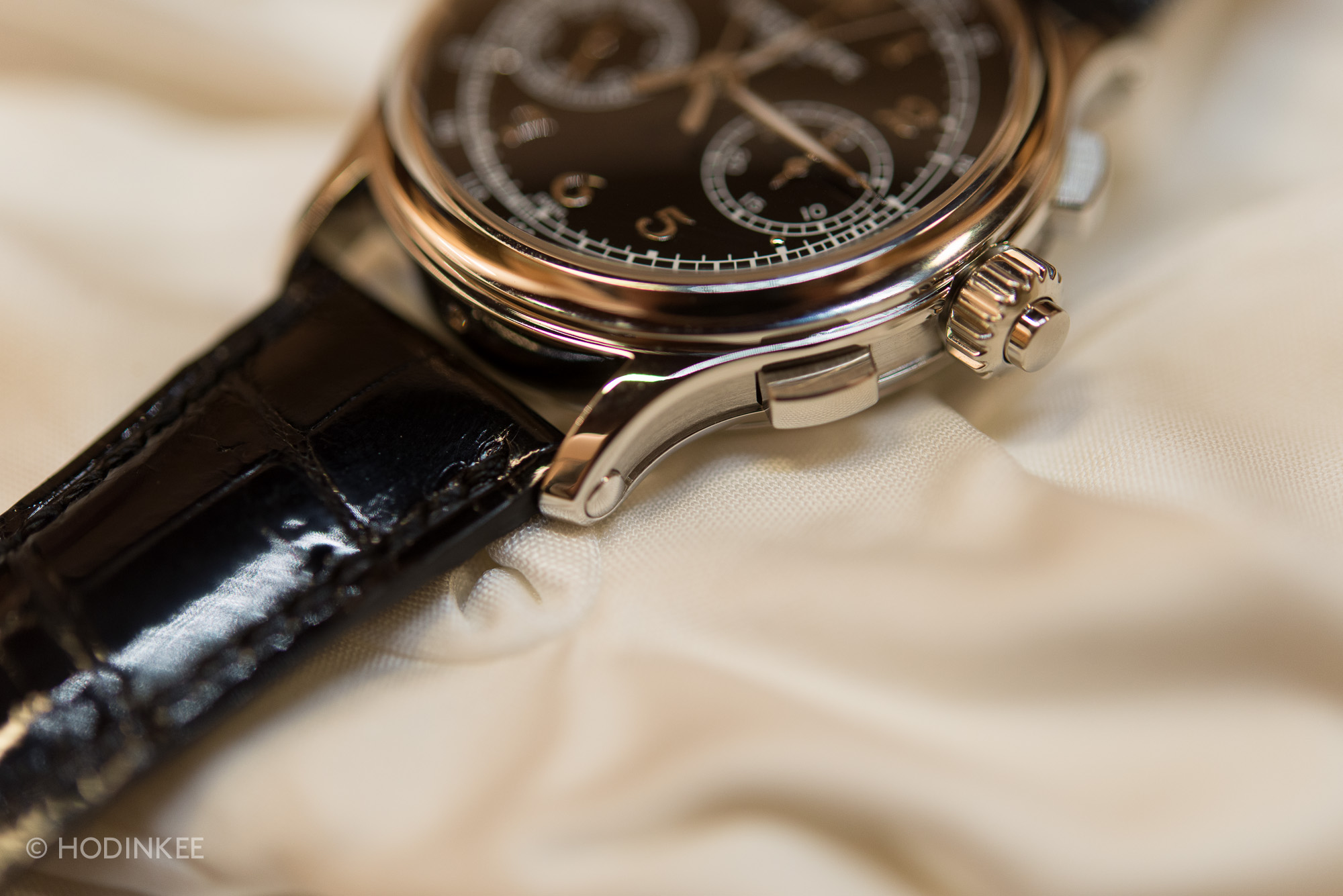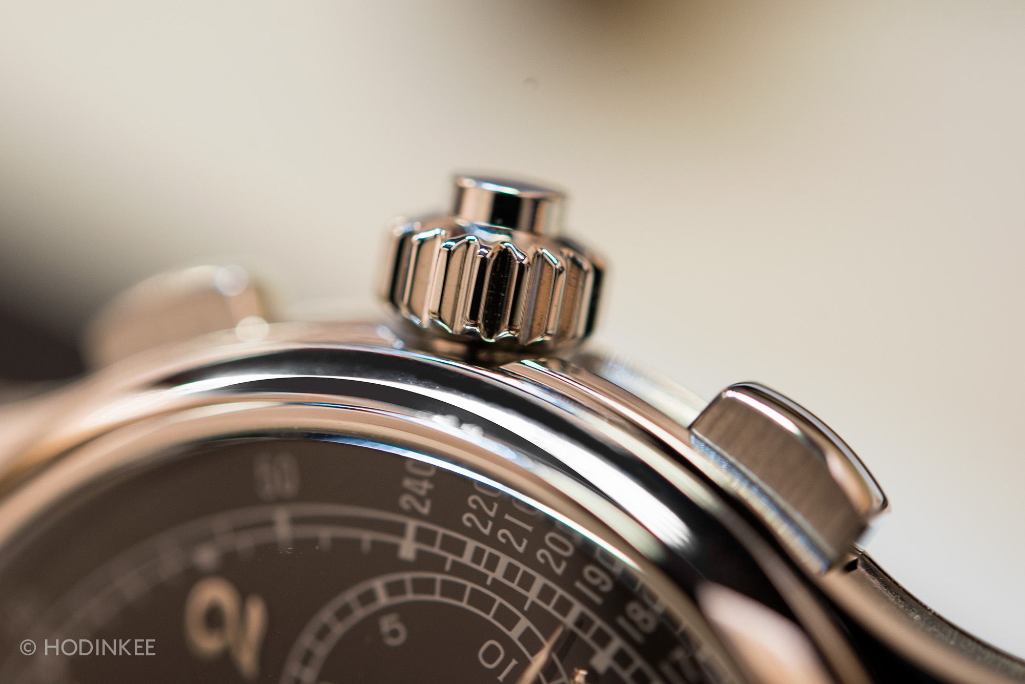 マクロ的に見ても5370Pが非常に特別なモデルであるのは、今日のパテックの最高技術を結集したからだ。 過去の技術の集大成である自社製の見事なキャリバー、伝統的なダイヤル(エナメル!)、そしてケースとリューズは1940年代のものを彷彿とさせる。パテックは、少なくとも1971年以降、2プッシュ式のスプリットセコンドを製造していなかったし、それまでは数年に1本以下のペースで特別な依頼を受けて作っていたにすぎない。私はRef.1563のことを言っているのではなく、むしろRef.1436について、実質的にスプリットモジュールを備えたRef.130について語っているのだ。ジャン-クロード・ビバー氏の個人的なコレクションに見られるような初期の例は、ラトラパンテを作動させる機能も兼ねたリューズを特徴としていたが、下に見られるような後期の例ではリューズの中にボタンが組み込まれていた。