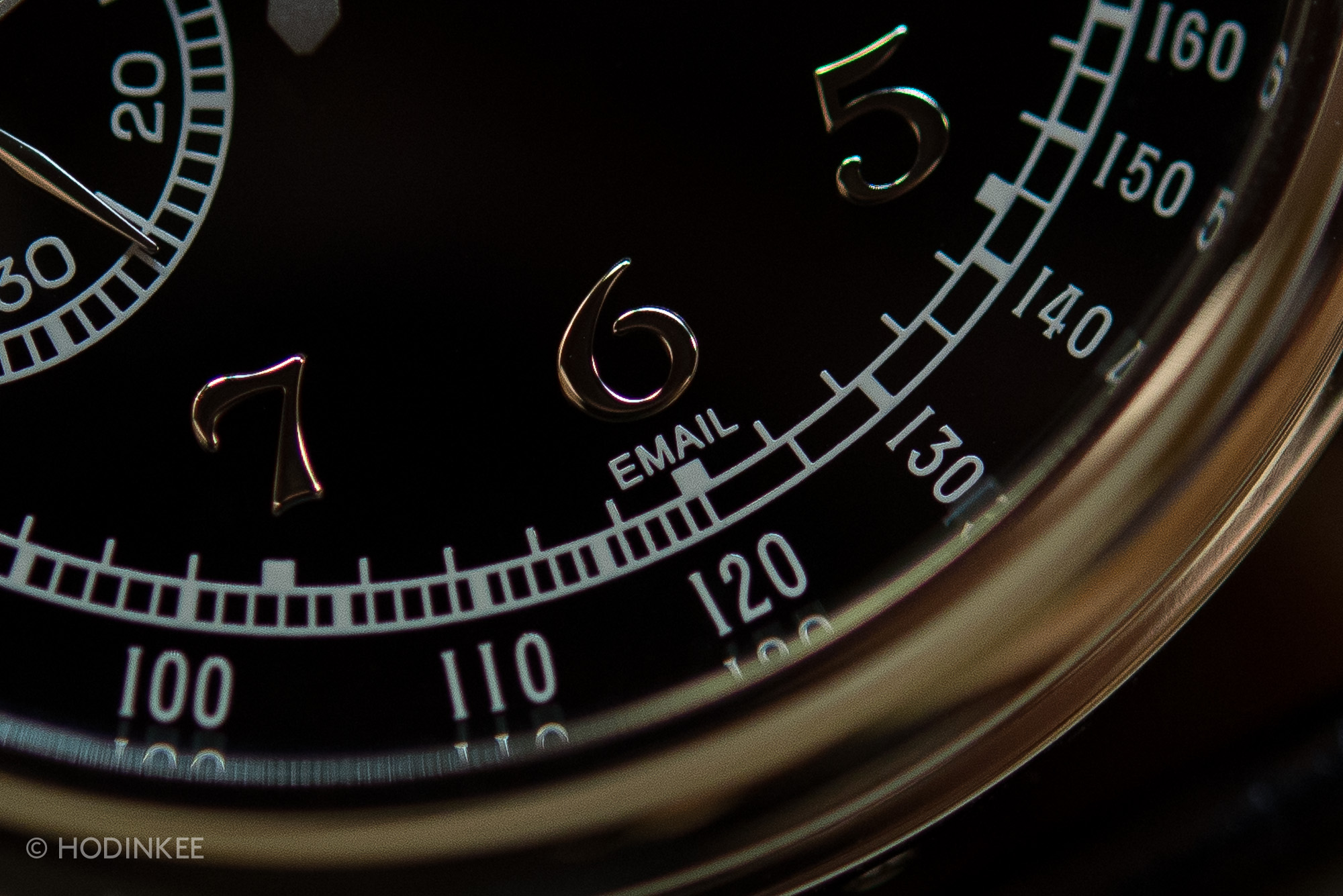 私がまだ触れていないことは、このダイヤルのバランス、美しさ、そして純粋な黒の色彩だ。5370Pは、ブレゲ数字をあしらった非常に素晴らしく、リッチなブラックエナメルダイヤルを備えている。このダイヤルはパテックによる自社製で、磨くだけで3時間以上もかかるという。ダイヤル素材には無垢のホワイトゴールドを用いており、850℃のオーブンで焼き上げ、制御された冷却方法によってガラスのような質感に凝固させる ― その結果、時間が経ってもあせない強い黒色が出来上がるのだ。6時位置の小さな“EMAIL”という単語(フランス語で“エナメル”の意味)は、この時計が非常に特別なものであることを示している。