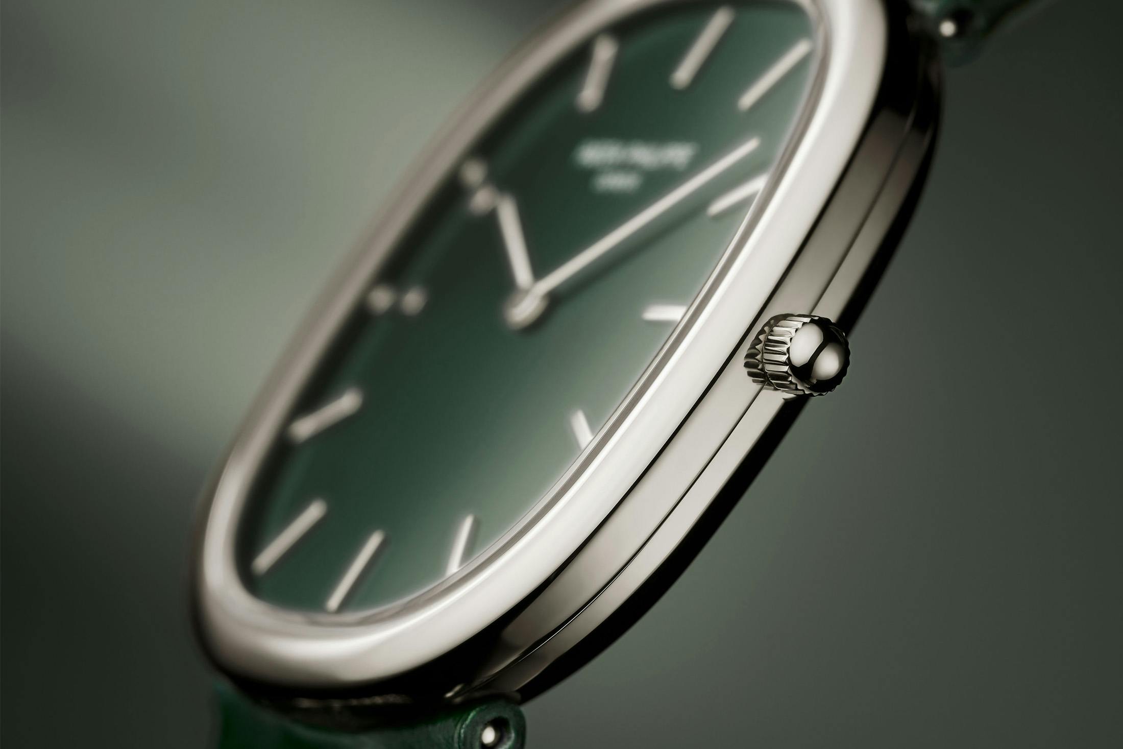 パテック フィリップは、ゴールデン・エリプスコレクションにふたつの新しいホワイトゴールド(WG)製のリファレンスを追加した。ひとつは大型の“ジャンボ”サイズ(34.5×39.5mm)のRef.5738G-001、もうひとつはより伝統的なプロポーションを備えたRef.3738の復活(31.1×35.6 mm)だ。両モデルとも、新しいサンバースト仕上げのオリーブグリーンダイヤルを特徴とし、黄金比に着想を得た調和の取れたプロポーションのホワイトゴールドケースに収められている。WG製のバトン型アプライドインデックスと細身の針は、1968年の登場以来変わらないエリプスのデザイン言語を継承している。両モデルともきわめて薄く、厚さは6mm弱だ。