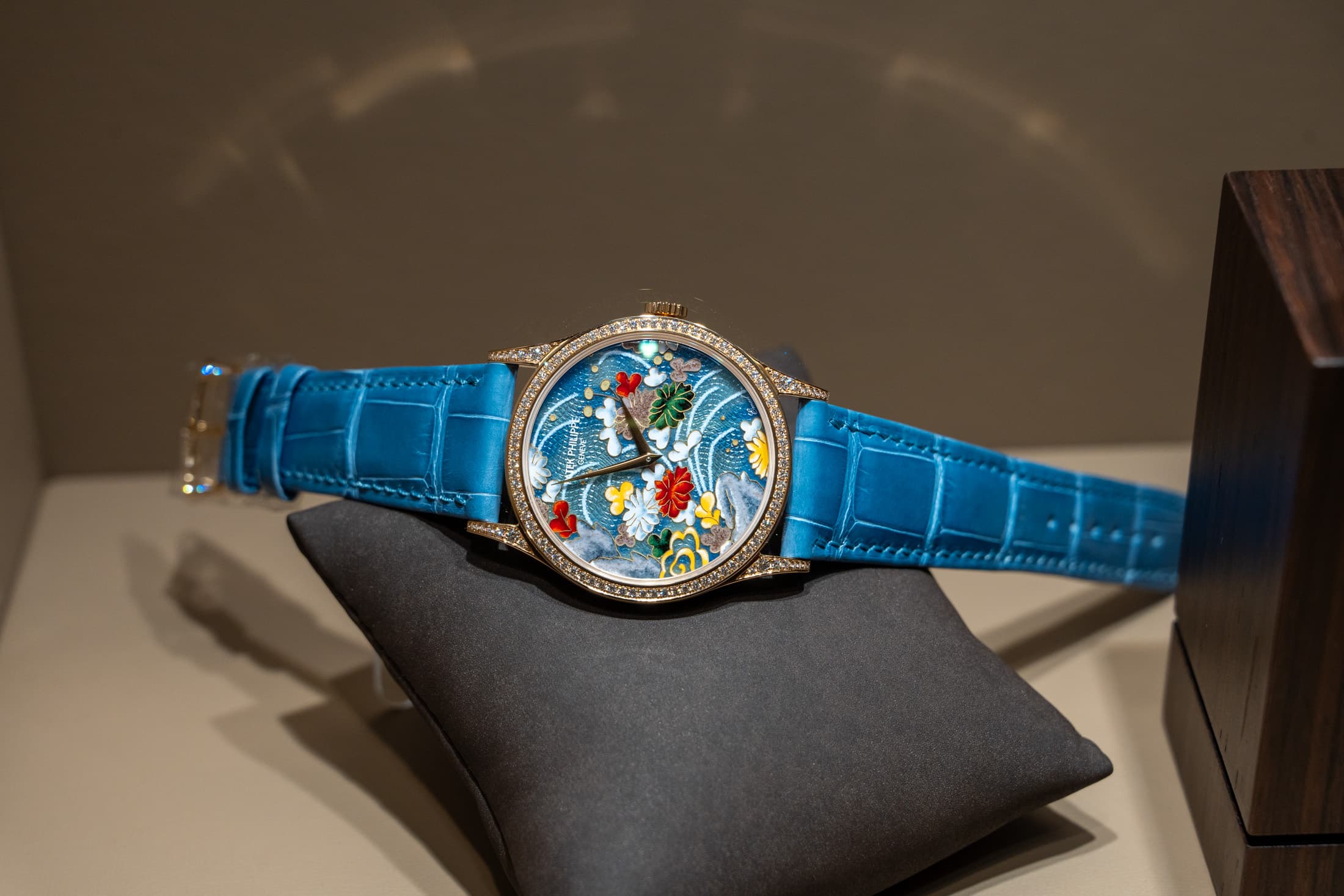 ハンドギヨシェとクロワゾネエナメルのダイヤルが特徴的な10本限定のカラトラバ 5077/100R-057《花柄の着物》。