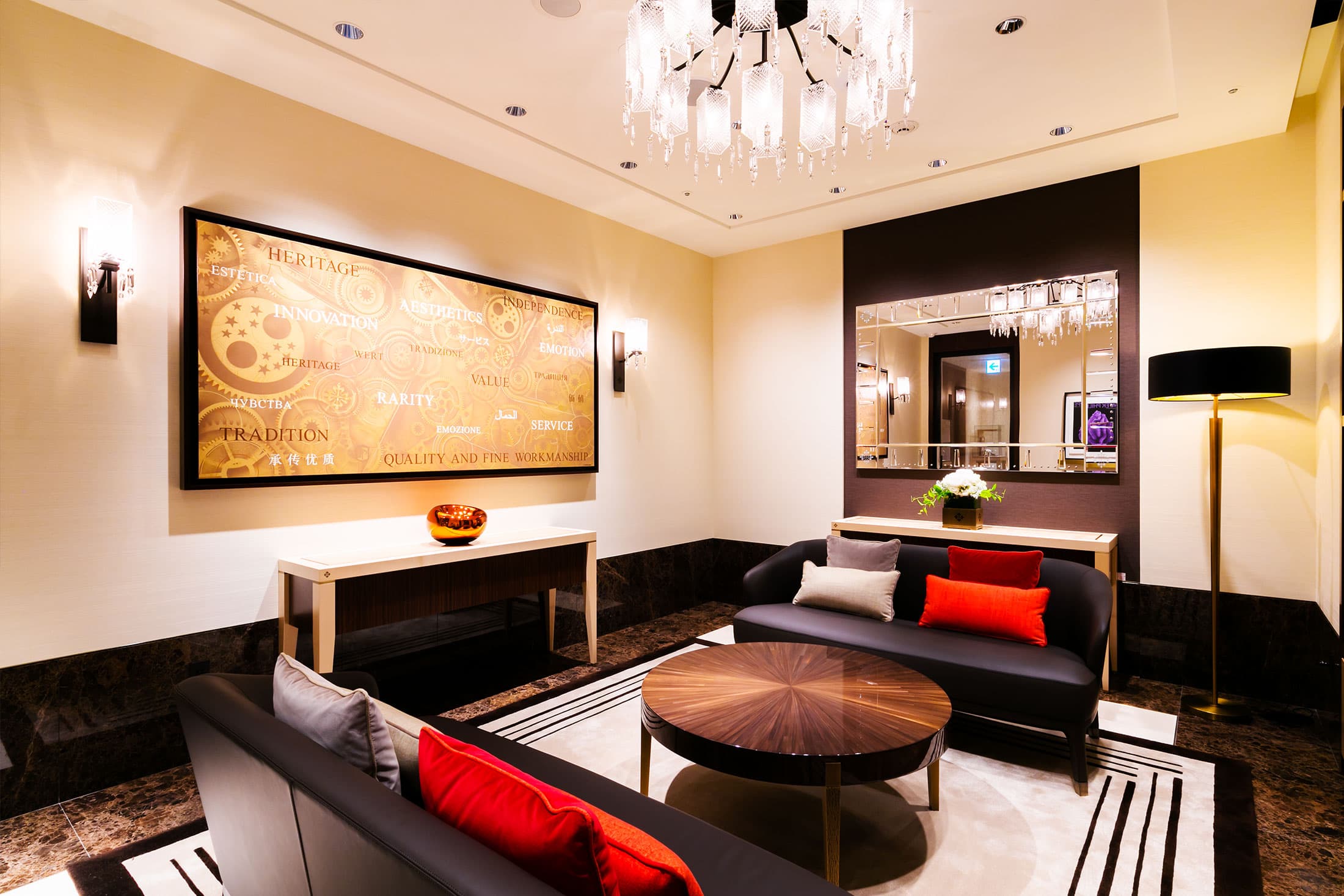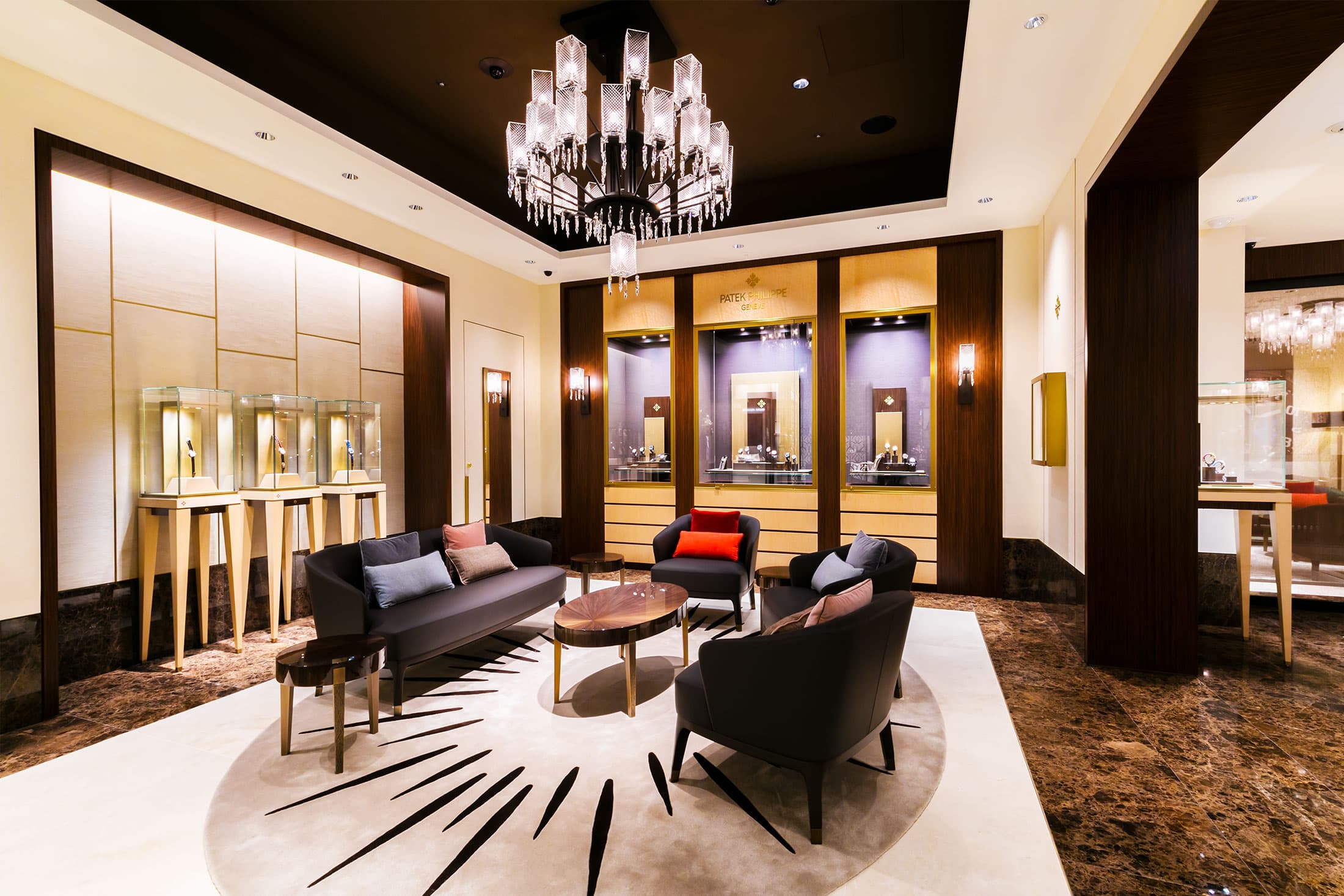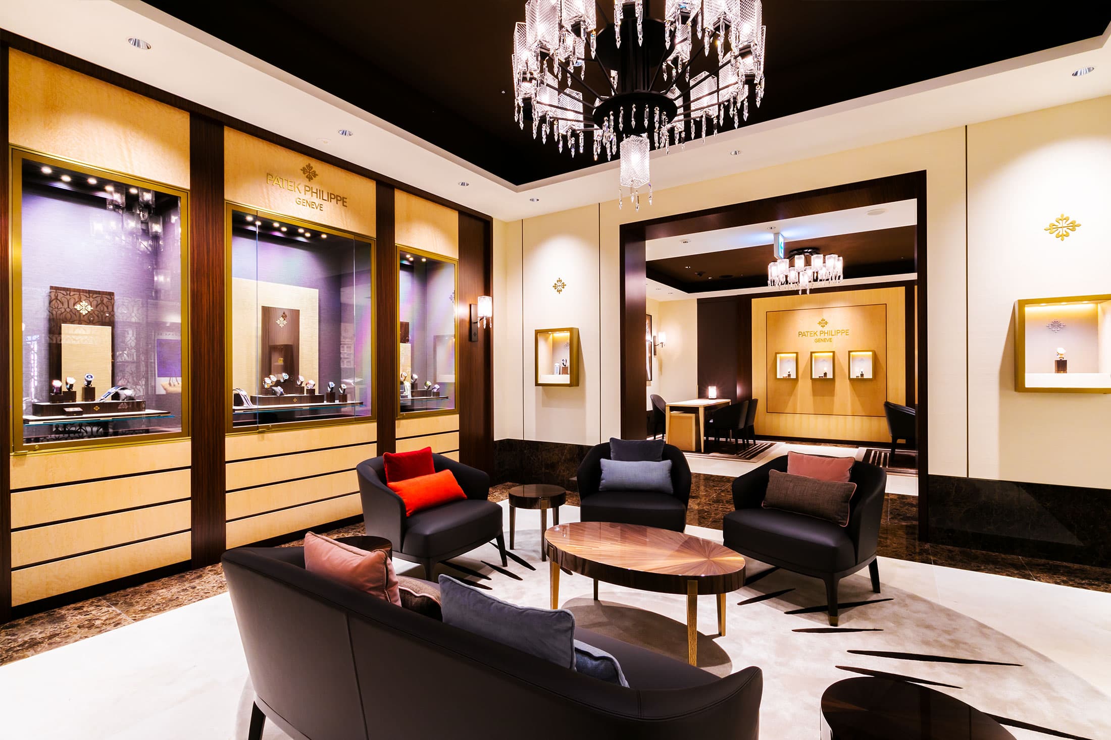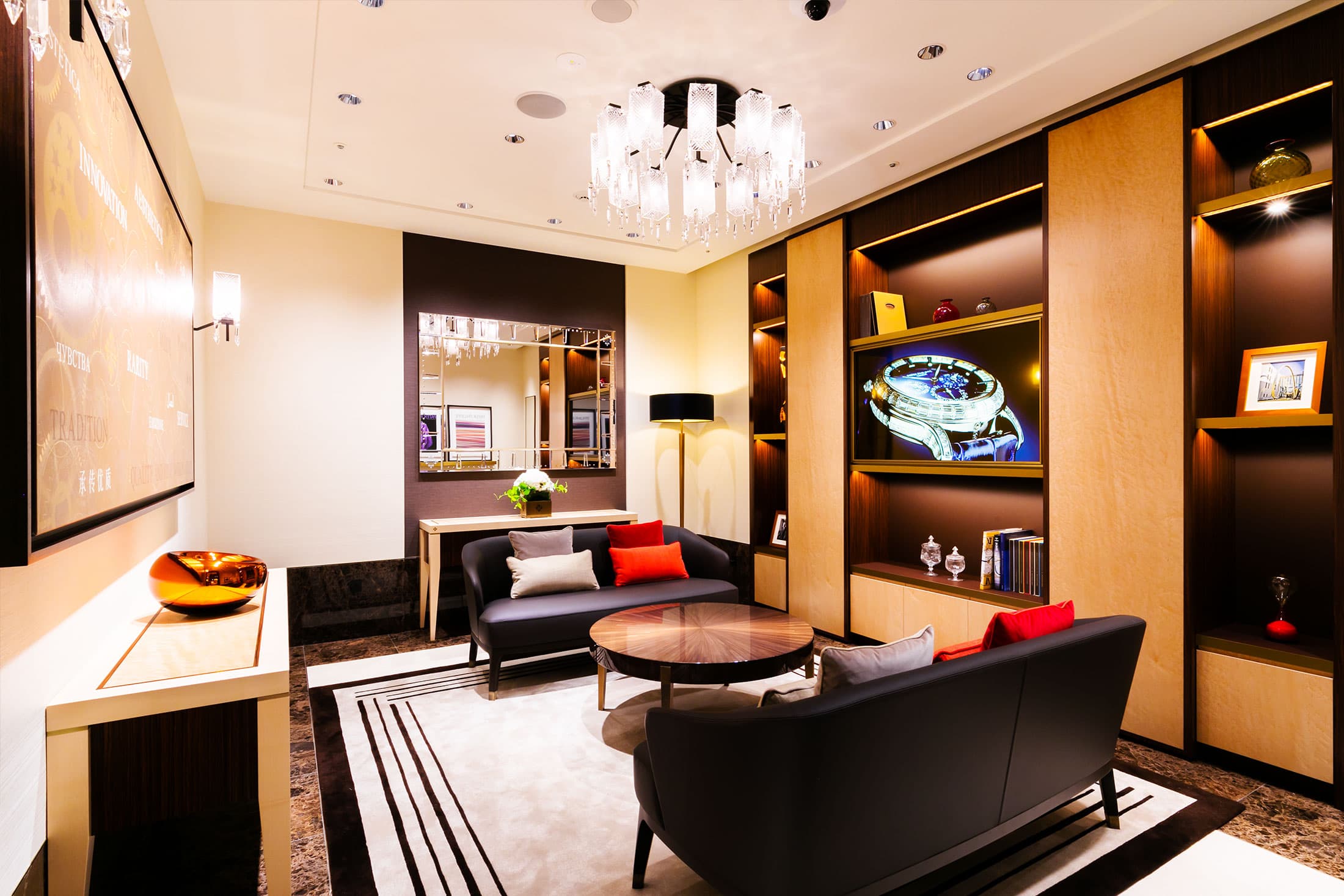 ラウンジ・スペースは、ソファを取り囲むように壁にショーケースが並べられたスタイルで、ジュネーブ本店サロンのインテリアコンセプトが世界で初めて引き継がれるなど、同ブランドの世界観を存分に堪能できるようになっています。