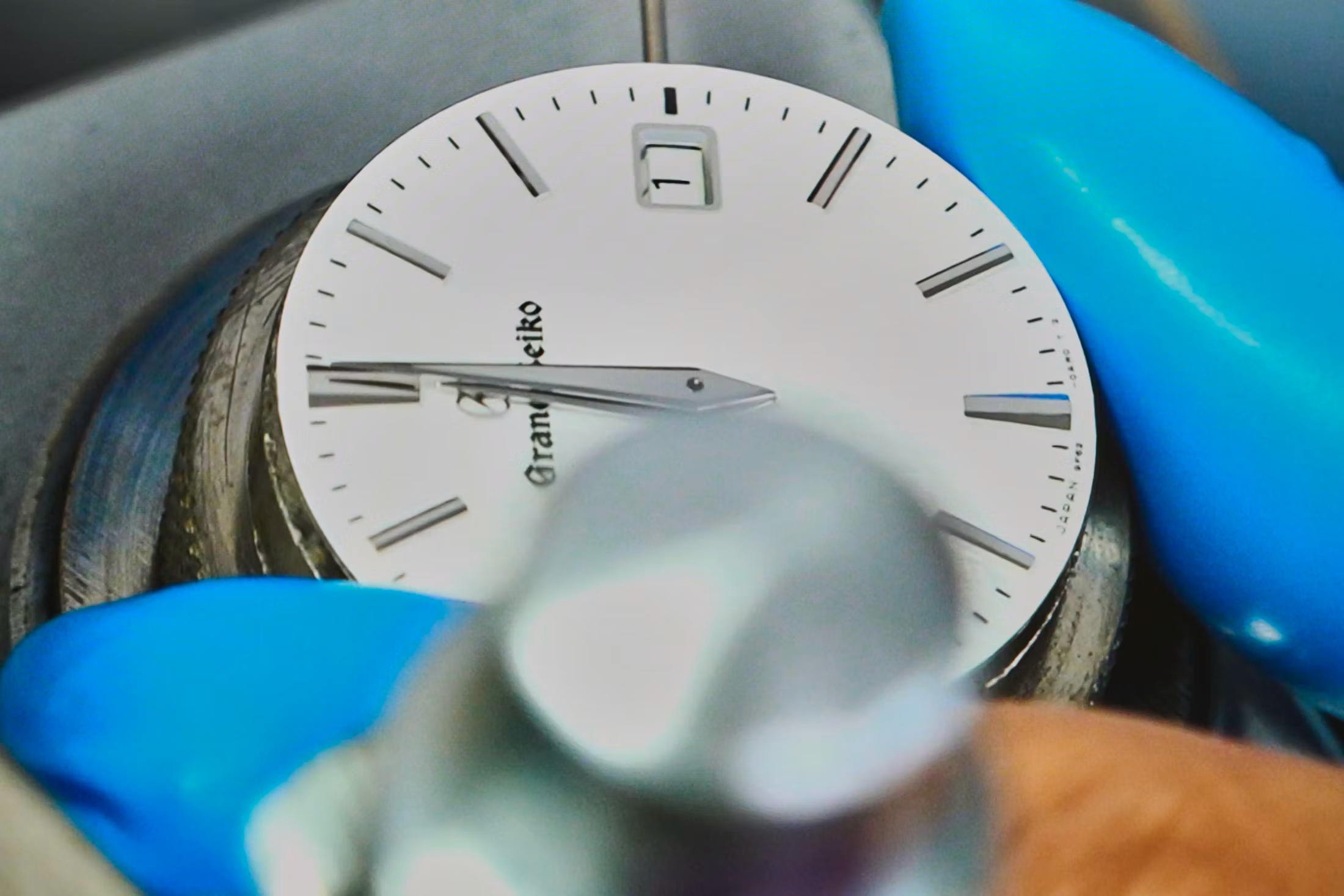 見学では、インデックスが所定の位置にセットされる様子なども紹介された。顕微鏡で見ないと分からないほど小さな穴がダイヤルに開いている。この穴の位置を間違えると、ダイヤルに傷がついて使えなくなってしまう。また、針がどのようにブルーに変わるのかにも魅了された。グランドセイコーの秒針の青い色合いが熱処理によるものだということは知っていたが、それが直火で炙る類ではないとは考えもしなかった。熟練した職人が発熱体の上に置かれた小さなプレートの上に針を置くのだ。彼は3本ほどの針を順番に、ほどよいタイミングで外していくのだが、色の変化を実際に確認することができる。