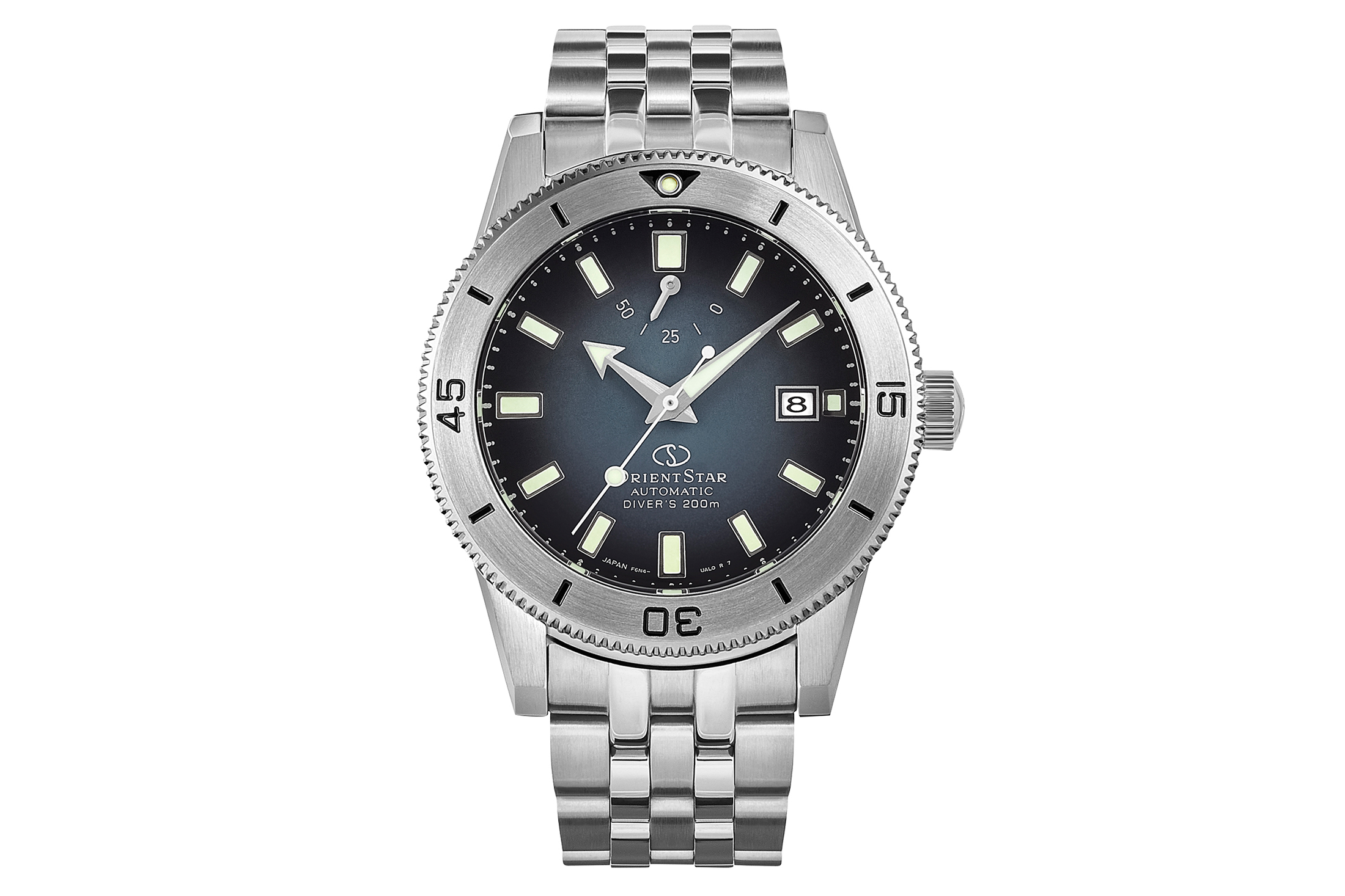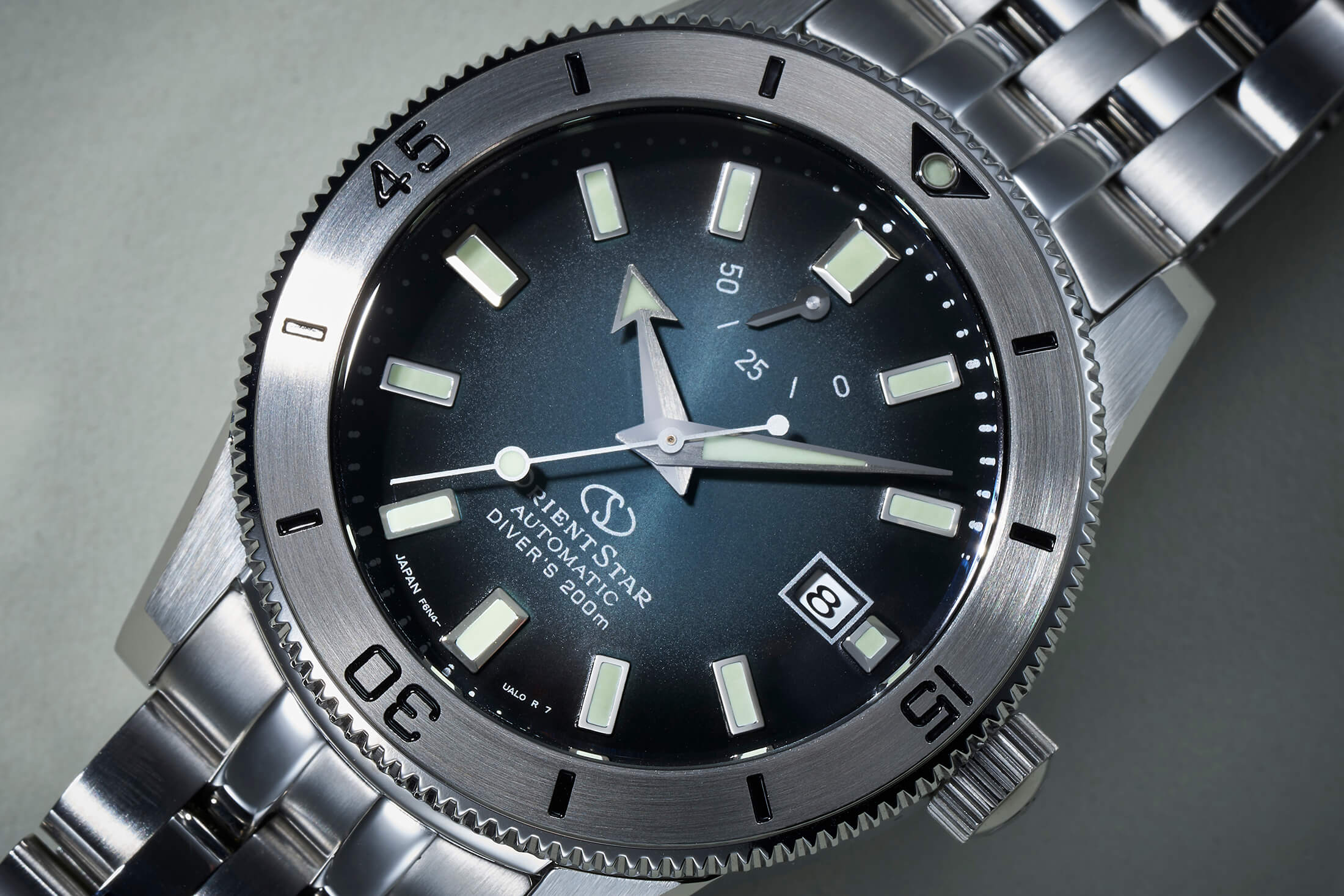 水深200mに耐える潜水用防水性能を備え、幅広のベゼルや両球面サファイアクリスタルガラス風防によるヴィンテージな外観、そして50時間以上のパワーリザーブを誇る自動巻きCal.F6N47の搭載など、基本スペックは2021年に初めて発売されたブラックダイヤル、そして2023年に投入されたシルバーダイヤルと変わらない。最大の特徴は、本作で初めて採用されたグラデーションダイヤルだ。これは夜空に輝く星の輝きを受けて変化する海面の表情をイメージした表現だといい、既存のブラックやシルバーとはひと味異なり、中央部のブルーグレーから外周に向けてブラックへとトーンが徐々に暗く変化するグラデーション加工が施されたことで、神秘的かつエレガントなニュアンスを醸し出している。ツールウォッチであるダイバーズとしては珍しい表現だろう。