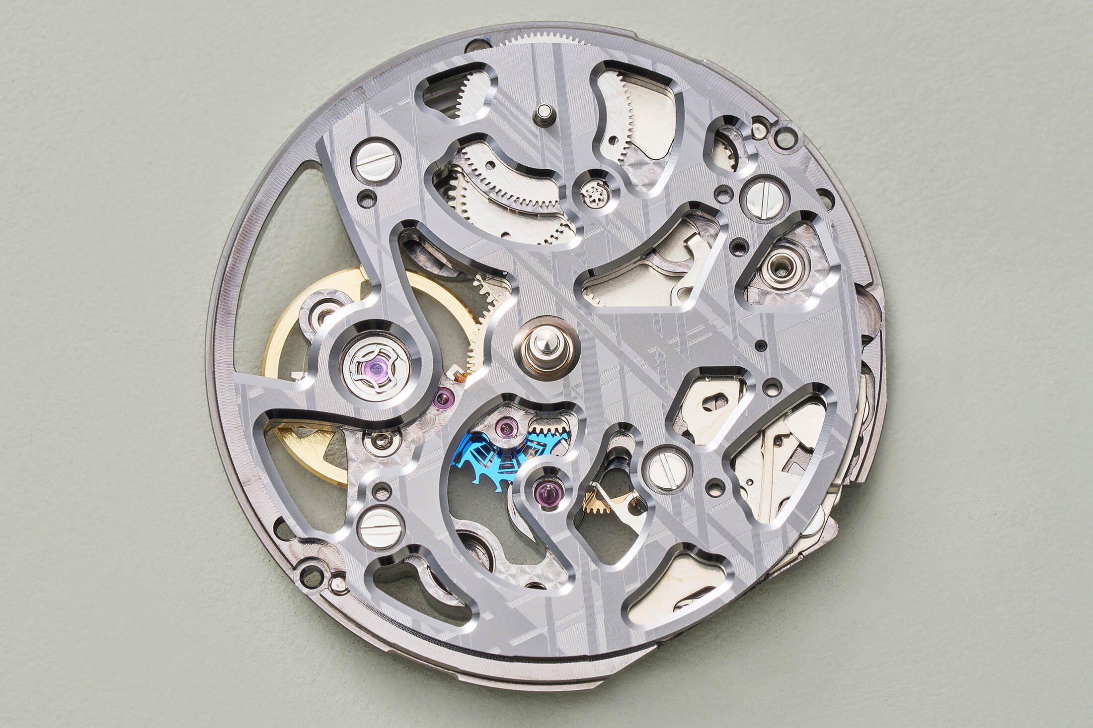 基本スペックはCal.F8B61を搭載した既存モデルと変わらないが、異なるのは新たな仕上げに挑んだCal.F8B65の採用だ。ダイヤル側と裏蓋側の両面に最新のレーザー加工でメテオライト(隕石)調の仕上げを施す。彗星の尾をモチーフとしたテンプ受け、天の川銀河の渦巻に着想を得たシリコン製ガンギ車などに加え、隕石のような精緻な結晶模様により、さらに宇宙へのロマンをかき立てる表現とした。