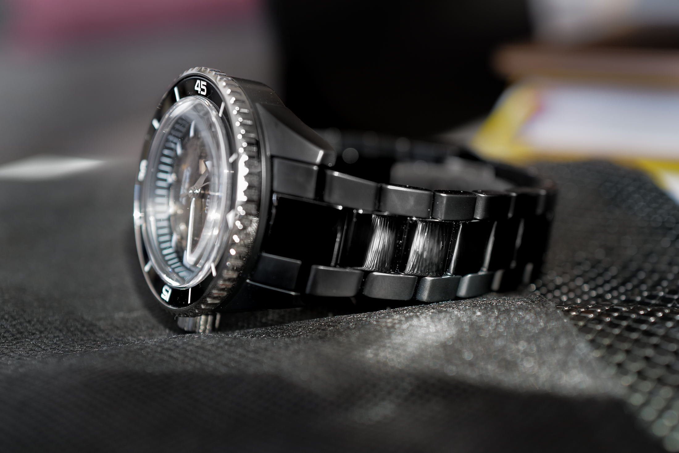 ケースと同様に、ブレスレットもセラミック製で、様々な仕上げが施されている。外側のリンクはマット仕上げでケースにマッチし、内側のリンクは光沢のあるブラックで、同じくポリッシュベゼルにマッチしている。実際にシャープな印象ながら、指紋には注意したい。ブティックでこの時計を手にするとき、手袋をはめろとは言わないが、そうしたくなるかもしれない。