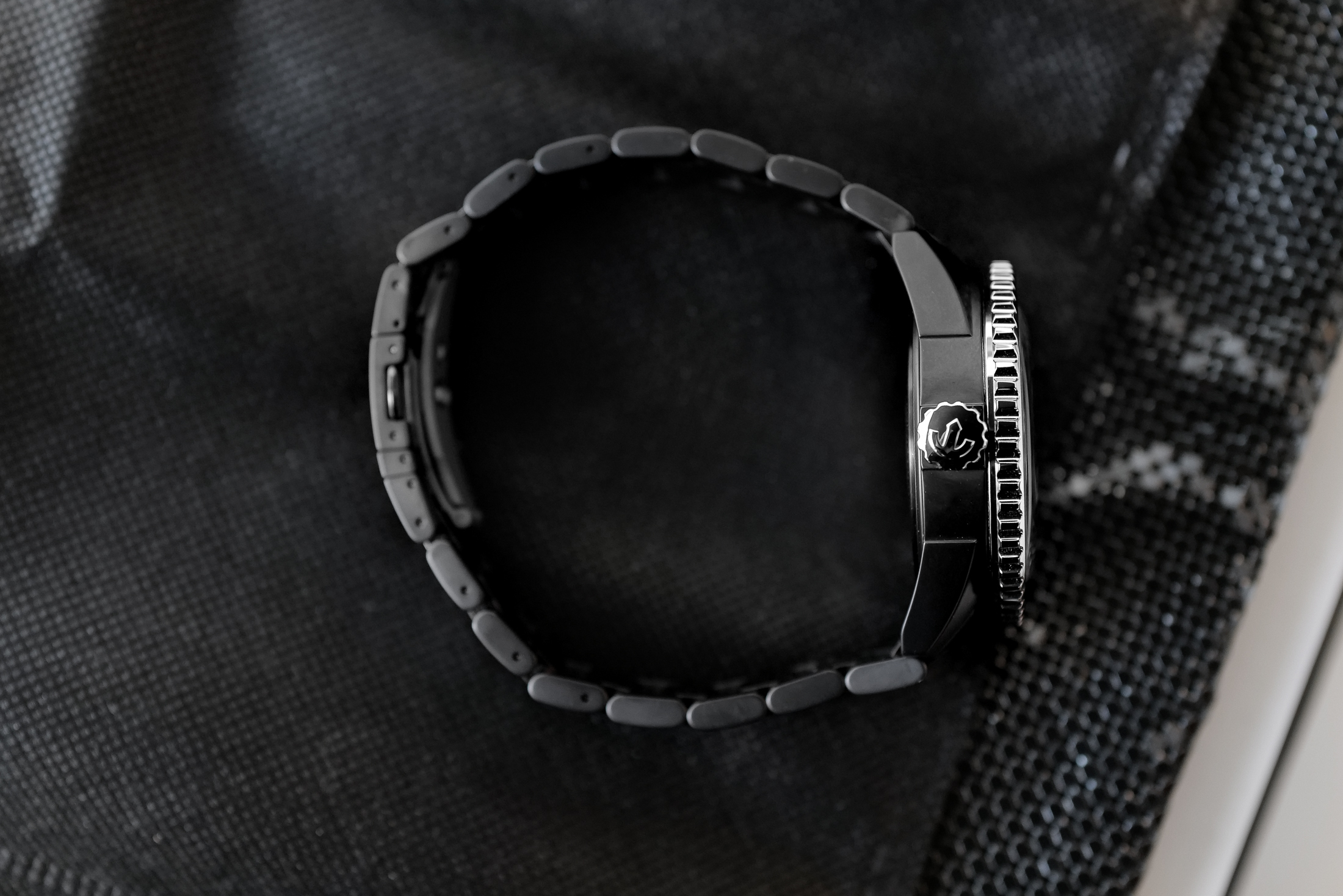 いくつかの主要部品はセラミック製ではない。上の写真のように、リューズとコインエッジの回転ベゼルはSS製で、ブラックアウトされた外観にさらなるコントラストを加えている。ケースバックはチタン製で、文字盤に使用されているのと同じ色合いのサファイアが用いられている。