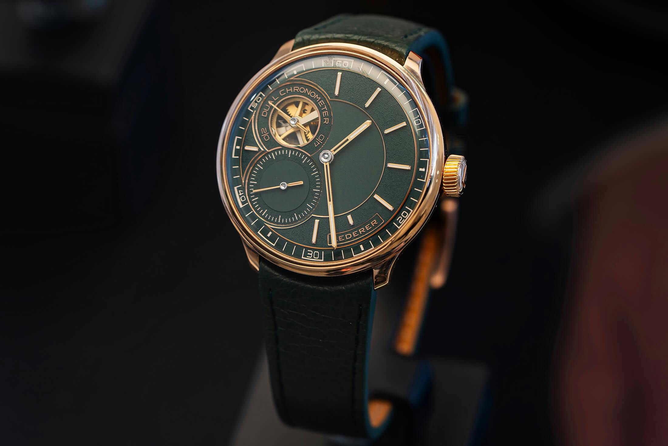レデラーのCIC 39 レーシンググリーン。機能としては前述のCIC 39 ロンジチュードやCIC 39 インヴェルトと同様。レデラー氏のこの作品は第2回のルイ・ヴィトン ウォッチ プライズ フォー インディペンデント クリエイティブズのファイナリストに選ばれた。
