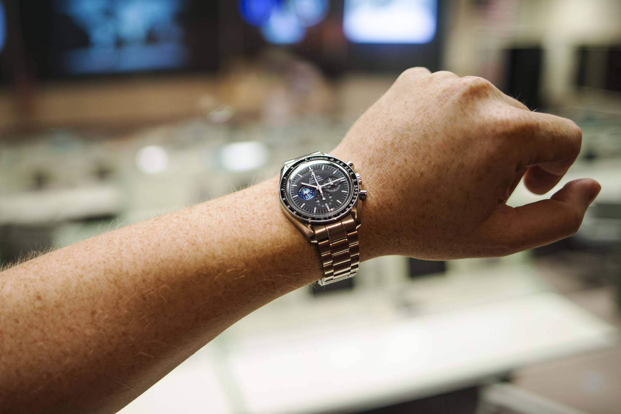 ヒューストンを訪れている間、我々はNASAの施設も見学させてもらった。その中には、フライトディレクターのジーン・クランツ氏とそのサポートクルーがアポロ13号のミッションの最中、“自宅”と称したミッション管制室も含まれている。我々は、新しい月面探査車、訓練中の宇宙飛行士、そして初めて人類を火星へといざなう宇宙船、オリオンも見た。ミッション管制塔の底部にはスピードマスターを収めるケースが置かれており、それぞれの時計は、22回のミッションの異なるミッションパッチを伴っている。1997年、スピードマスターの誕生50周年を記念して、22本(と1957年の類似の製品)の全てが入ったケースが発売された。残念ながら、50ケースしか作られなかった。一般市場には滅多に出回らないが、市場に出たにときは、6ケタ(10万ドル以上)もの値を付けている。