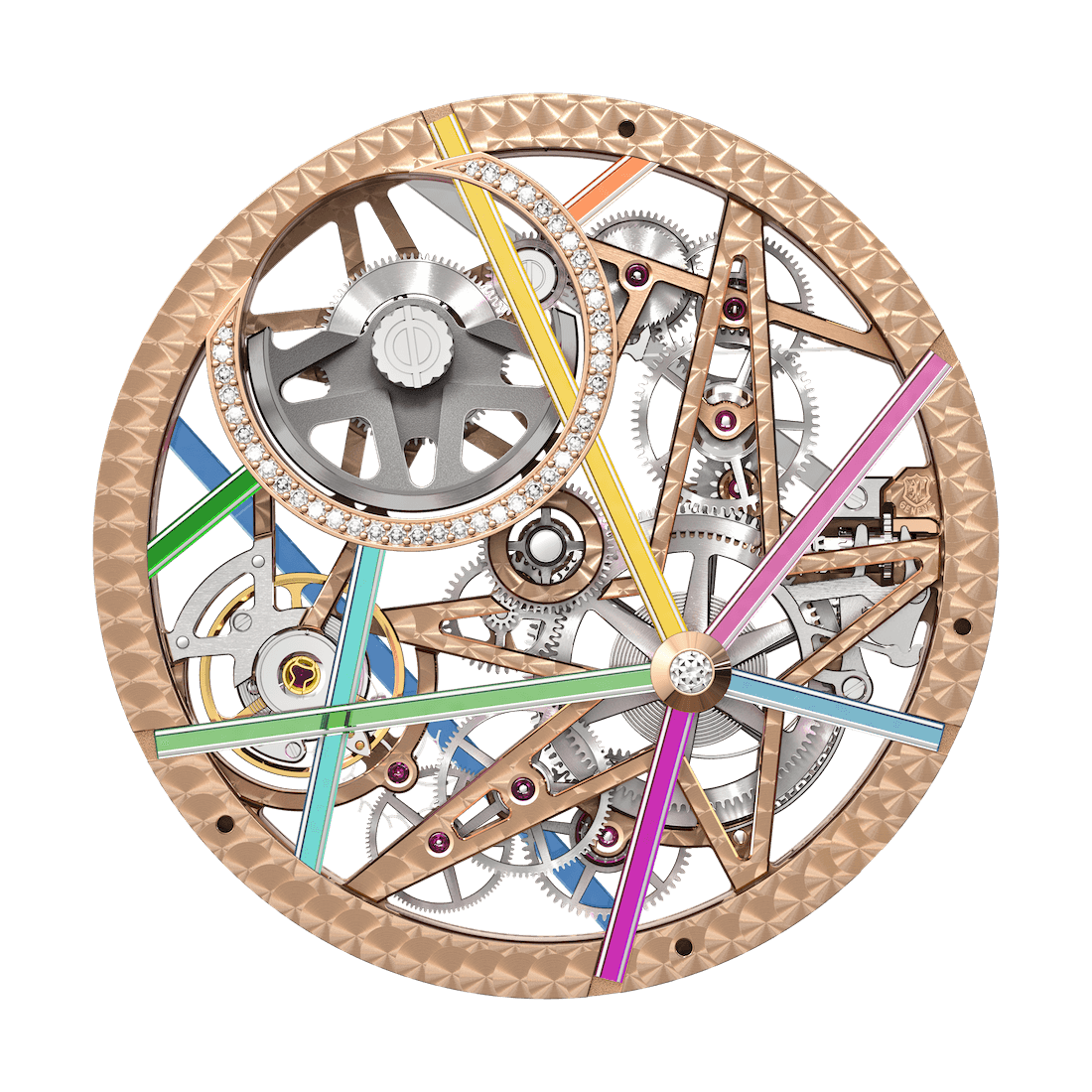 僕は本機を実際に見たが、単純に心をワクワクさせてくれる仕上がりとなっていた。ジュネーブ・シールを取得したロジェの時計のムーブメントはまさにため息ものなのだが、それを惜しげもなくキャンバスとしてちょっとどころではない遊び心を付加するのはただ事ではない。