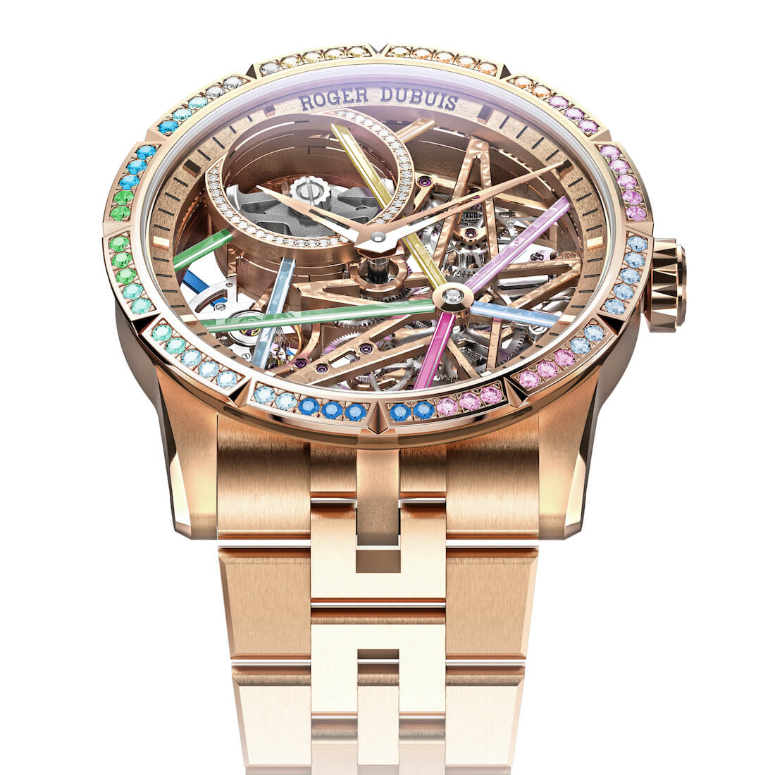 ロジェ・デュブイ関係者の話によると、エクスカリバーの前面に配されている星型のブリッジは、既に構造としては無くても成立するものらしい(かつては強度や構造の面から必要だった)。しかしそれを残し続けるのは、もはやこの時計にとってのアイコンとなっており、ブランドを象徴するデザインだからだろう。そしてこのブラックライトのためのカラーサファイアチューブの装飾は、デザイン以上のなにものでもない。腕時計が、より個性やライフスタイルを代弁する存在になっている以上、このような"無用の用"が重宝されるのは強い流れとなるだろうし、ロジェ・デュブイはまさにそれを実践しているといえる。
