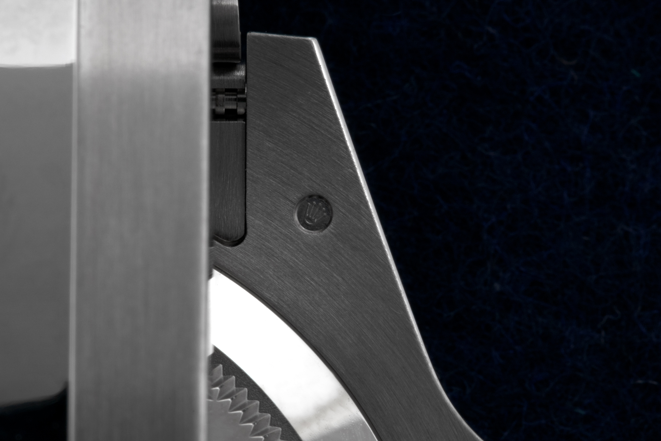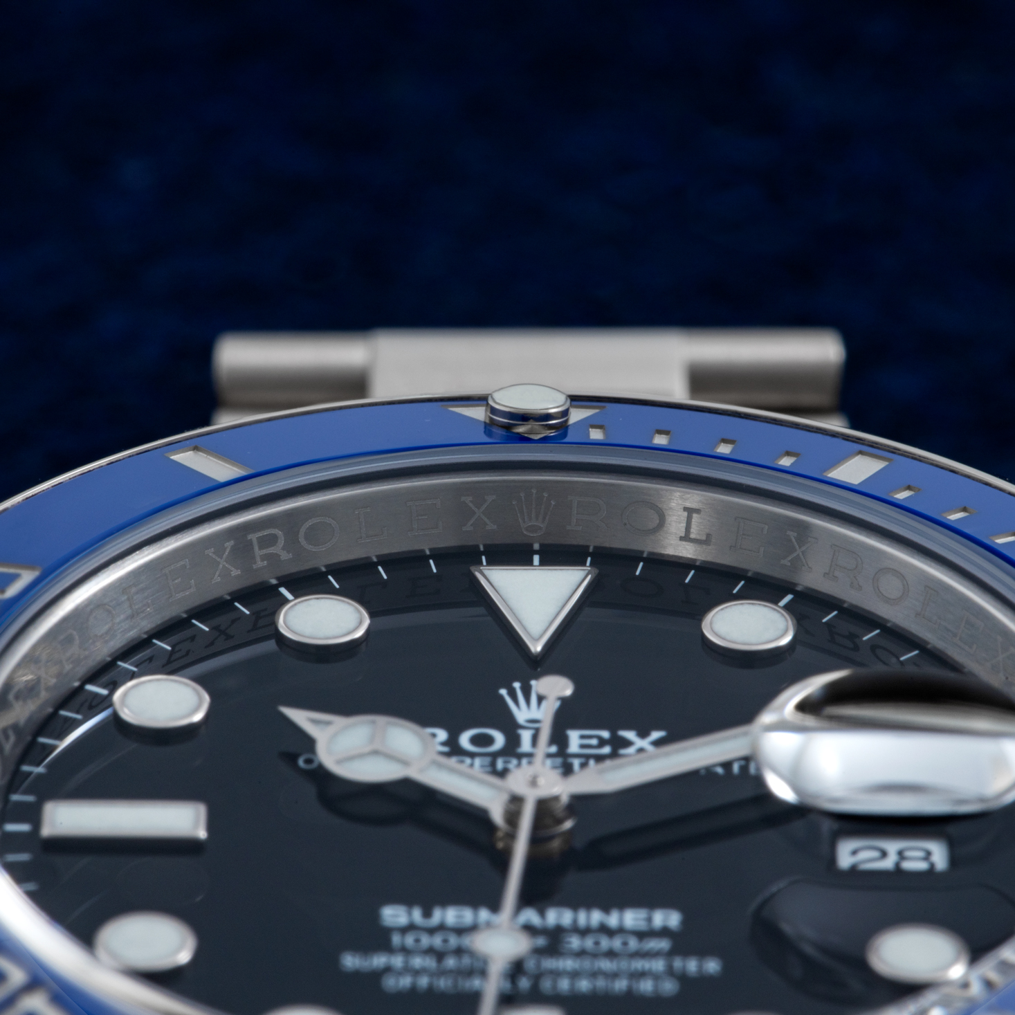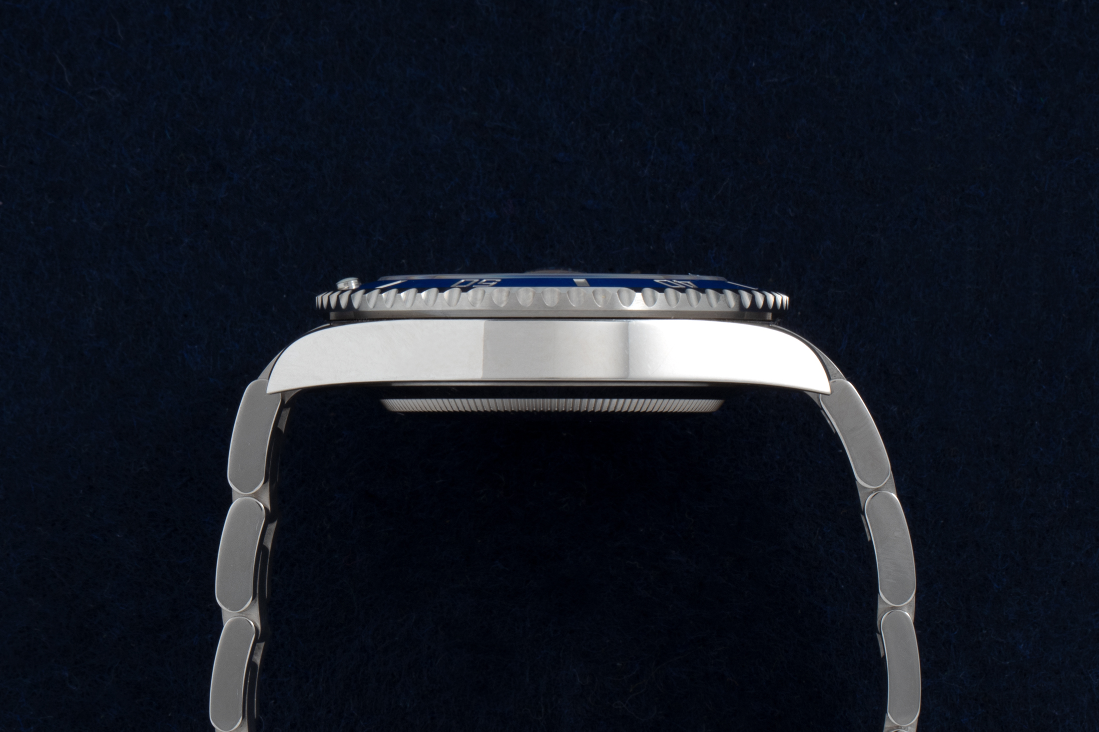 わずかにスリムになったラグの下側にある刻印は、本機が18ctホワイトゴールド製であることを教えてくれるが、私はブルーベゼルのサブマリーナーに慣れていない多くの新参者は、おそらくそれがステンレスで作られていると誤解すると予測する。私の中では、これは元祖ホワイトゴールドモデルである、オイスターブレスレットを纏ったペプシGMTがブラックダイヤルでデビューしたとき以来となる、控えめなロレックスの貴金属製スポーツウォッチである。