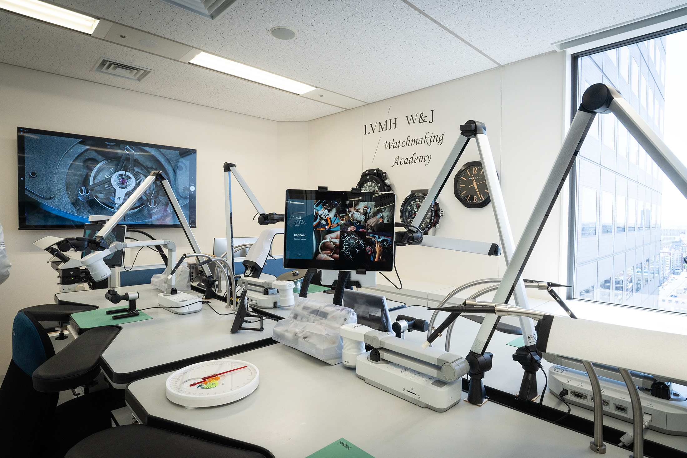 開校の舞台となったのは、東京・東陽町にあるLVMHカスタマーサービスセンター。2016年開設の同施設には、自然光が差し込む開放的なワークスペースが広がり、60名を超える技術スタッフが働いている。ここにあるのは“会社のなかにある学校”。働く現場のすぐ隣で、学びの時間が流れている。開校から半年間は座学と実習を行いながら、その後はクォーツからシンプルな自動巻きムーブメント、そして最終的には複雑なクロノグラフに至るまで段階的に構造を理解し、手を動かして覚えていく。目の前のムーブメントと格闘するうちに、彼らは少しずつ職人になっていくのだ。