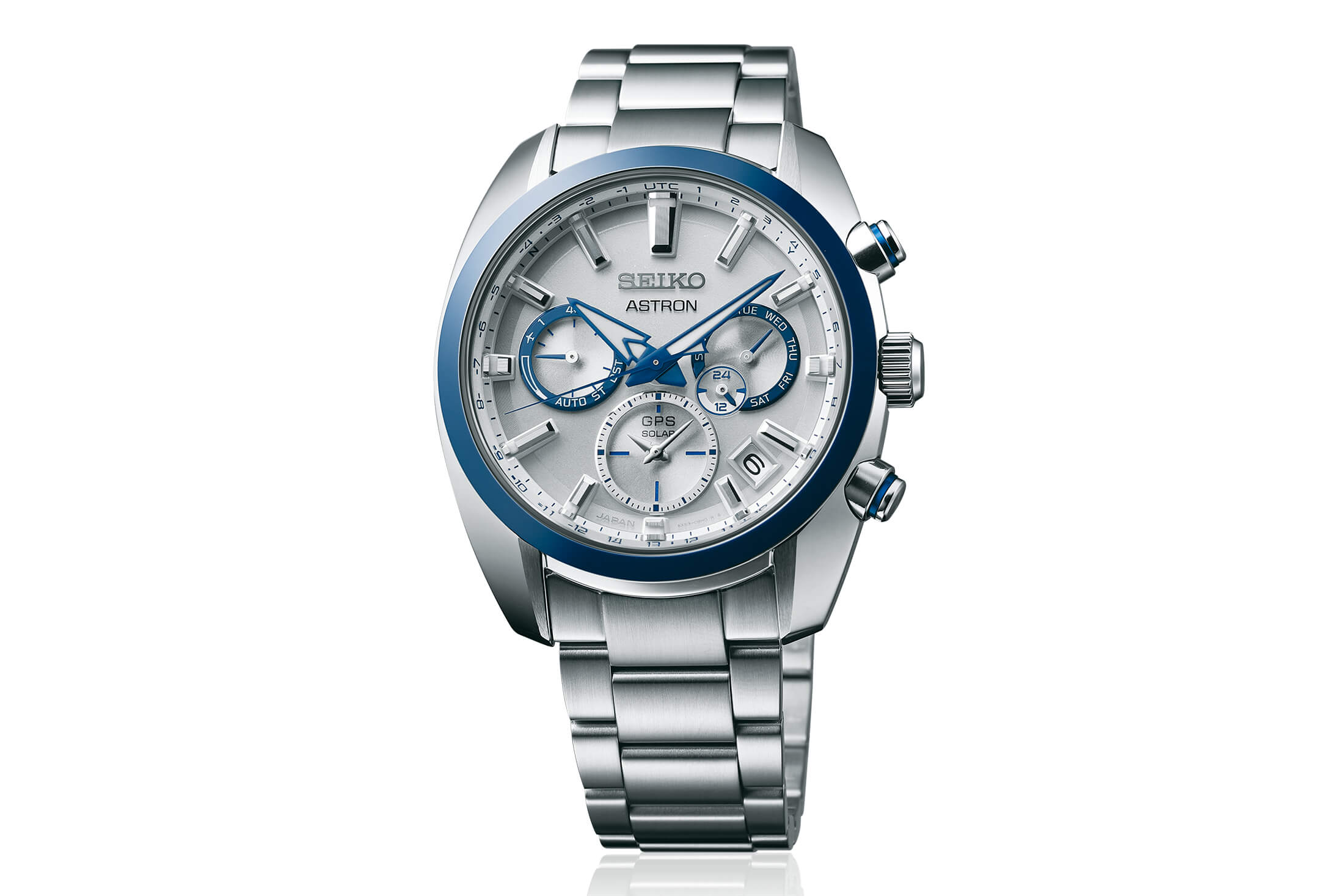 GPSソーラー機能を搭載したセイコー アストロンのSBXC093。深みのある美しいブルーを実現したベゼルは、耐傷性に優れるセラミック製である。