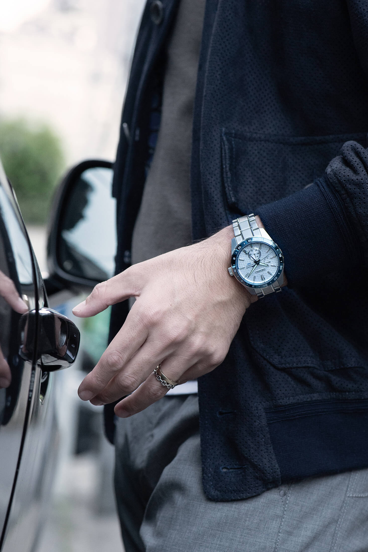 <セイコー プレザージュ>ブルゾン19万8000円/ヤコブ コーエン(ヤコブ コーエン 東京ミッドタウン店☎︎03-3405-0852)、ニット8万2500円/ムーレー、パンツ5万3900円/カナーリ(全てコロネット☎︎03-5216-6521)