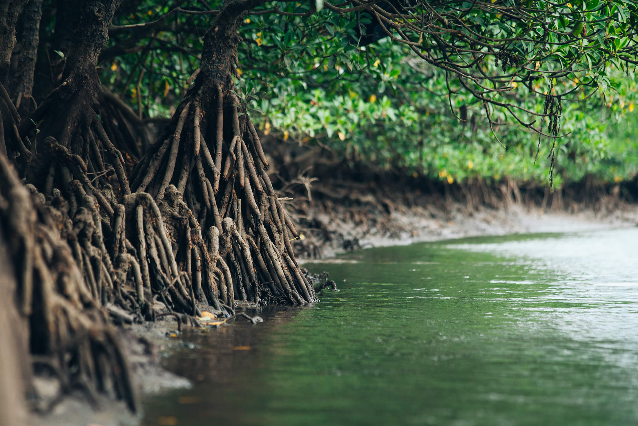 西表島のマングローブ林。島の面積の約90%が亜熱帯の自然林で覆われており、山奥から流れ出す河川の下流には広大なマングローブ林が形成されている。