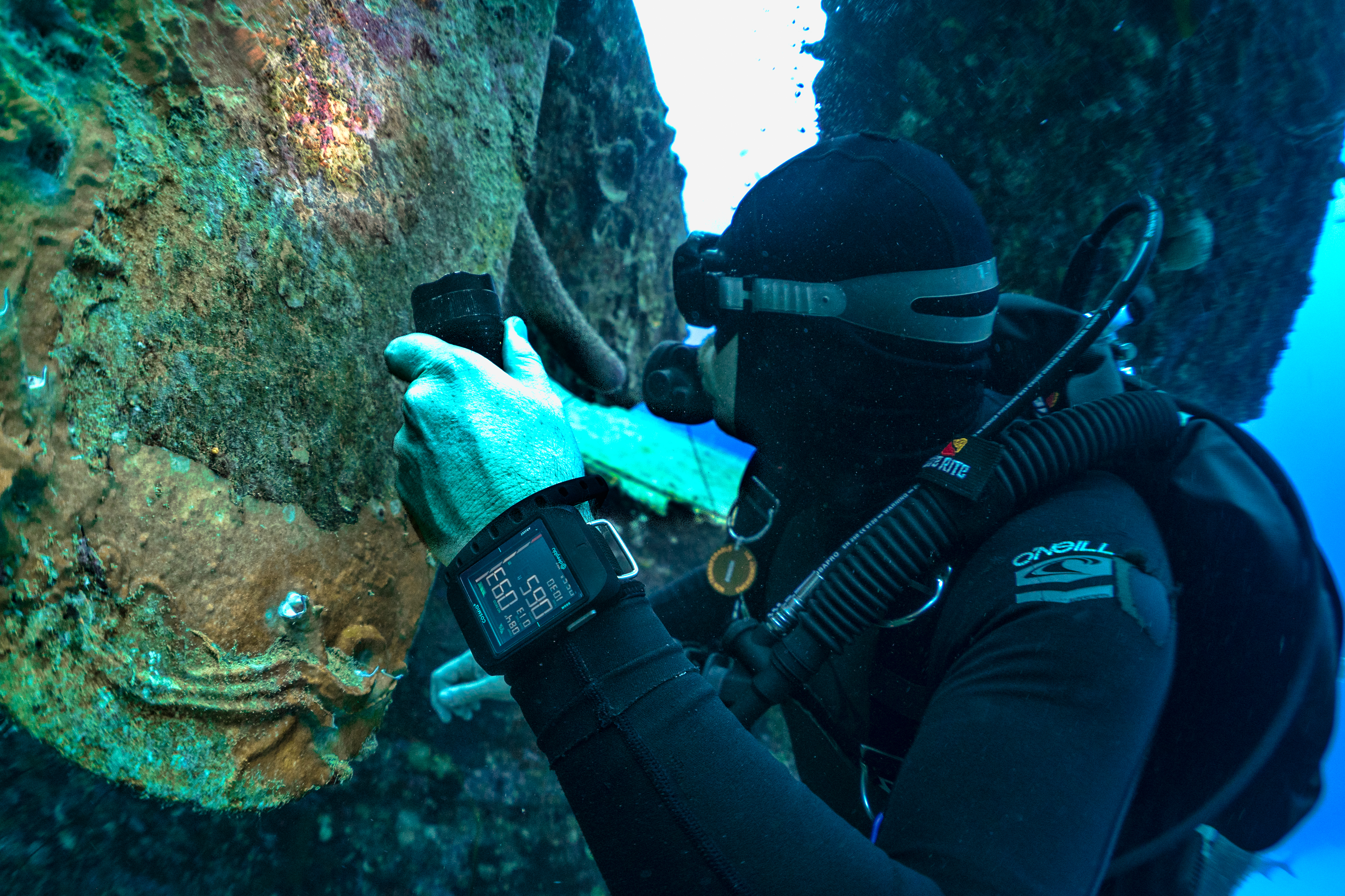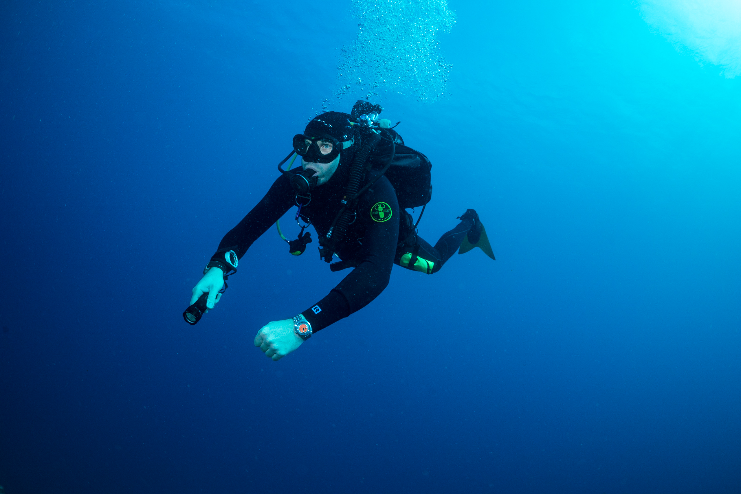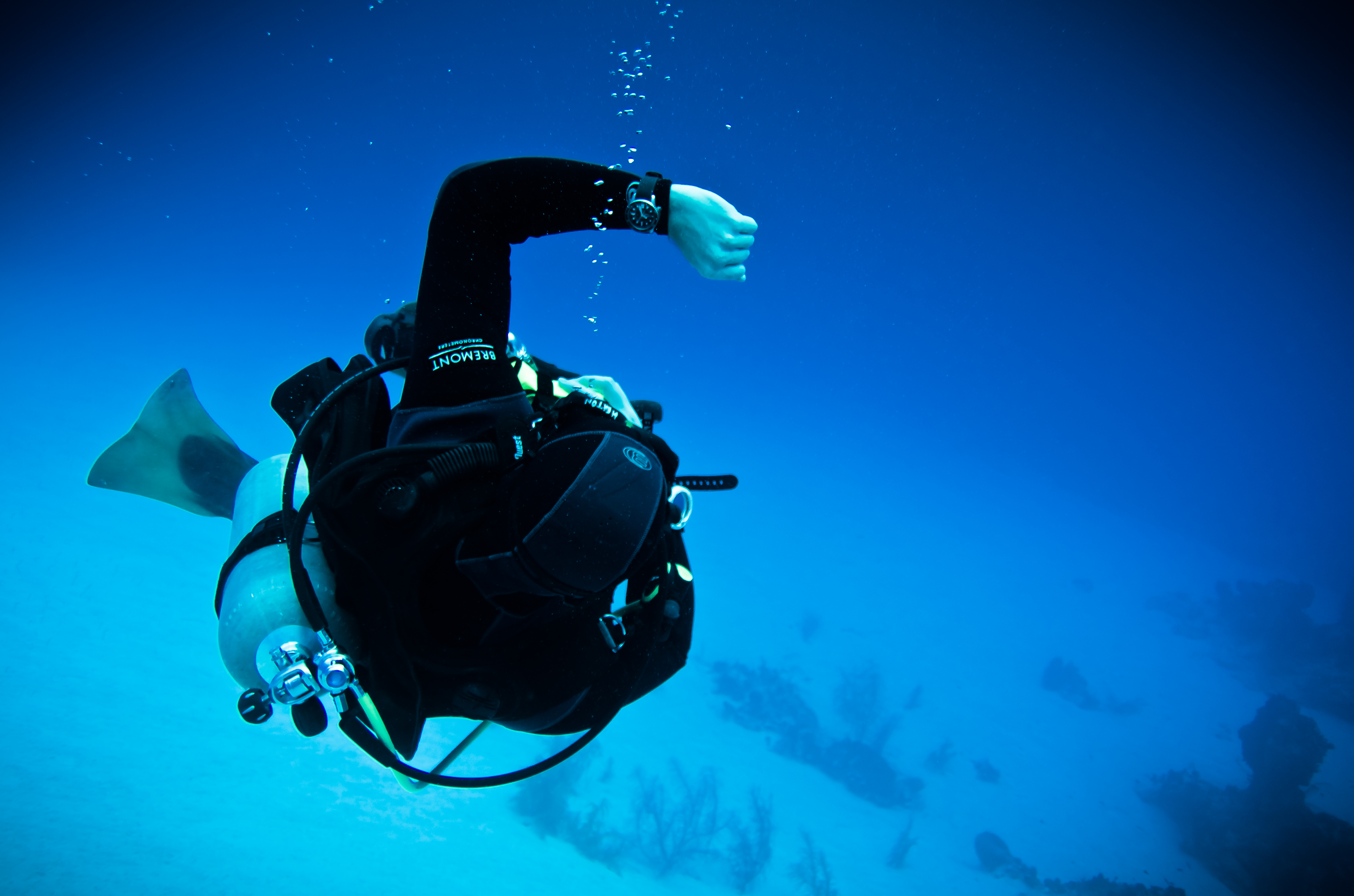 著者はダイブコンピュータを着けているが、反対の手首にはいつもダイバーズウォッチを着けている。